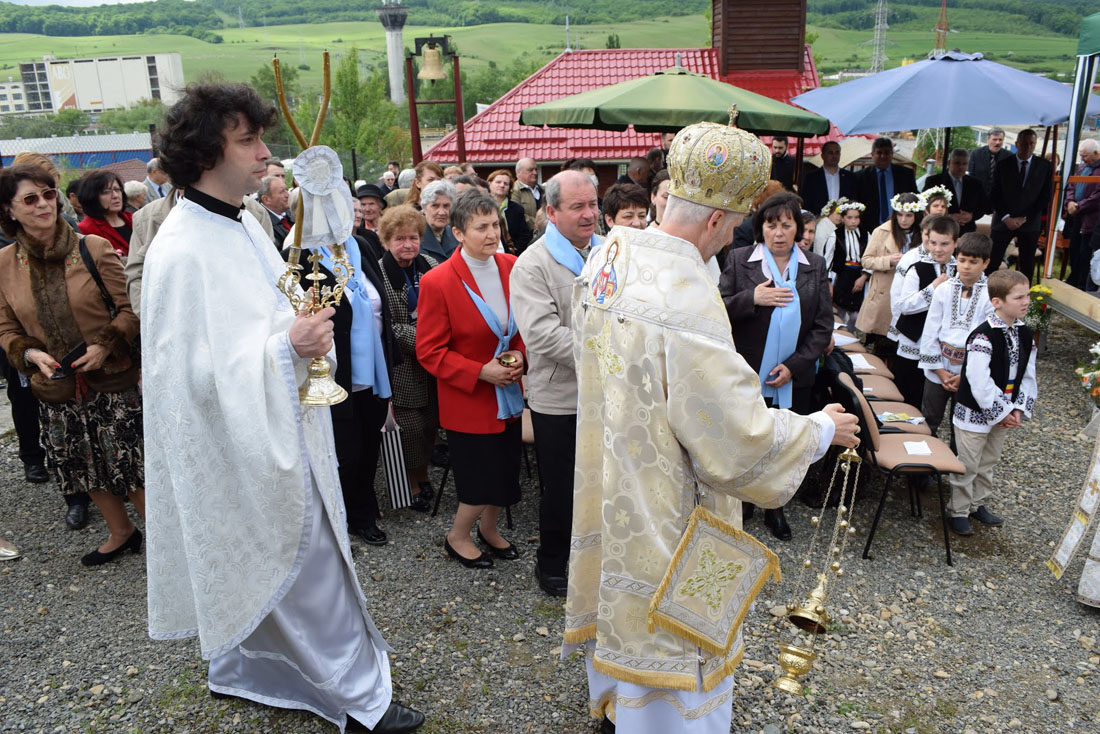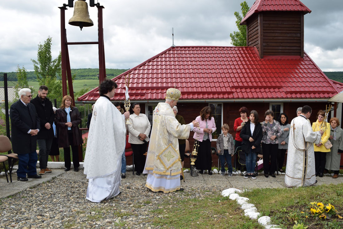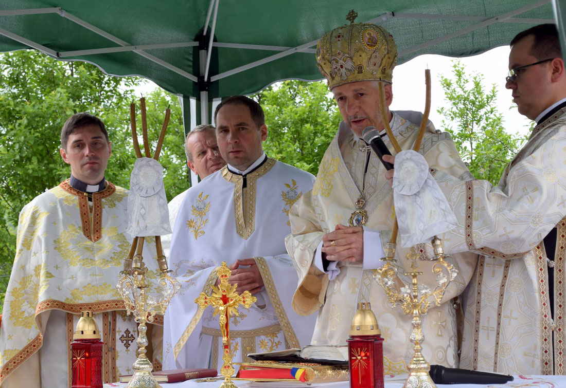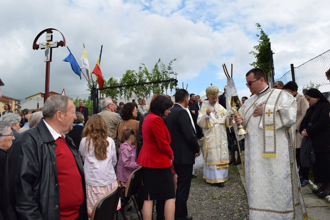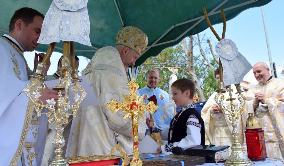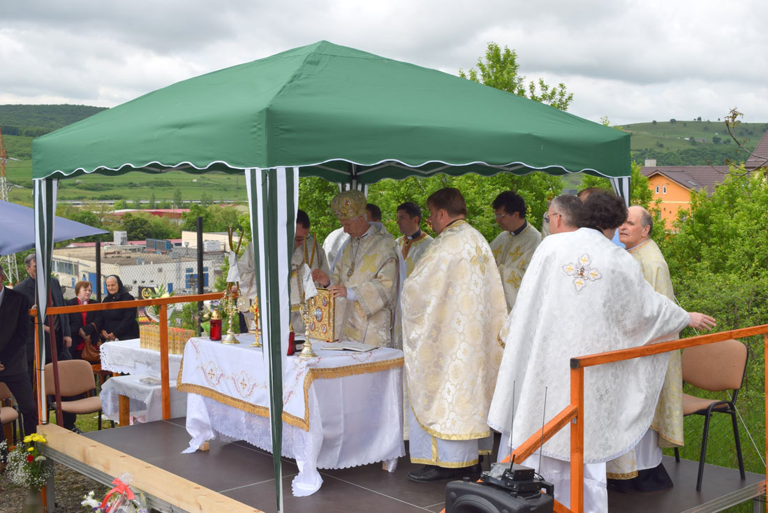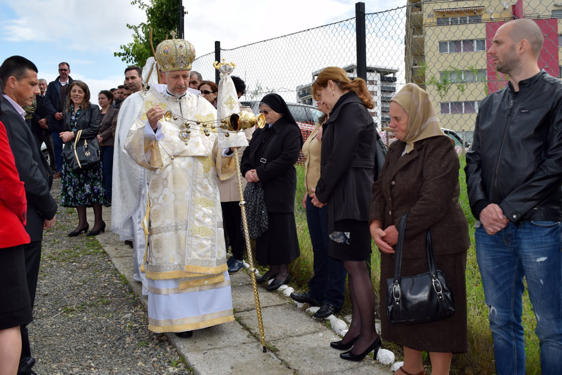 Episcopul eparhial a fost întâmpinat cu bucurie de preoți și credincioși, mai ales de cei șase copii frumos înveșmântați în strai popular, în mâini cu buchete de flori pe care i le-au oferit cu dedicația: „cules-am din holdele verzi, buchete de flori mititele, primiți-le însă cu drag, vă rugăm, căci dragostea noastră e-n ele”. După un cuvânt de întâmpinare a pr. paroh și un salut al Ierarhului, au urmat Sfânta Liturghie și ceremonia de binecuvântare celebrate în aer liber, pe placa de bază a bisericii al cărei demisol este deja realizat. Cuvântul de învățătură al Ierarhului a cuprins meditarea fragmentului evanghelic despre femeile purtătoare de mir care au plecat „dis de dimineață” acolo unde credeau că îl vor găsi pe Isus mort, dar nu l-au găsit, iar un înger li s-a arătat spunându-le: „A înviat! Nu este aici.”