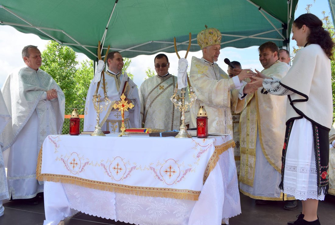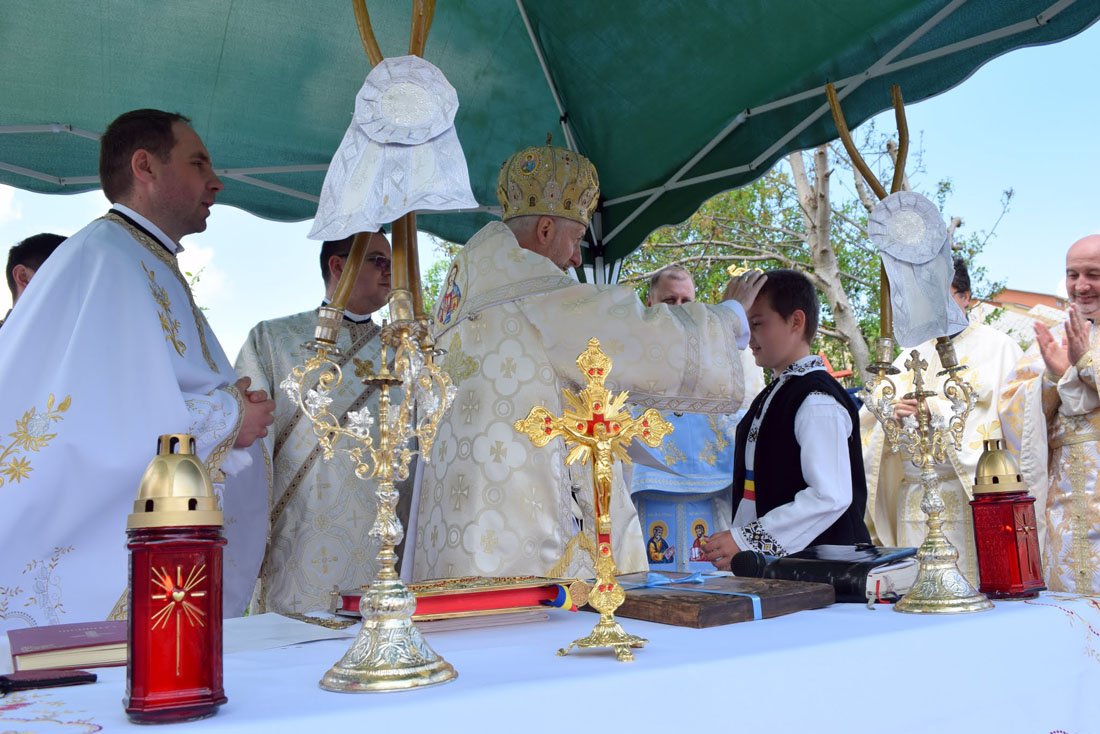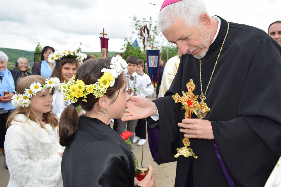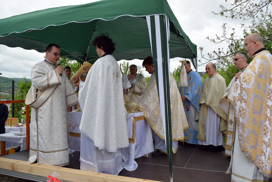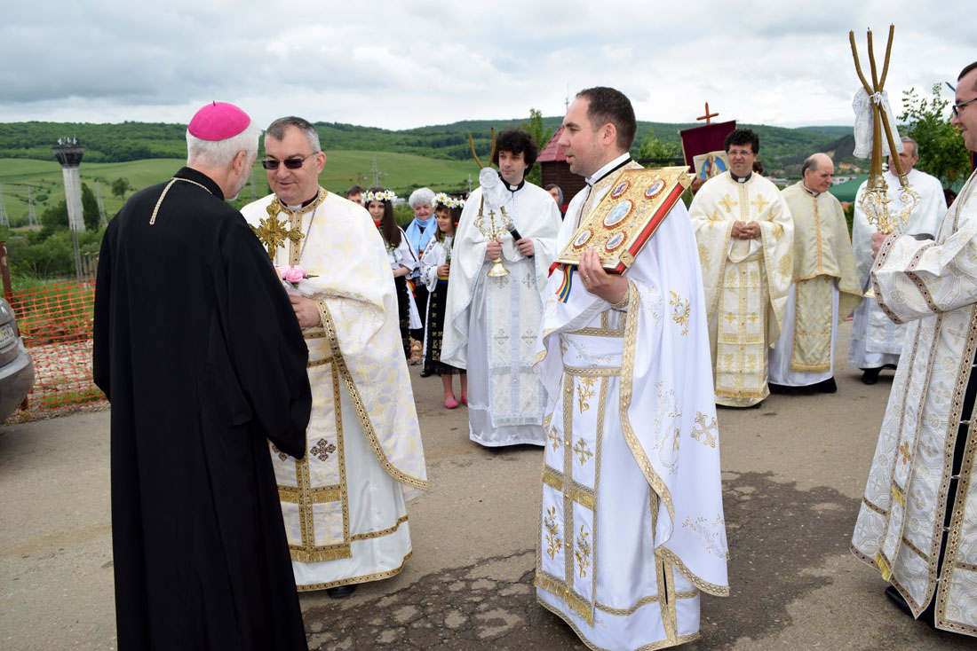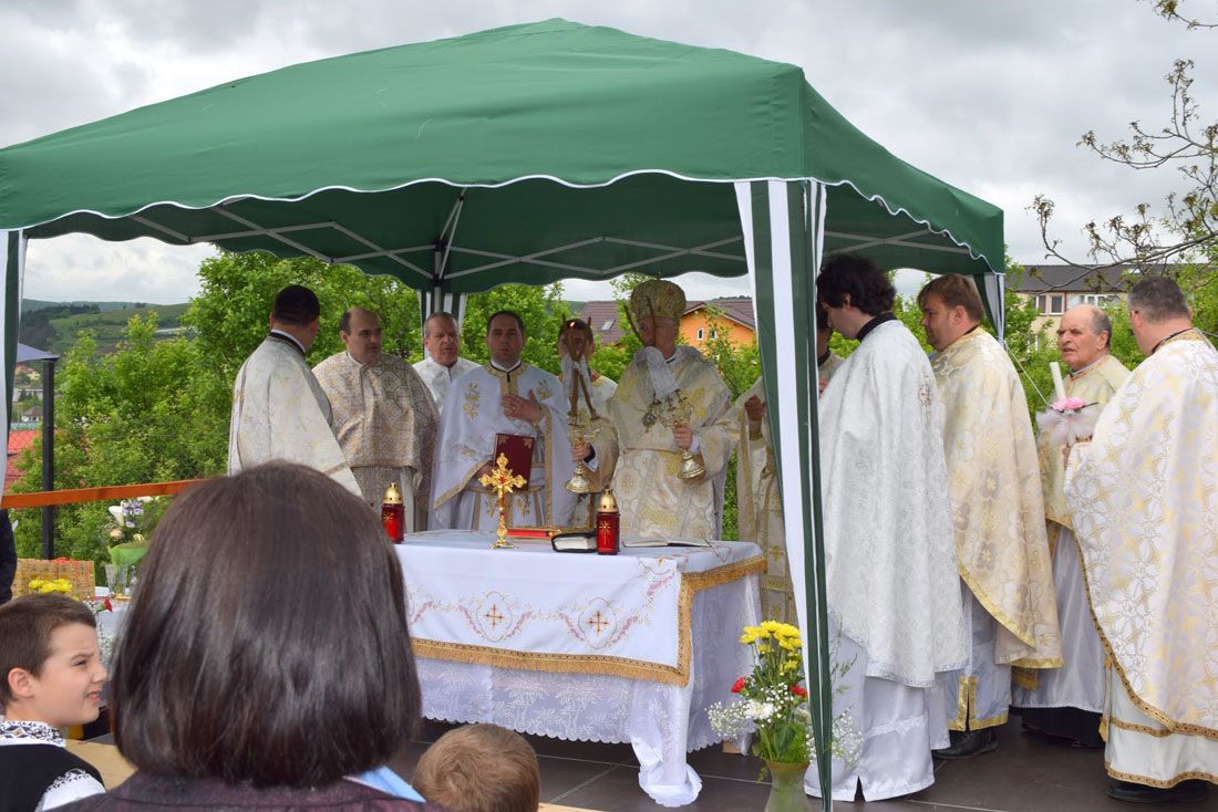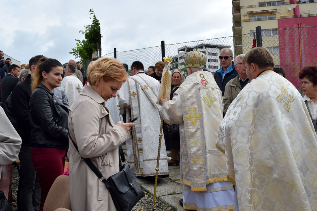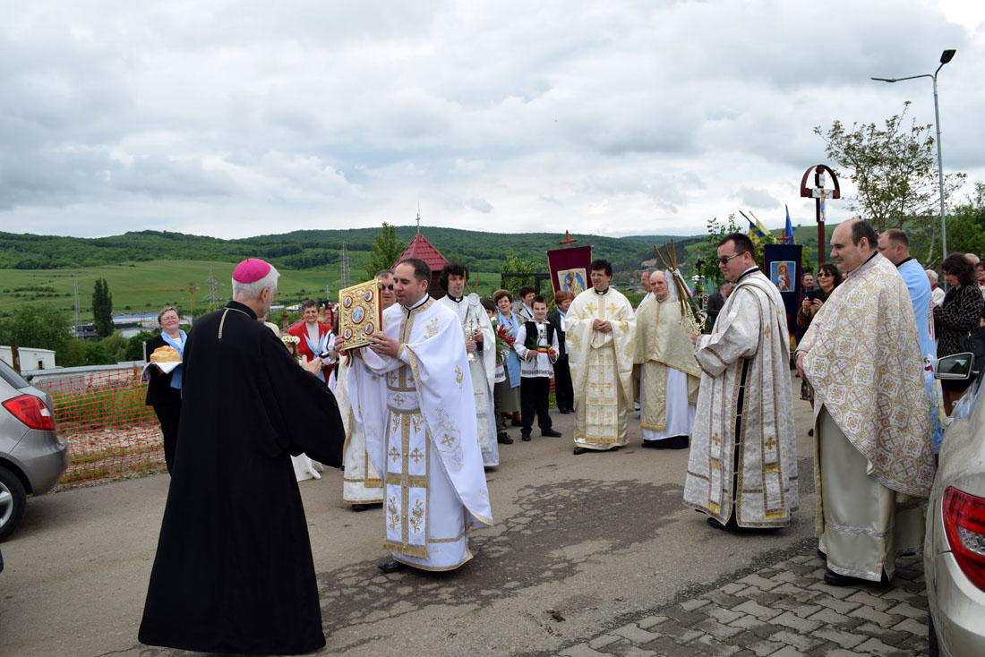 Episcopul eparhial a fost întâmpinat cu bucurie de preoți și credincioși, mai ales de cei șase copii frumos înveșmântați în strai popular, în mâini cu buchete de flori pe care i le-au oferit cu dedicația: „cules-am din holdele verzi, buchete de flori mititele, primiți-le însă cu drag, vă rugăm, căci dragostea noastră e-n ele”. După un cuvânt de întâmpinare a pr. paroh și un salut al Ierarhului, au urmat Sfânta Liturghie și ceremonia de binecuvântare celebrate în aer liber, pe placa de bază a bisericii al cărei demisol este deja realizat. Cuvântul de învățătură al Ierarhului a cuprins meditarea fragmentului evanghelic despre femeile purtătoare de mir care au plecat „dis de dimineață” acolo unde credeau că îl vor găsi pe Isus mort, dar nu l-au găsit, iar un înger li s-a arătat spunându-le: „A înviat! Nu este aici.”