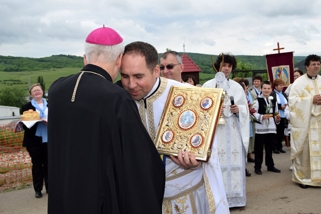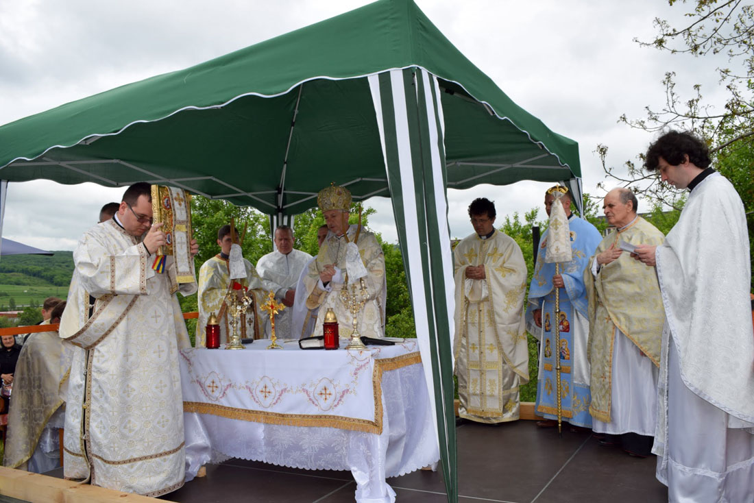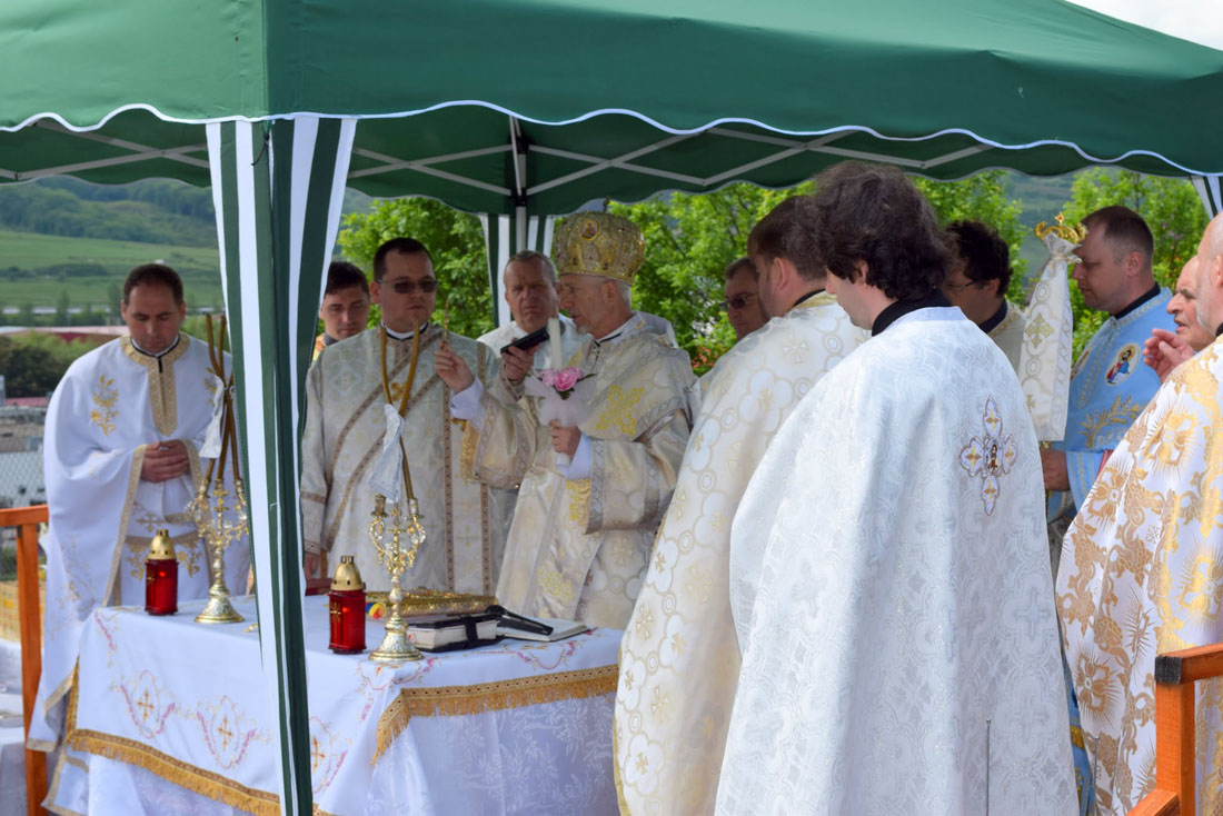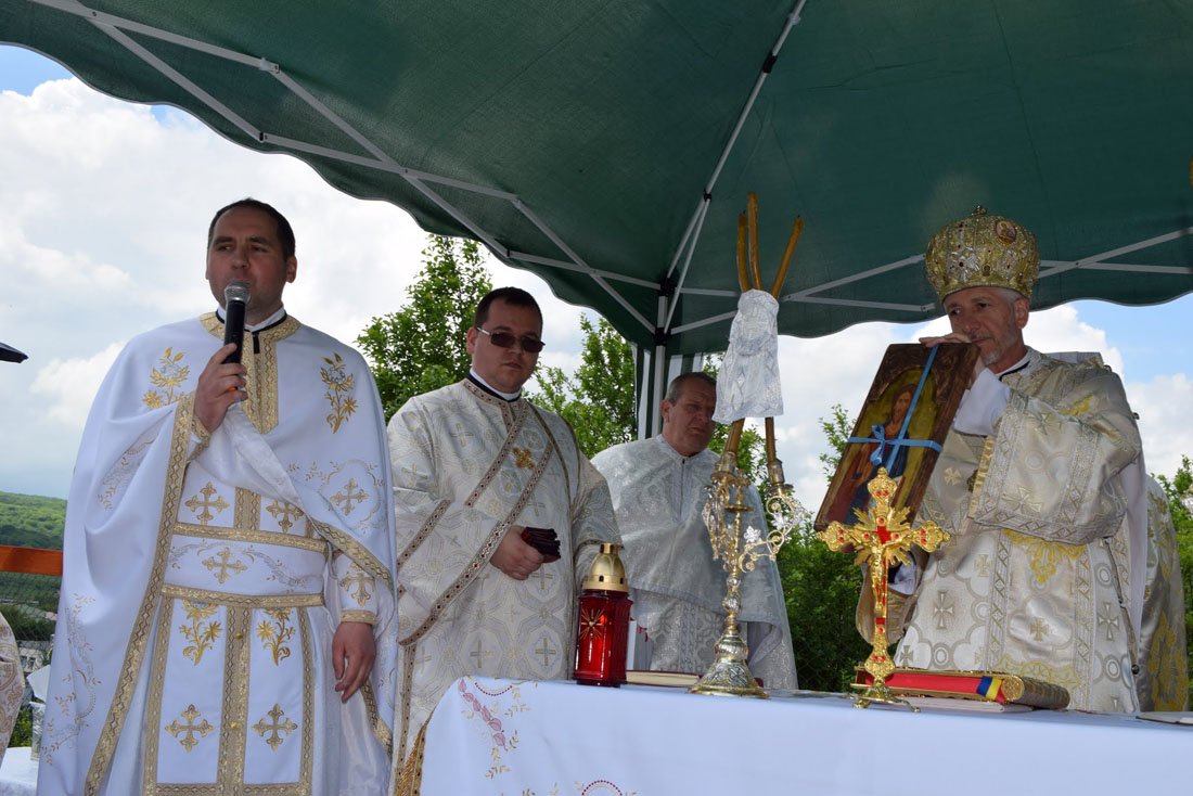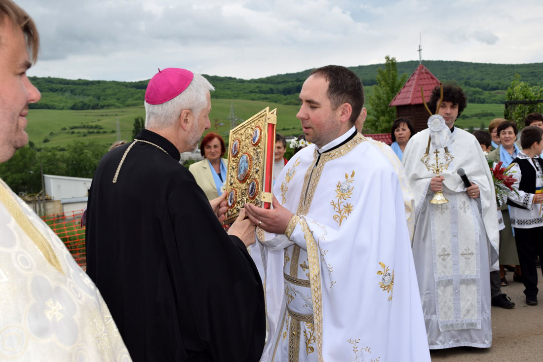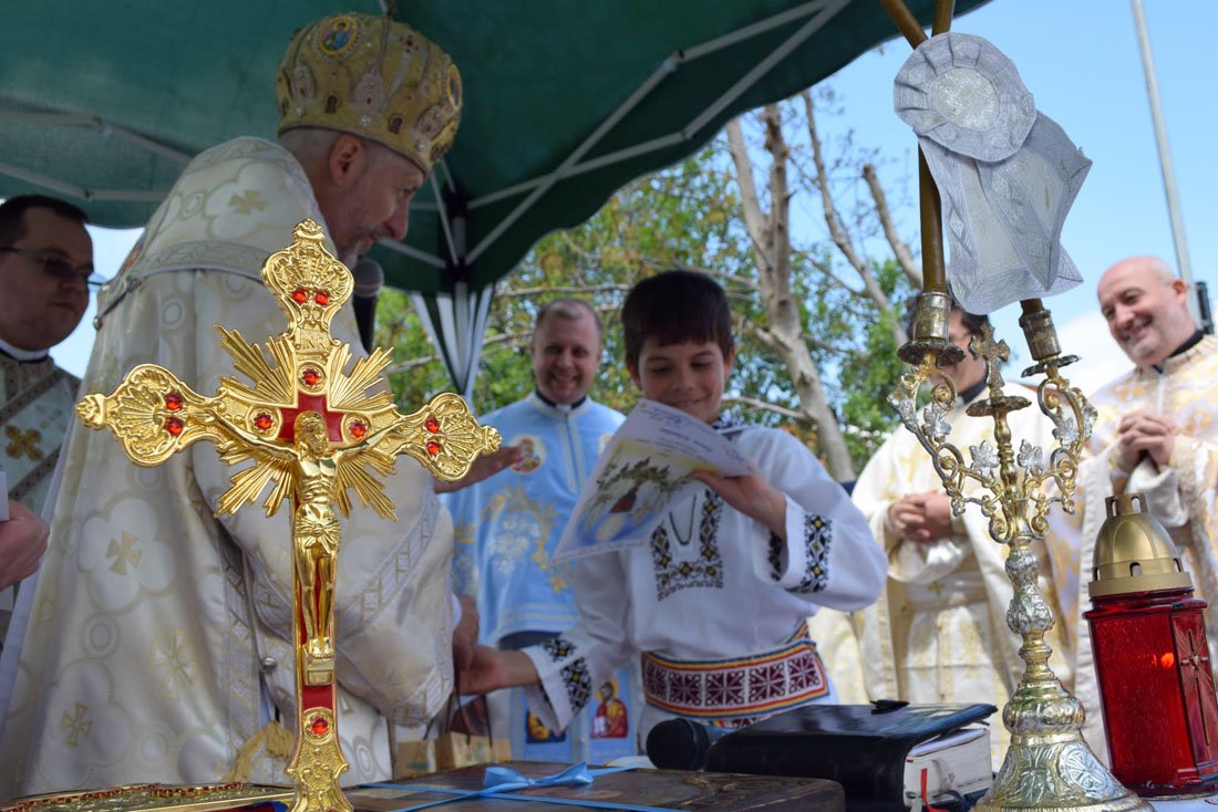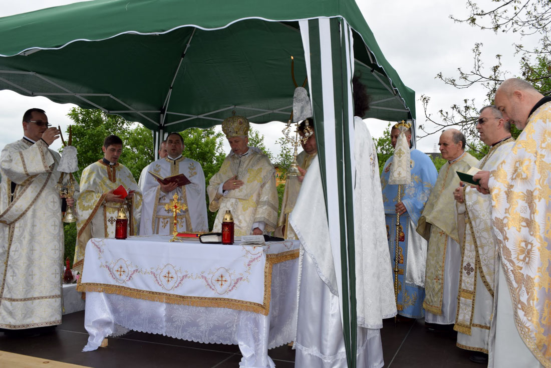 Episcopul eparhial a fost întâmpinat cu bucurie de preoți și credincioși, mai ales de cei șase copii frumos înveșmântați în strai popular, în mâini cu buchete de flori pe care i le-au oferit cu dedicația: „cules-am din holdele verzi, buchete de flori mititele, primiți-le însă cu drag, vă rugăm, căci dragostea noastră e-n ele”. După un cuvânt de întâmpinare a pr. paroh și un salut al Ierarhului, au urmat Sfânta Liturghie și ceremonia de binecuvântare celebrate în aer liber, pe placa de bază a bisericii al cărei demisol este deja realizat. Cuvântul de învățătură al Ierarhului a cuprins meditarea fragmentului evanghelic despre femeile purtătoare de mir care au plecat „dis de dimineață” acolo unde credeau că îl vor găsi pe Isus mort, dar nu l-au găsit, iar un înger li s-a arătat spunându-le: „A înviat! Nu este aici.”