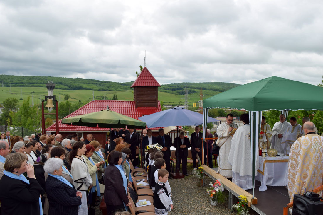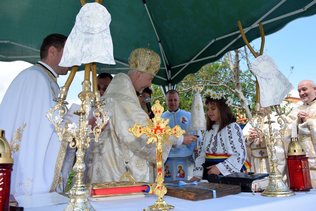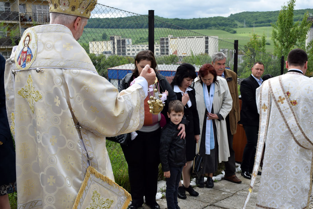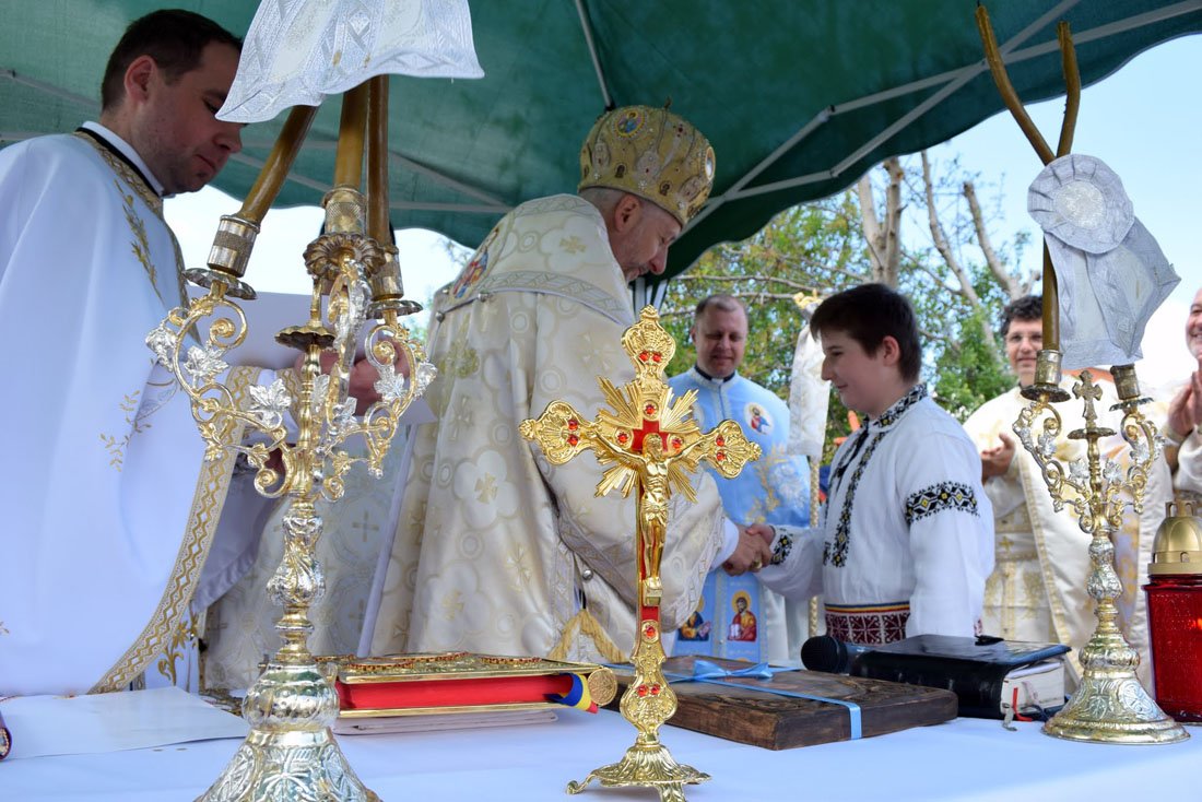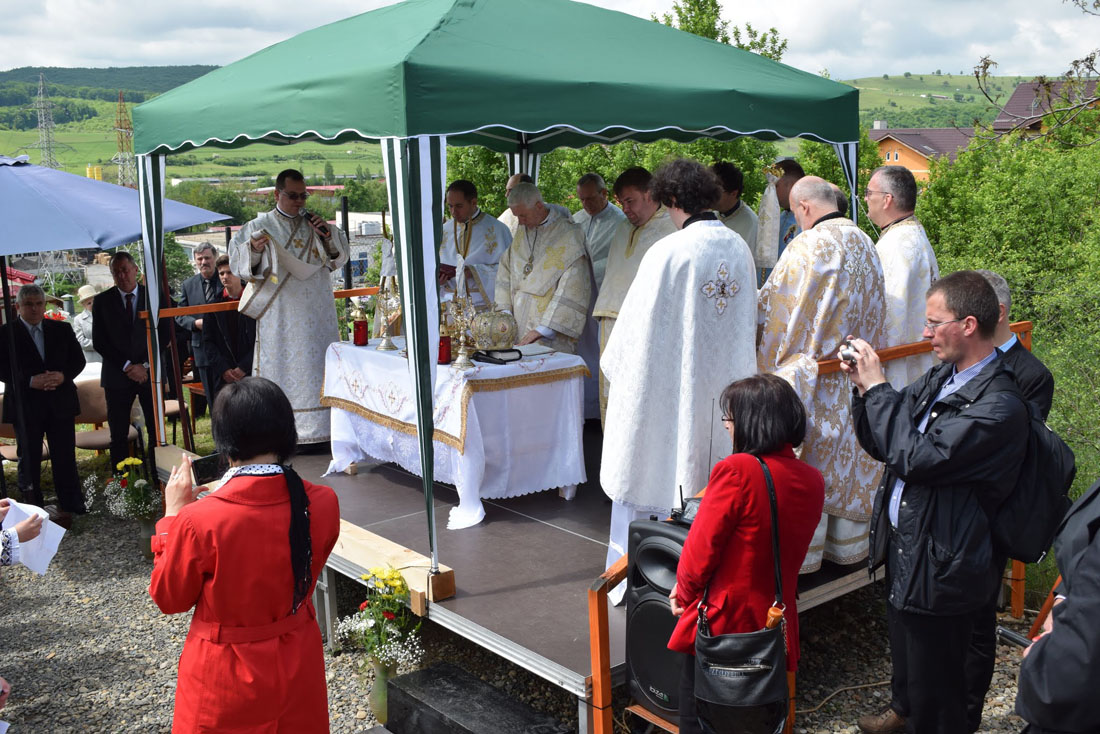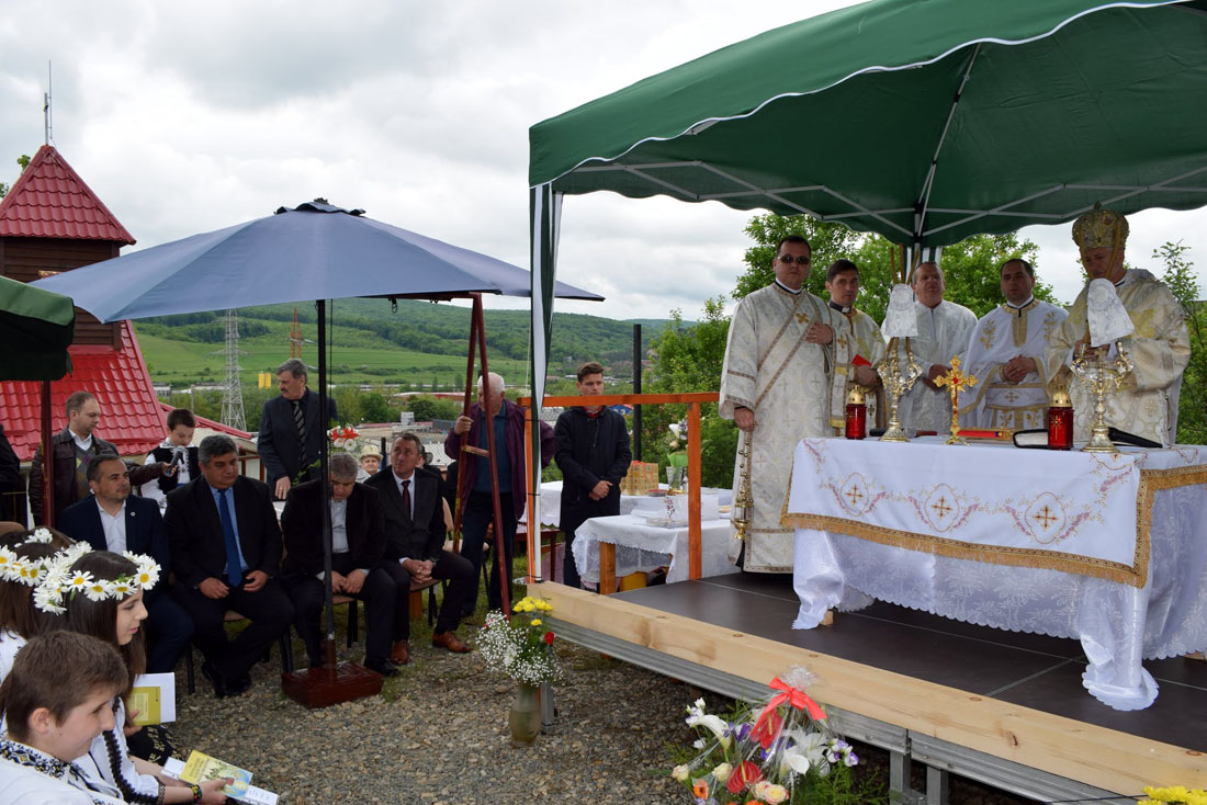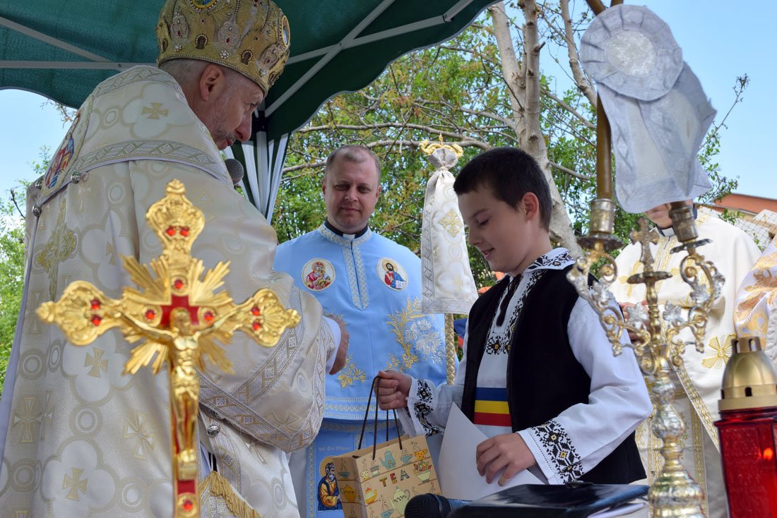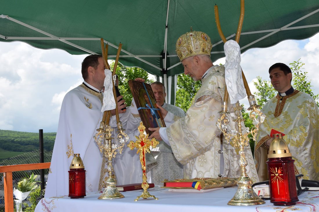 Episcopul eparhial a fost întâmpinat cu bucurie de preoți și credincioși, mai ales de cei șase copii frumos înveșmântați în strai popular, în mâini cu buchete de flori pe care i le-au oferit cu dedicația: „cules-am din holdele verzi, buchete de flori mititele, primiți-le însă cu drag, vă rugăm, căci dragostea noastră e-n ele”. După un cuvânt de întâmpinare a pr. paroh și un salut al Ierarhului, au urmat Sfânta Liturghie și ceremonia de binecuvântare celebrate în aer liber, pe placa de bază a bisericii al cărei demisol este deja realizat. Cuvântul de învățătură al Ierarhului a cuprins meditarea fragmentului evanghelic despre femeile purtătoare de mir care au plecat „dis de dimineață” acolo unde credeau că îl vor găsi pe Isus mort, dar nu l-au găsit, iar un înger li s-a arătat spunându-le: „A înviat! Nu este aici.”