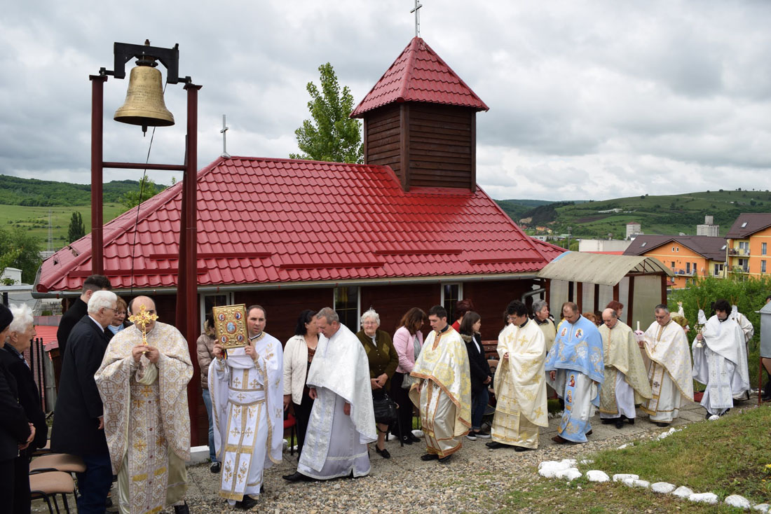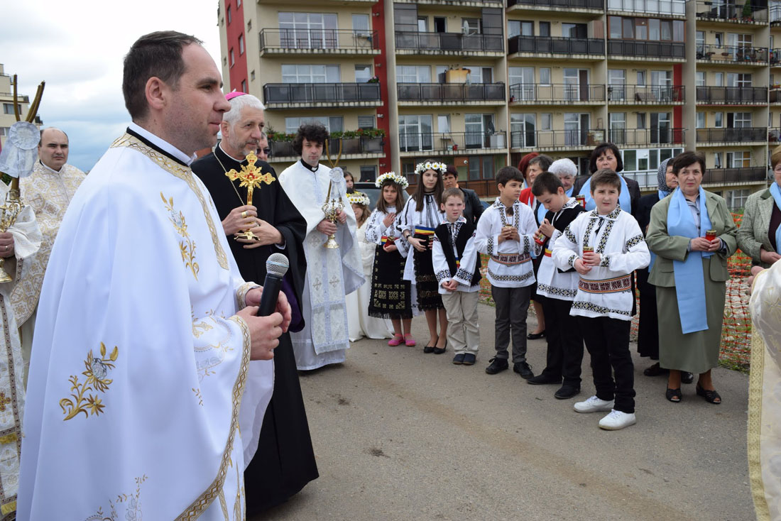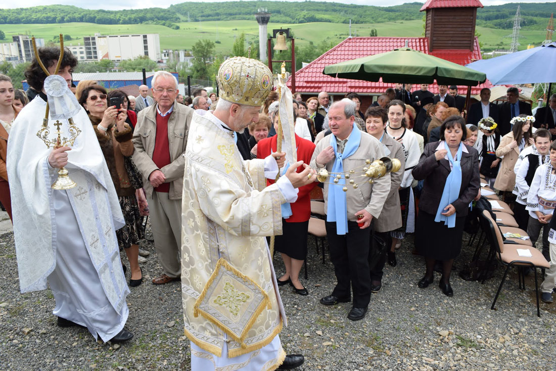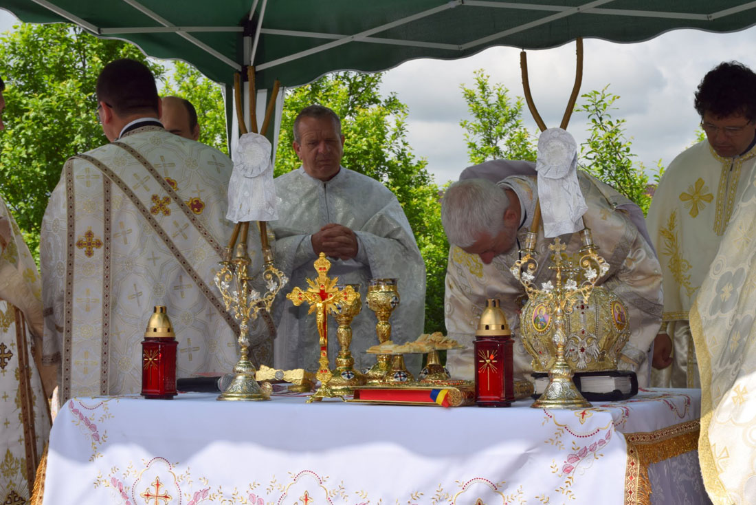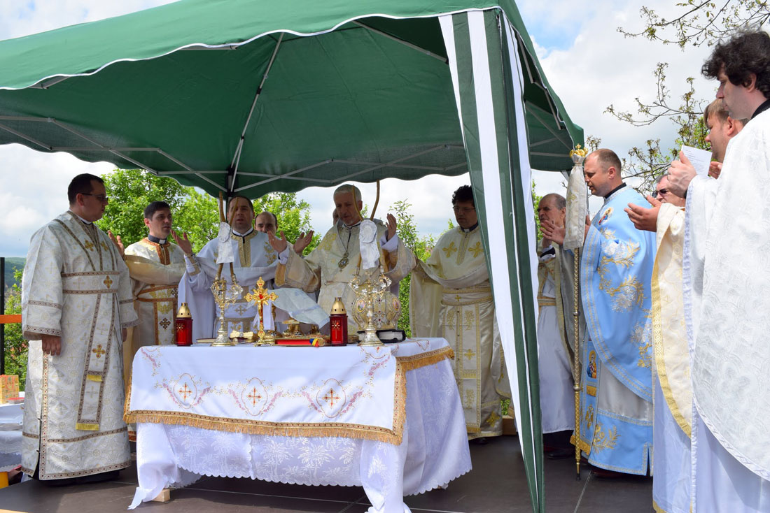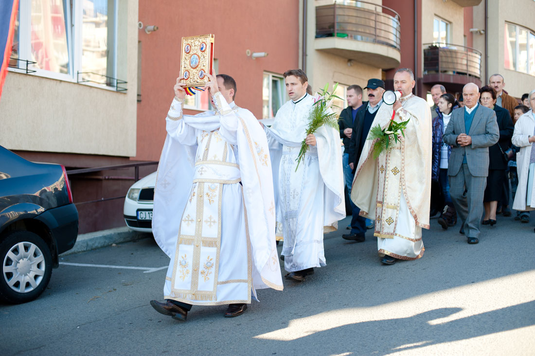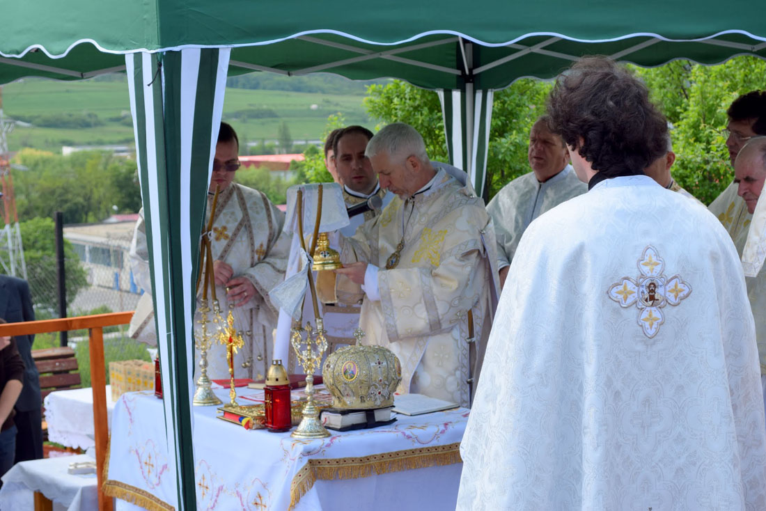 Episcopul eparhial a fost întâmpinat cu bucurie de preoți și credincioși, mai ales de cei șase copii frumos înveșmântați în strai popular, în mâini cu buchete de flori pe care i le-au oferit cu dedicația: „cules-am din holdele verzi, buchete de flori mititele, primiți-le însă cu drag, vă rugăm, căci dragostea noastră e-n ele”. După un cuvânt de întâmpinare a pr. paroh și un salut al Ierarhului, au urmat Sfânta Liturghie și ceremonia de binecuvântare celebrate în aer liber, pe placa de bază a bisericii al cărei demisol este deja realizat. Cuvântul de învățătură al Ierarhului a cuprins meditarea fragmentului evanghelic despre femeile purtătoare de mir care au plecat „dis de dimineață” acolo unde credeau că îl vor găsi pe Isus mort, dar nu l-au găsit, iar un înger li s-a arătat spunându-le: „A înviat! Nu este aici.”