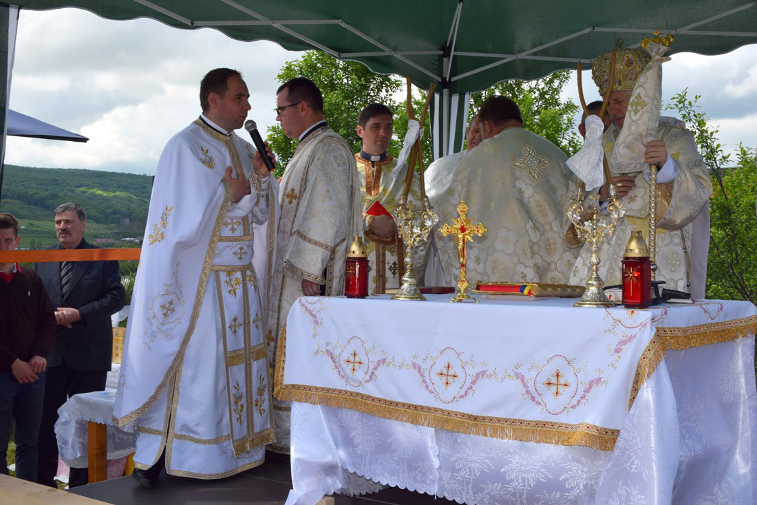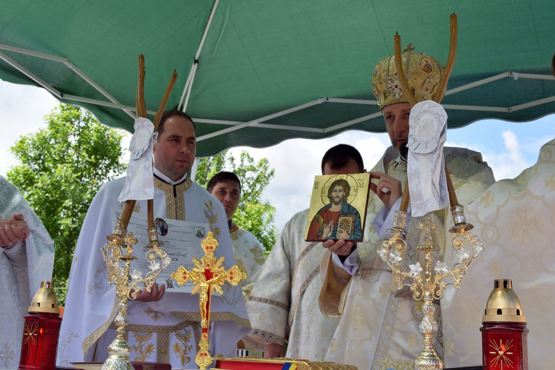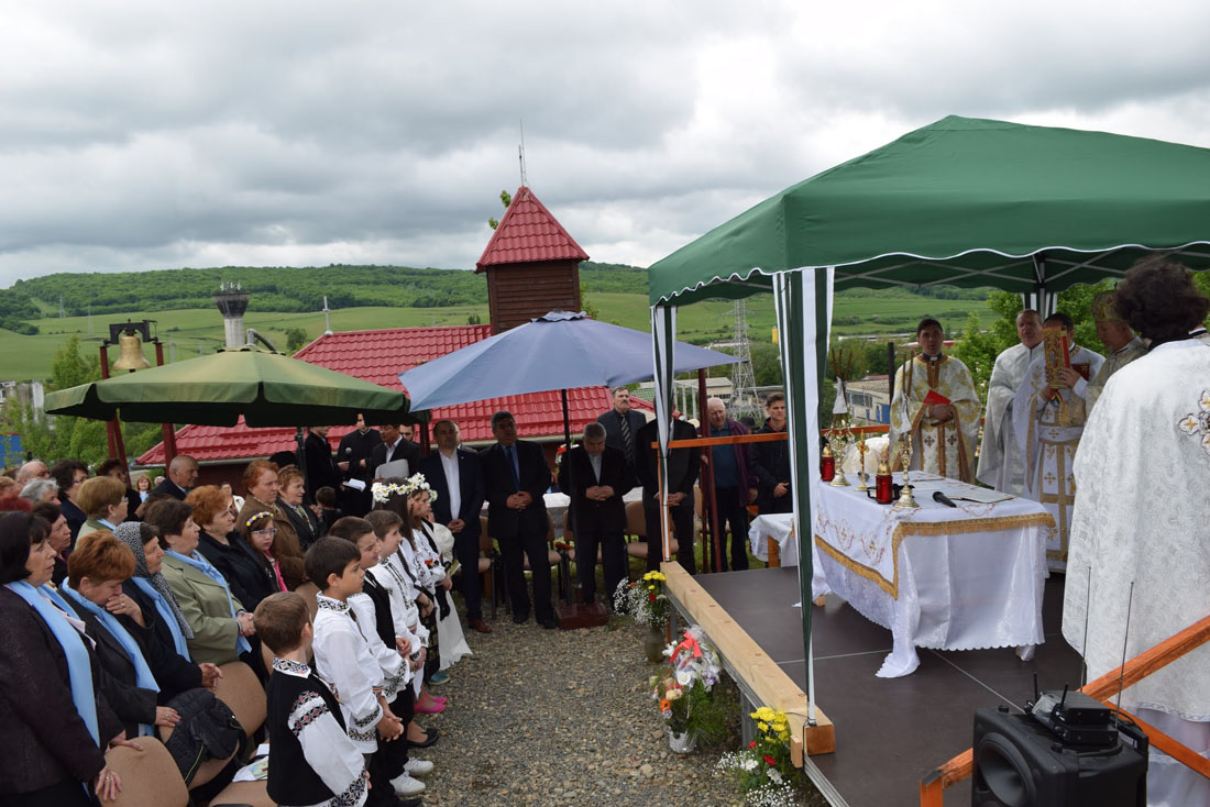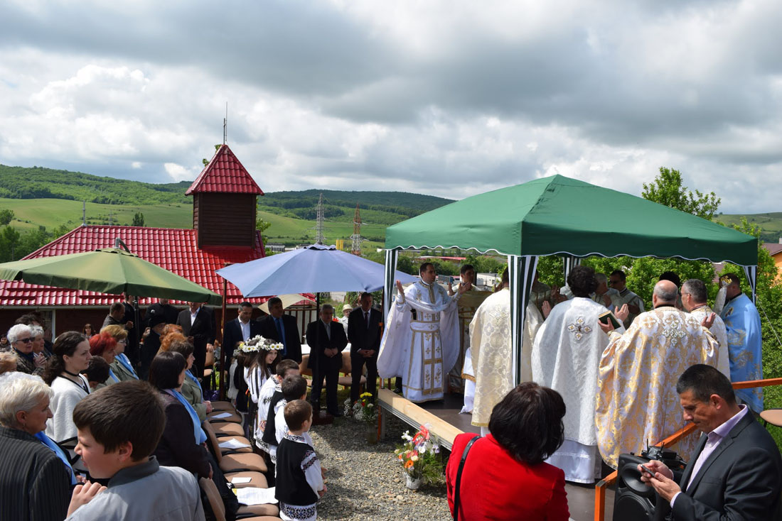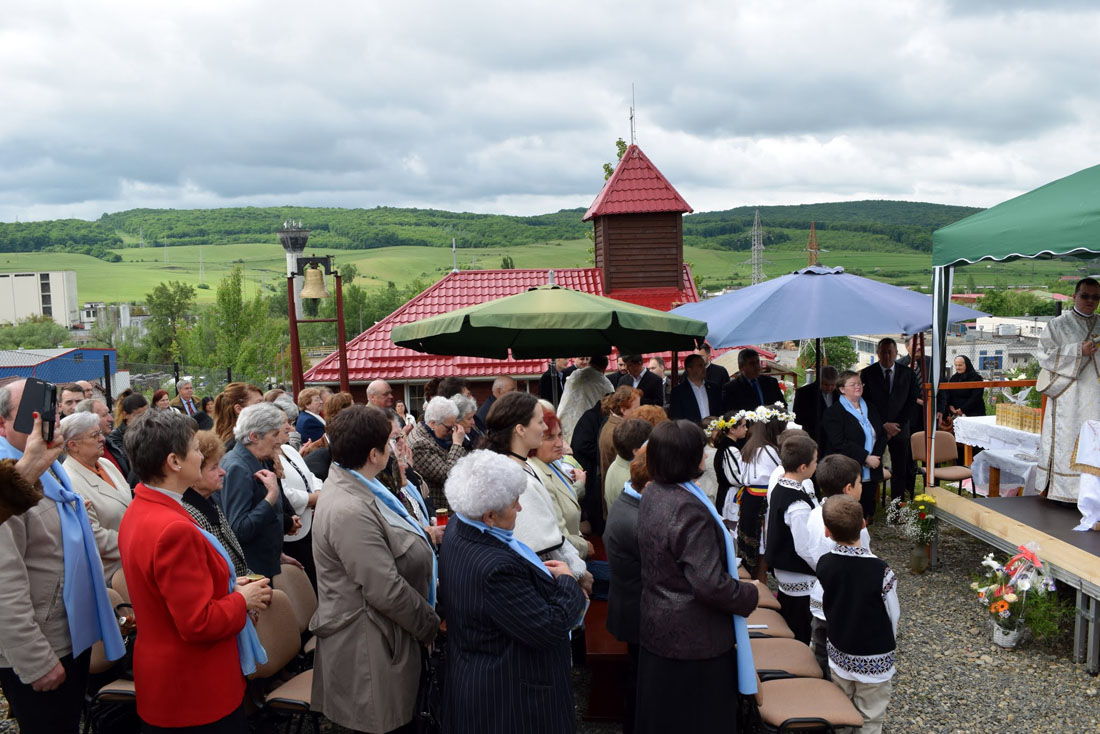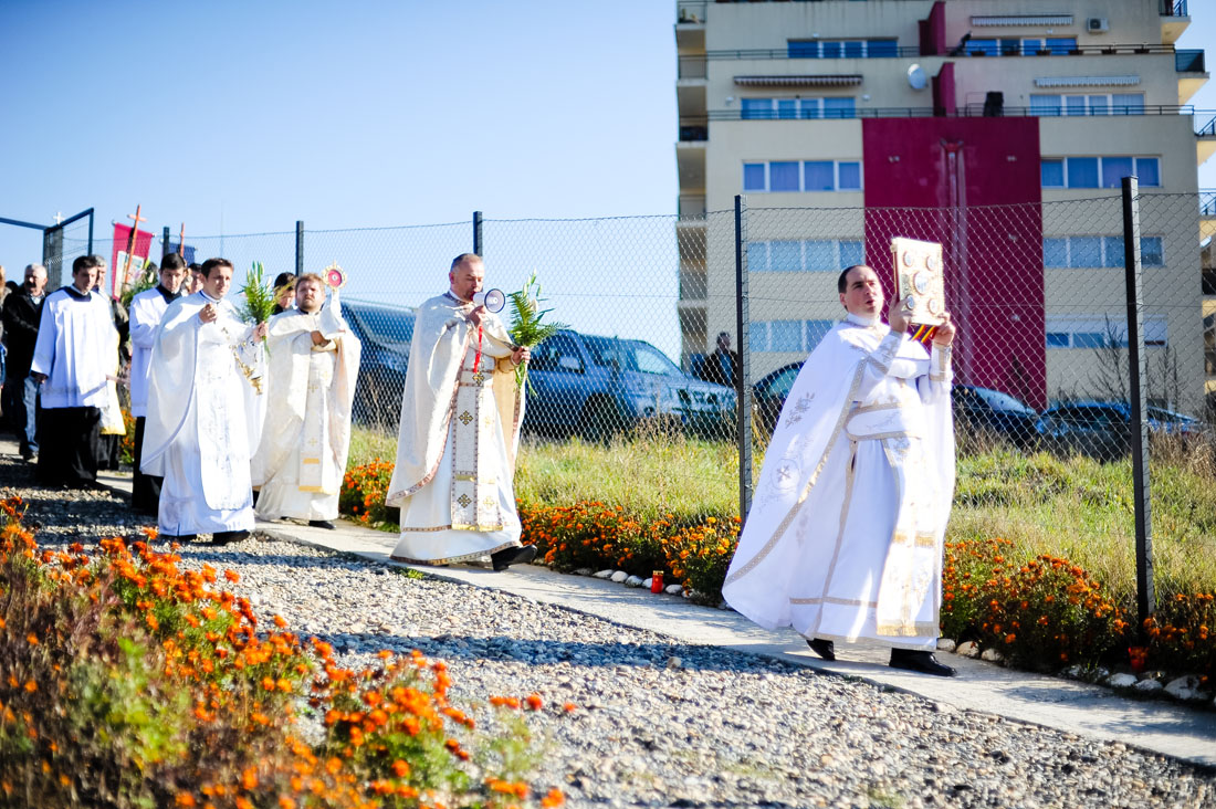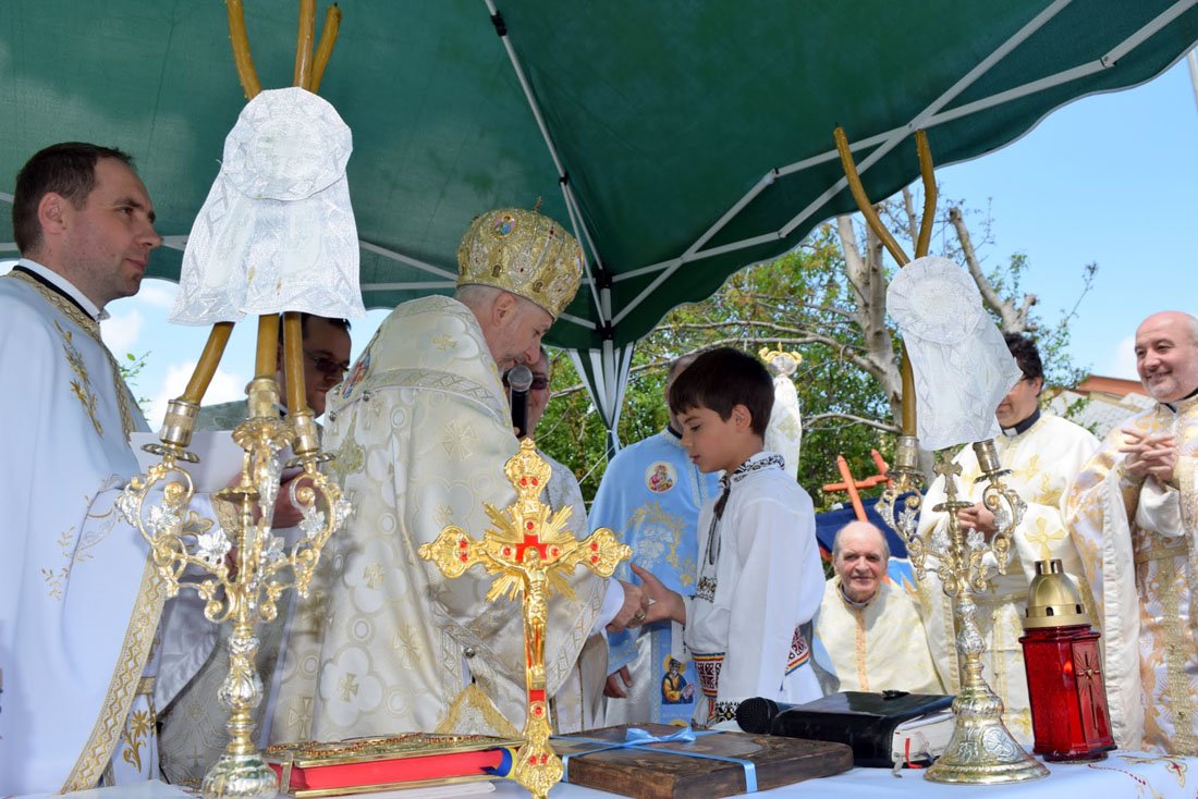 Episcopul eparhial a fost întâmpinat cu bucurie de preoți și credincioși, mai ales de cei șase copii frumos înveșmântați în strai popular, în mâini cu buchete de flori pe care i le-au oferit cu dedicația: „cules-am din holdele verzi, buchete de flori mititele, primiți-le însă cu drag, vă rugăm, căci dragostea noastră e-n ele”. După un cuvânt de întâmpinare a pr. paroh și un salut al Ierarhului, au urmat Sfânta Liturghie și ceremonia de binecuvântare celebrate în aer liber, pe placa de bază a bisericii al cărei demisol este deja realizat. Cuvântul de învățătură al Ierarhului a cuprins meditarea fragmentului evanghelic despre femeile purtătoare de mir care au plecat „dis de dimineață” acolo unde credeau că îl vor găsi pe Isus mort, dar nu l-au găsit, iar un înger li s-a arătat spunându-le: „A înviat! Nu este aici.”