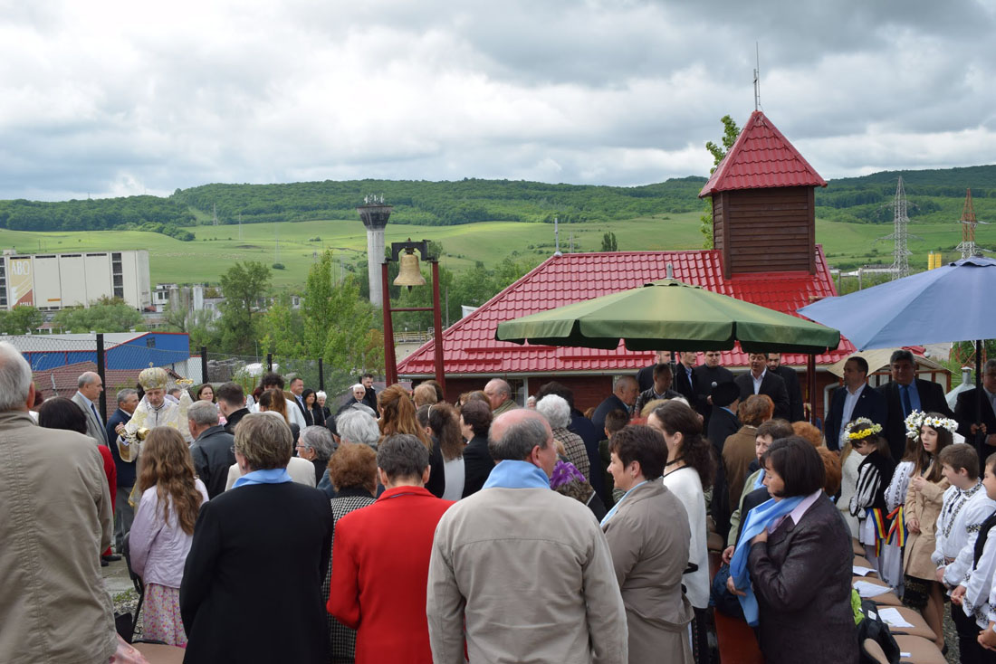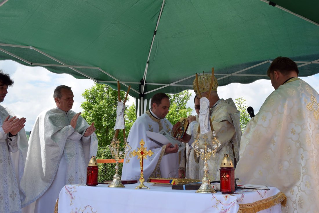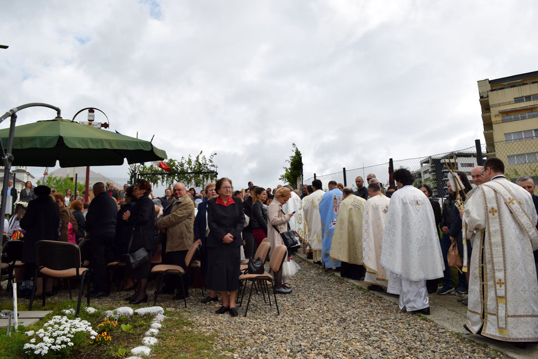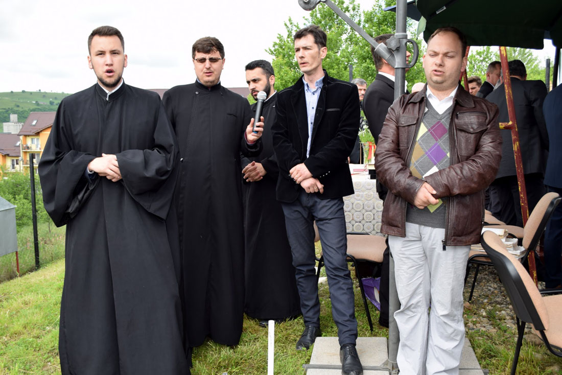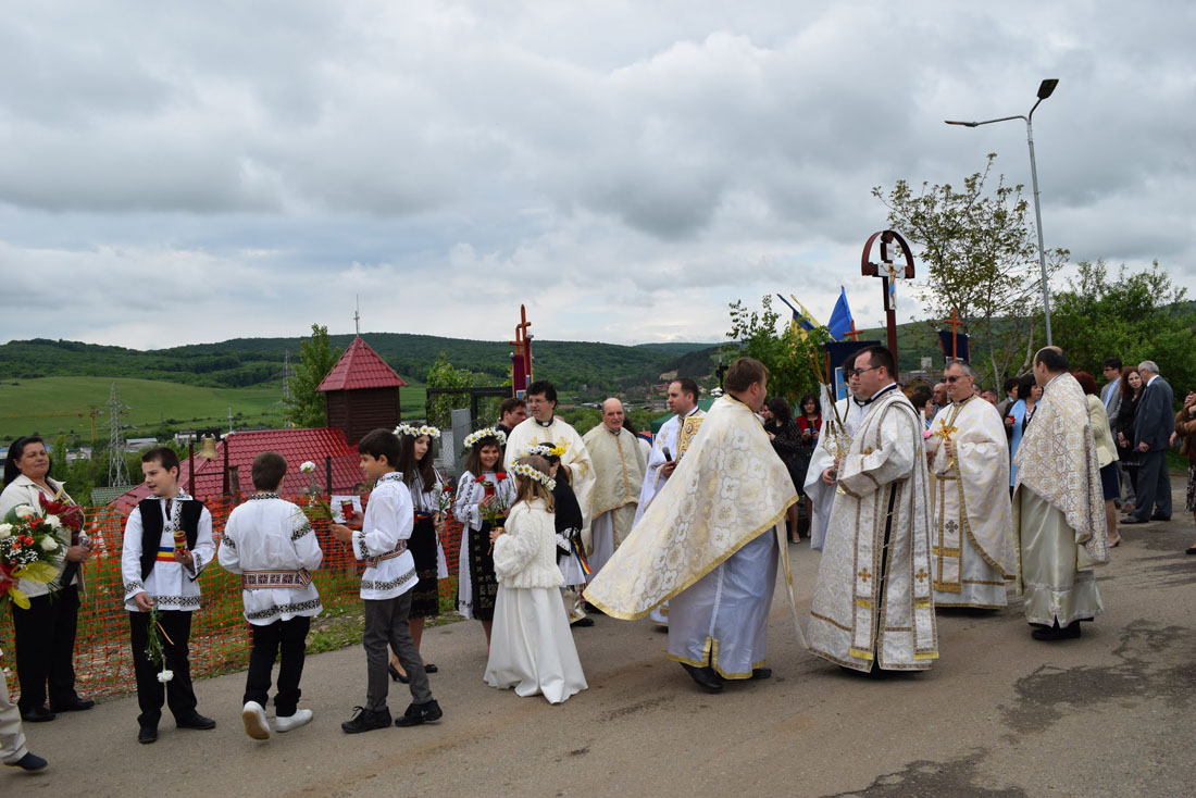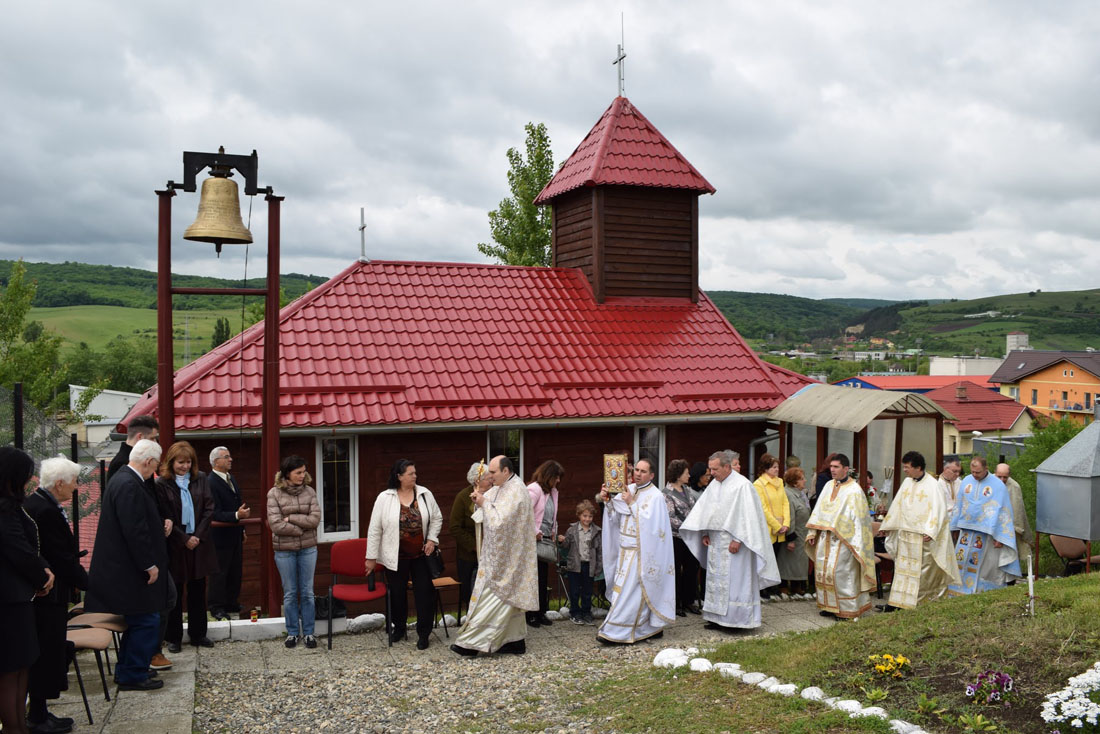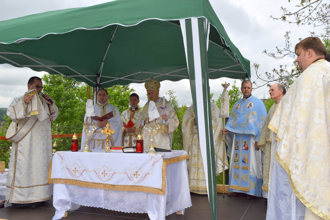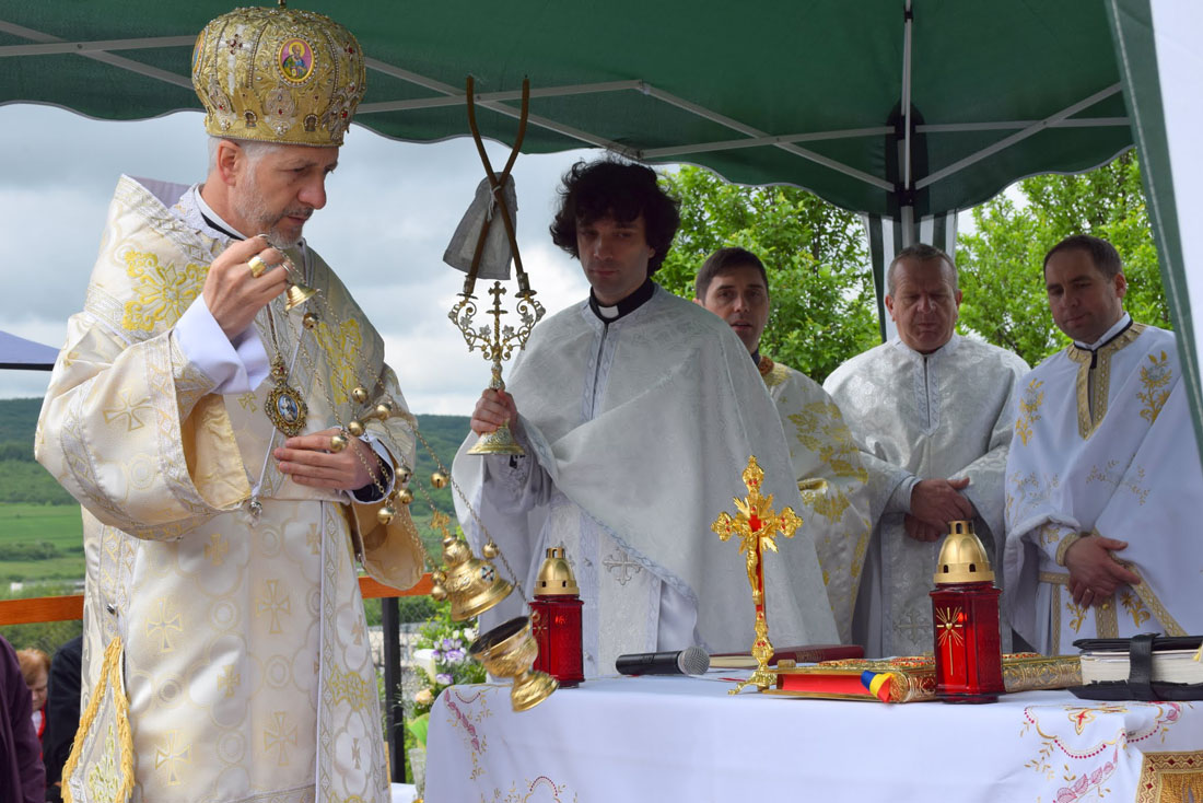 Episcopul eparhial a fost întâmpinat cu bucurie de preoți și credincioși, mai ales de cei șase copii frumos înveșmântați în strai popular, în mâini cu buchete de flori pe care i le-au oferit cu dedicația: „cules-am din holdele verzi, buchete de flori mititele, primiți-le însă cu drag, vă rugăm, căci dragostea noastră e-n ele”. După un cuvânt de întâmpinare a pr. paroh și un salut al Ierarhului, au urmat Sfânta Liturghie și ceremonia de binecuvântare celebrate în aer liber, pe placa de bază a bisericii al cărei demisol este deja realizat. Cuvântul de învățătură al Ierarhului a cuprins meditarea fragmentului evanghelic despre femeile purtătoare de mir care au plecat „dis de dimineață” acolo unde credeau că îl vor găsi pe Isus mort, dar nu l-au găsit, iar un înger li s-a arătat spunându-le: „A înviat! Nu este aici.”