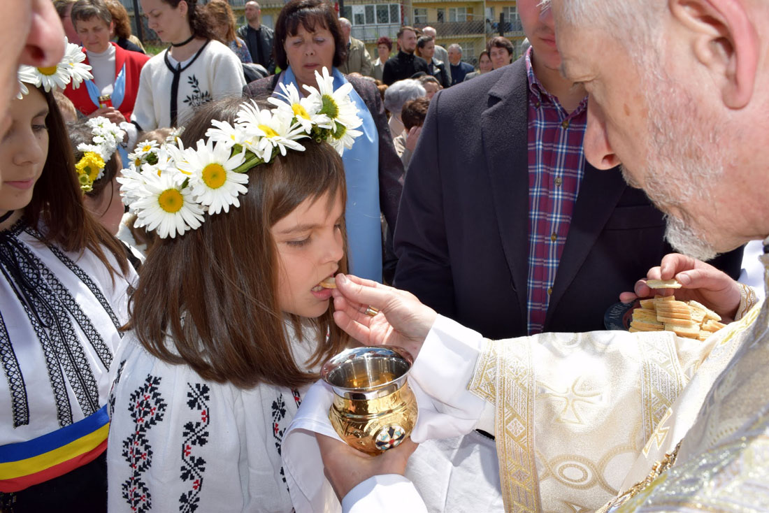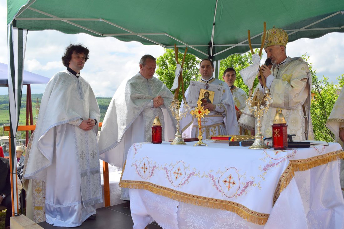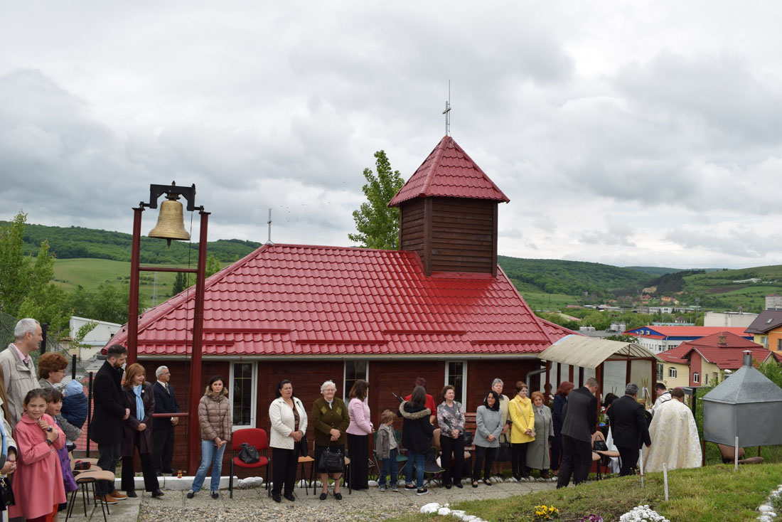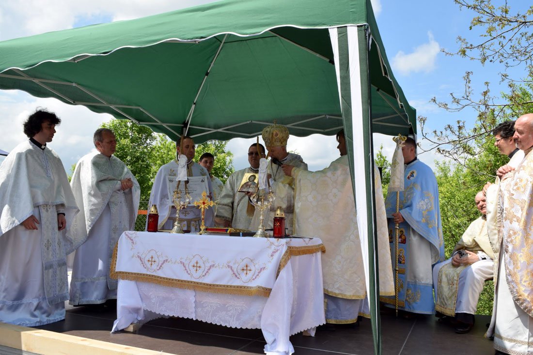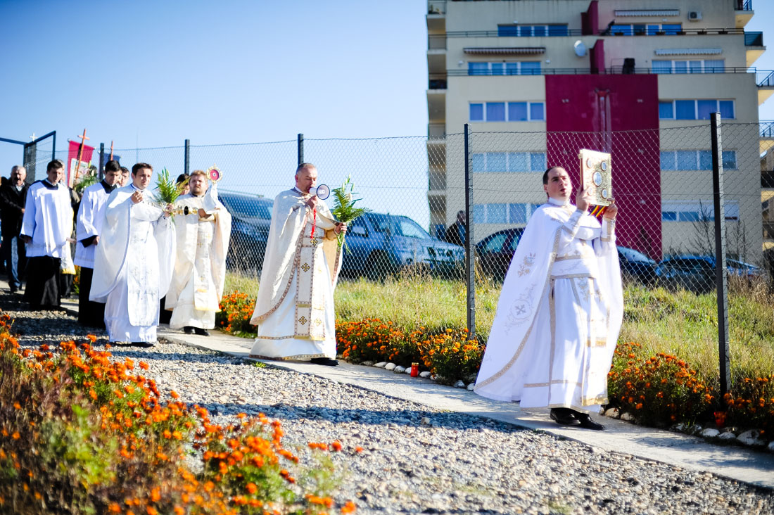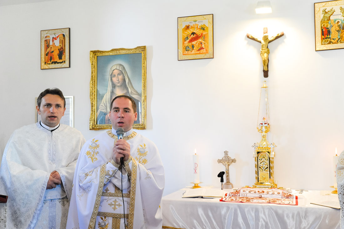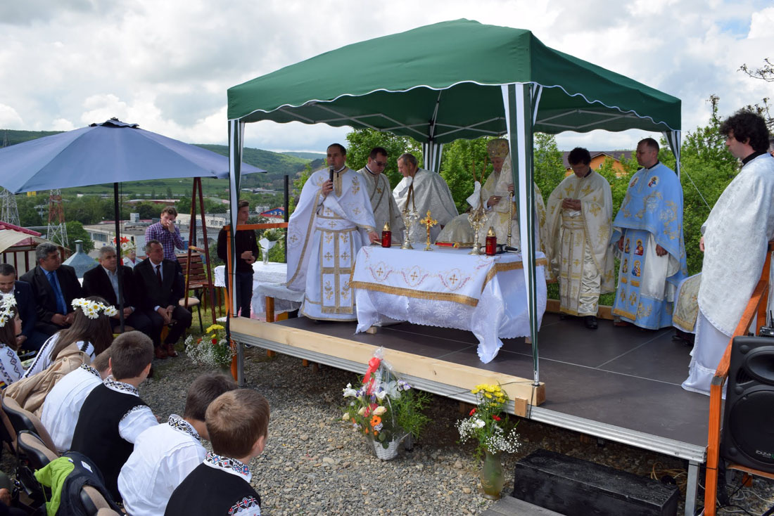 Episcopul eparhial a fost întâmpinat cu bucurie de preoți și credincioși, mai ales de cei șase copii frumos înveșmântați în strai popular, în mâini cu buchete de flori pe care i le-au oferit cu dedicația: „cules-am din holdele verzi, buchete de flori mititele, primiți-le însă cu drag, vă rugăm, căci dragostea noastră e-n ele”. După un cuvânt de întâmpinare a pr. paroh și un salut al Ierarhului, au urmat Sfânta Liturghie și ceremonia de binecuvântare celebrate în aer liber, pe placa de bază a bisericii al cărei demisol este deja realizat. Cuvântul de învățătură al Ierarhului a cuprins meditarea fragmentului evanghelic despre femeile purtătoare de mir care au plecat „dis de dimineață” acolo unde credeau că îl vor găsi pe Isus mort, dar nu l-au găsit, iar un înger li s-a arătat spunându-le: „A înviat! Nu este aici.”