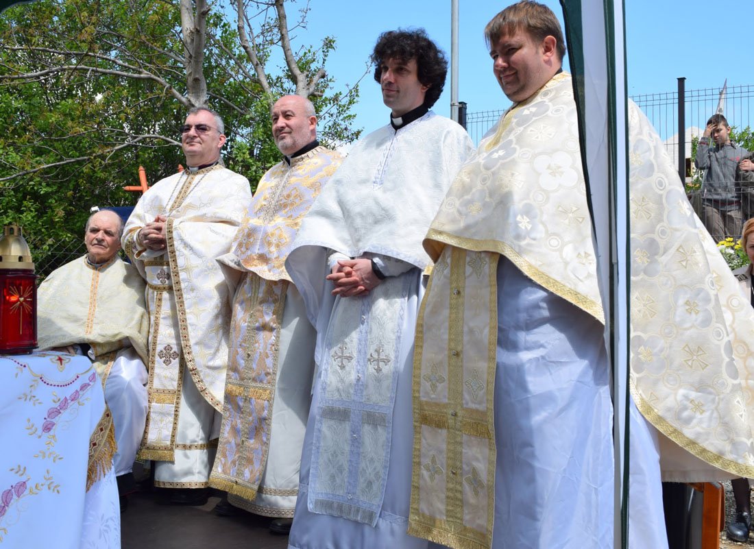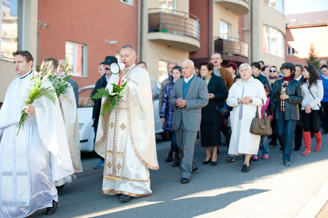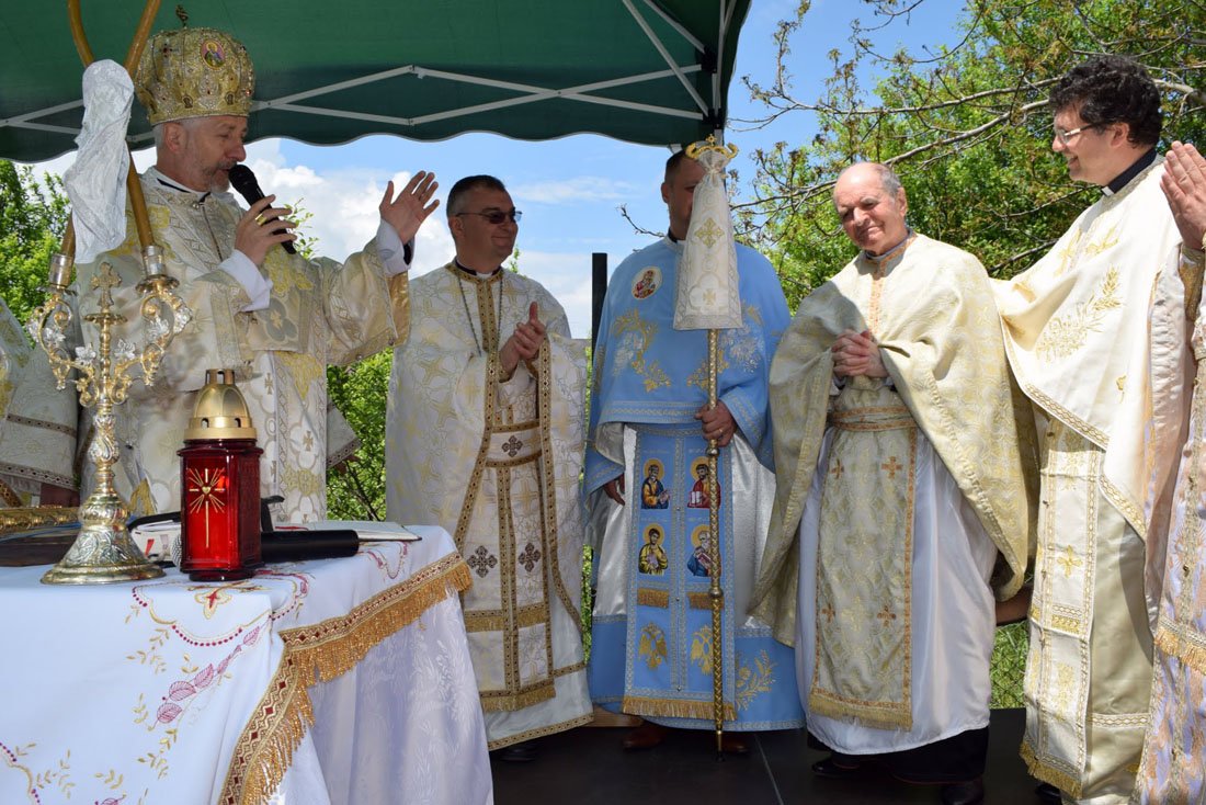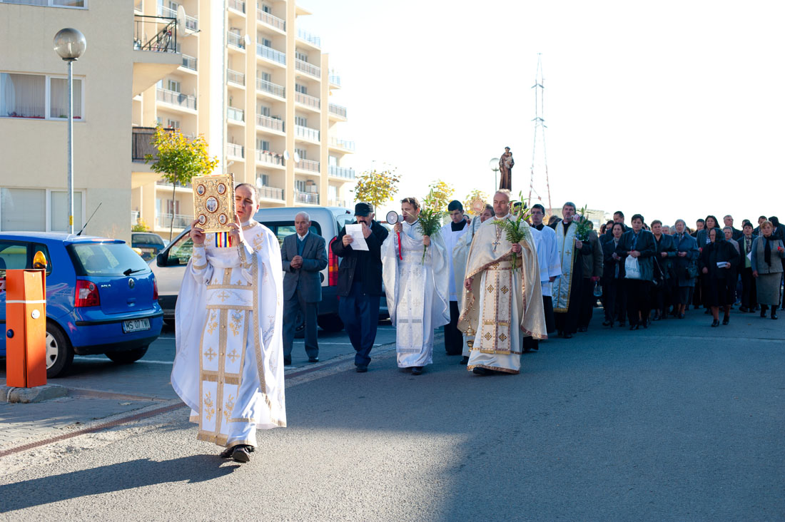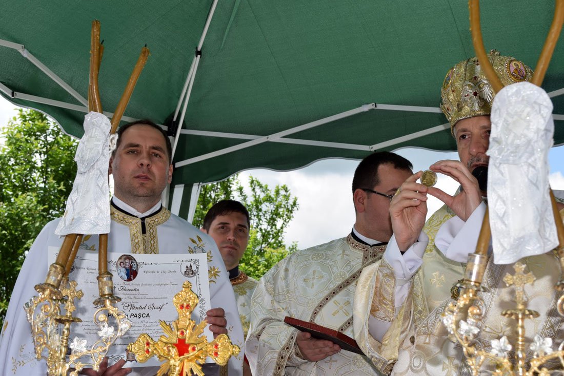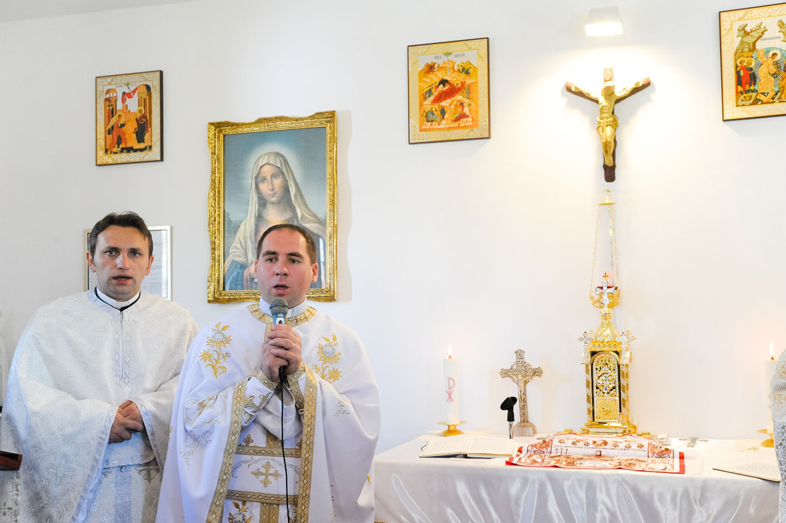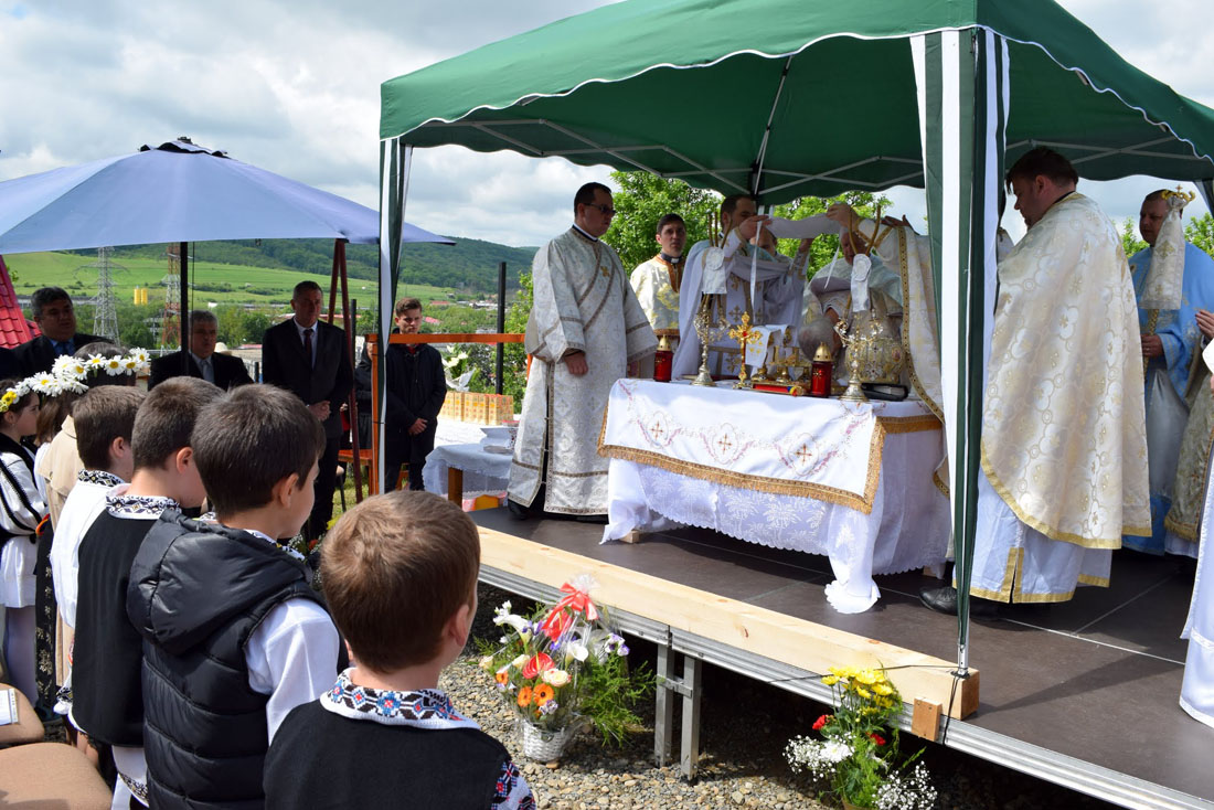 Episcopul eparhial a fost întâmpinat cu bucurie de preoți și credincioși, mai ales de cei șase copii frumos înveșmântați în strai popular, în mâini cu buchete de flori pe care i le-au oferit cu dedicația: „cules-am din holdele verzi, buchete de flori mititele, primiți-le însă cu drag, vă rugăm, căci dragostea noastră e-n ele”. După un cuvânt de întâmpinare a pr. paroh și un salut al Ierarhului, au urmat Sfânta Liturghie și ceremonia de binecuvântare celebrate în aer liber, pe placa de bază a bisericii al cărei demisol este deja realizat. Cuvântul de învățătură al Ierarhului a cuprins meditarea fragmentului evanghelic despre femeile purtătoare de mir care au plecat „dis de dimineață” acolo unde credeau că îl vor găsi pe Isus mort, dar nu l-au găsit, iar un înger li s-a arătat spunându-le: „A înviat! Nu este aici.”