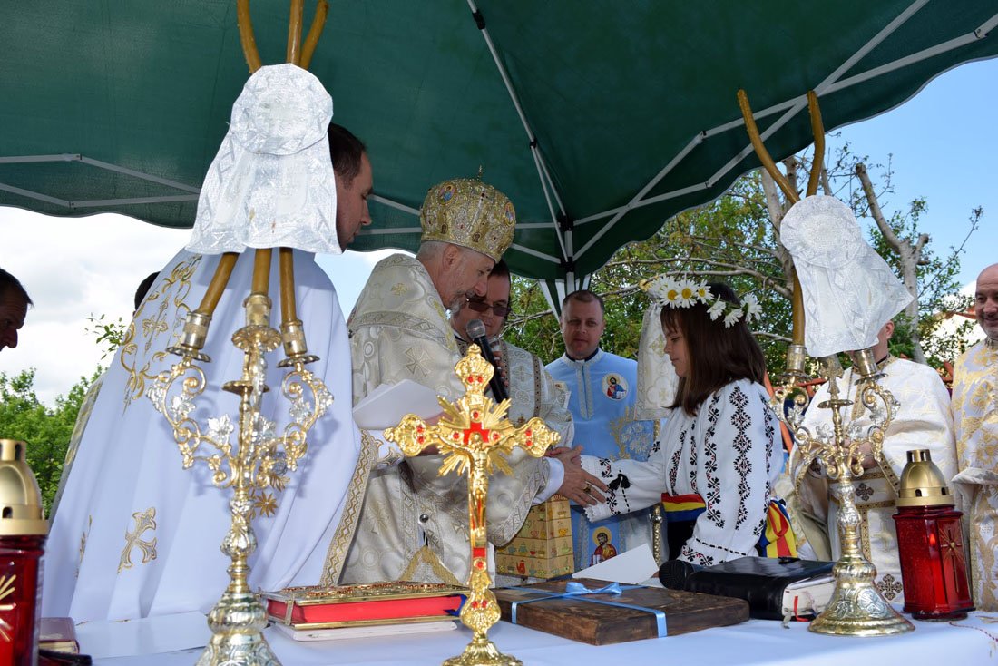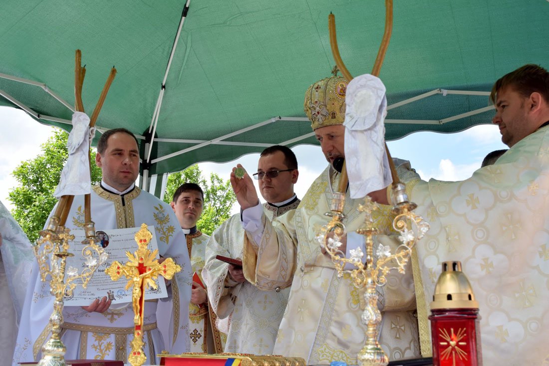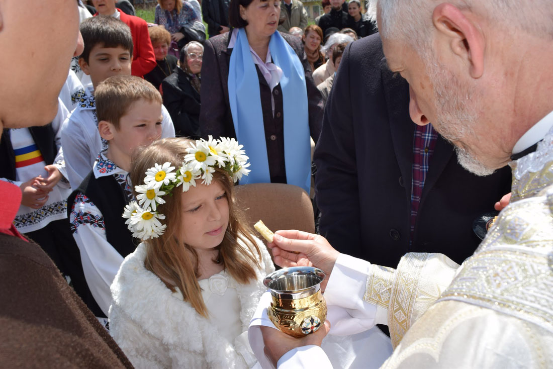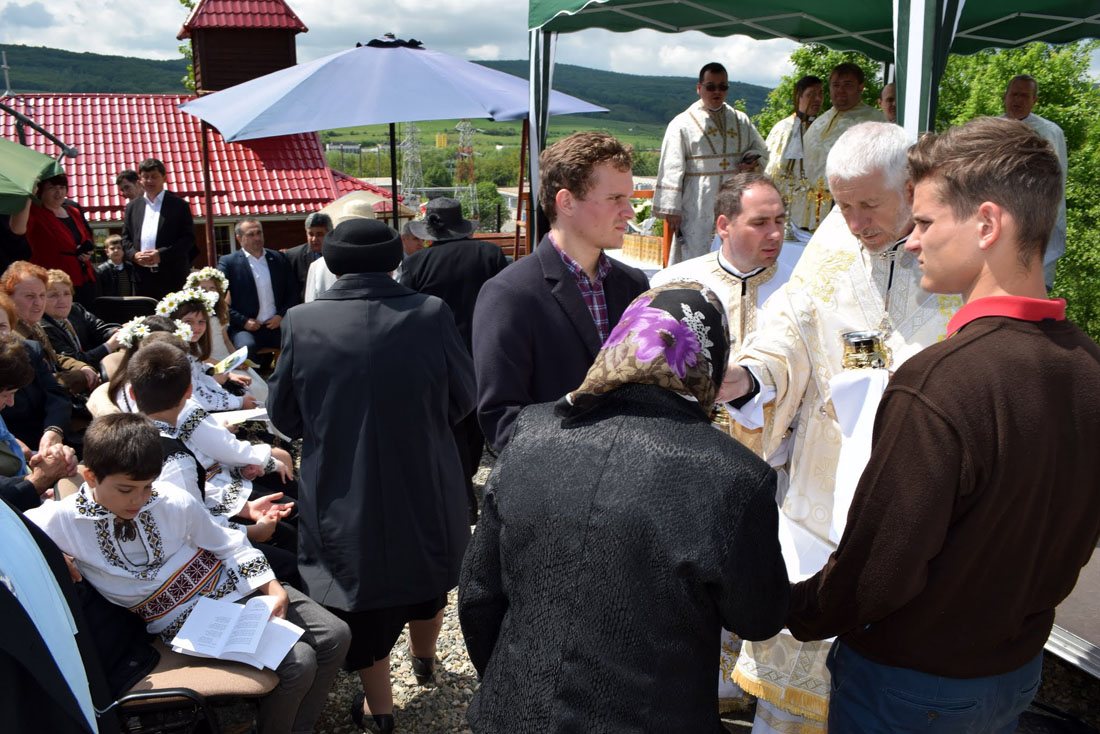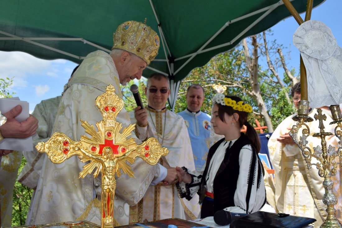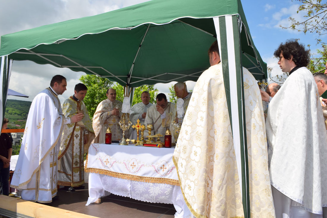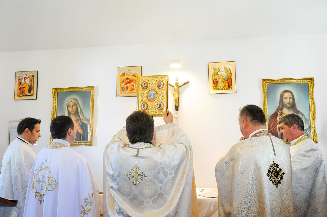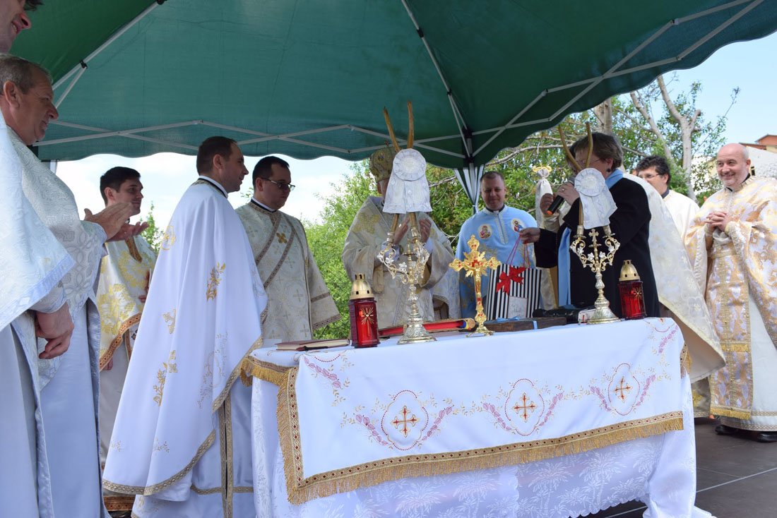 Episcopul eparhial a fost întâmpinat cu bucurie de preoți și credincioși, mai ales de cei șase copii frumos înveșmântați în strai popular, în mâini cu buchete de flori pe care i le-au oferit cu dedicația: „cules-am din holdele verzi, buchete de flori mititele, primiți-le însă cu drag, vă rugăm, căci dragostea noastră e-n ele”. După un cuvânt de întâmpinare a pr. paroh și un salut al Ierarhului, au urmat Sfânta Liturghie și ceremonia de binecuvântare celebrate în aer liber, pe placa de bază a bisericii al cărei demisol este deja realizat. Cuvântul de învățătură al Ierarhului a cuprins meditarea fragmentului evanghelic despre femeile purtătoare de mir care au plecat „dis de dimineață” acolo unde credeau că îl vor găsi pe Isus mort, dar nu l-au găsit, iar un înger li s-a arătat spunându-le: „A înviat! Nu este aici.”