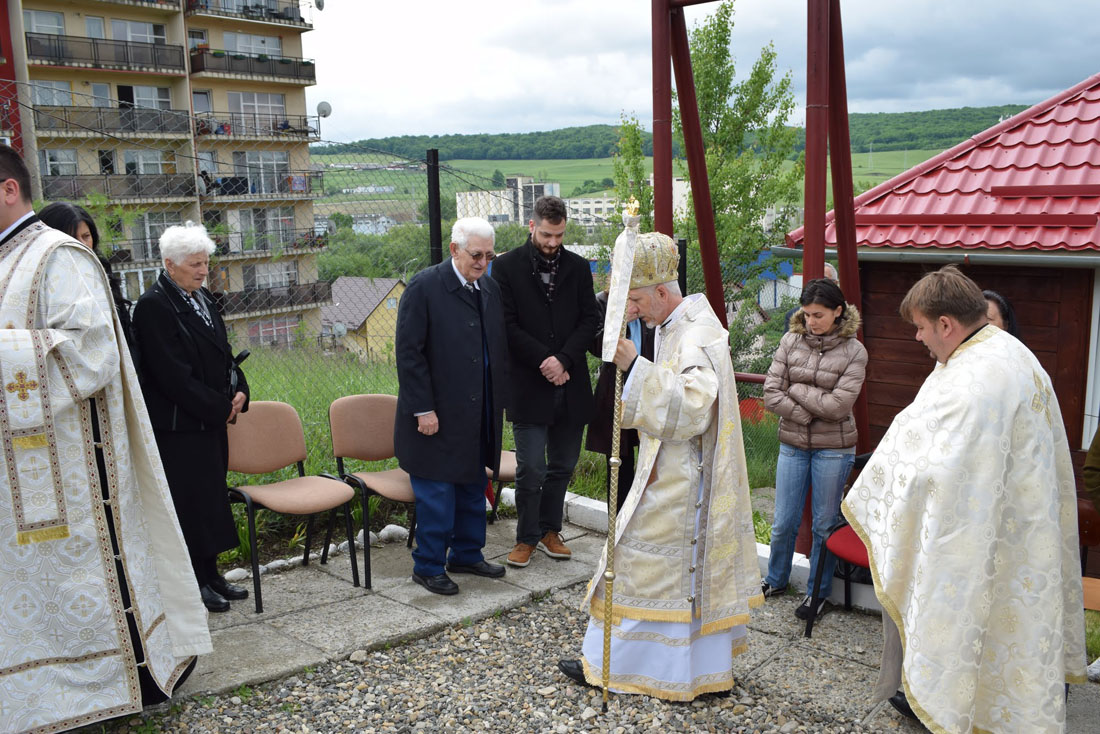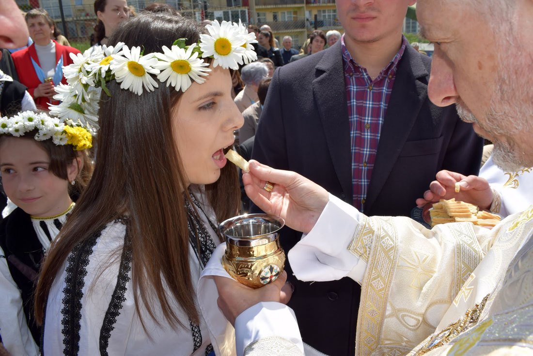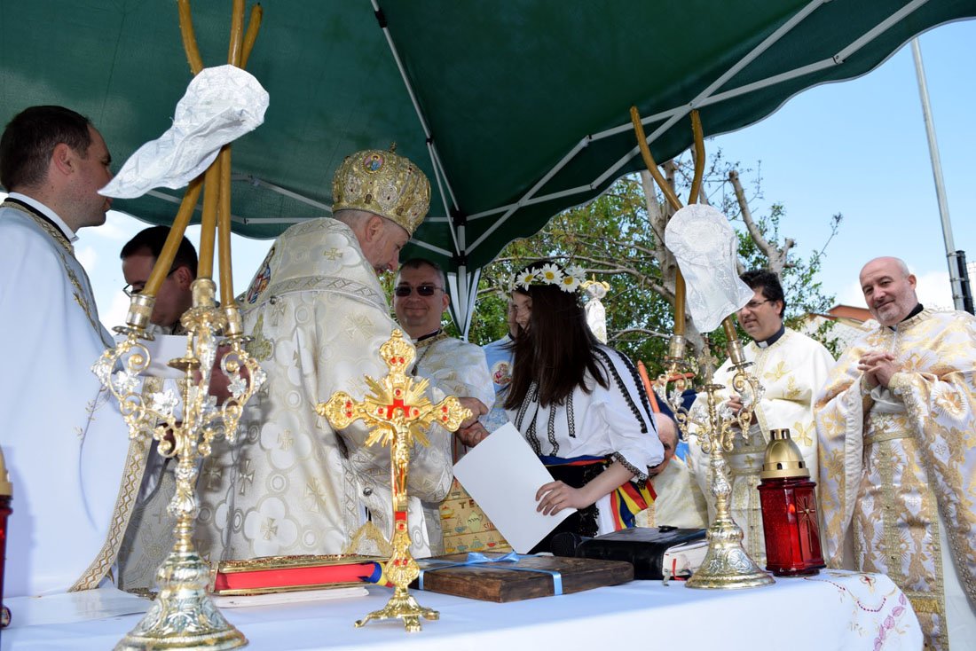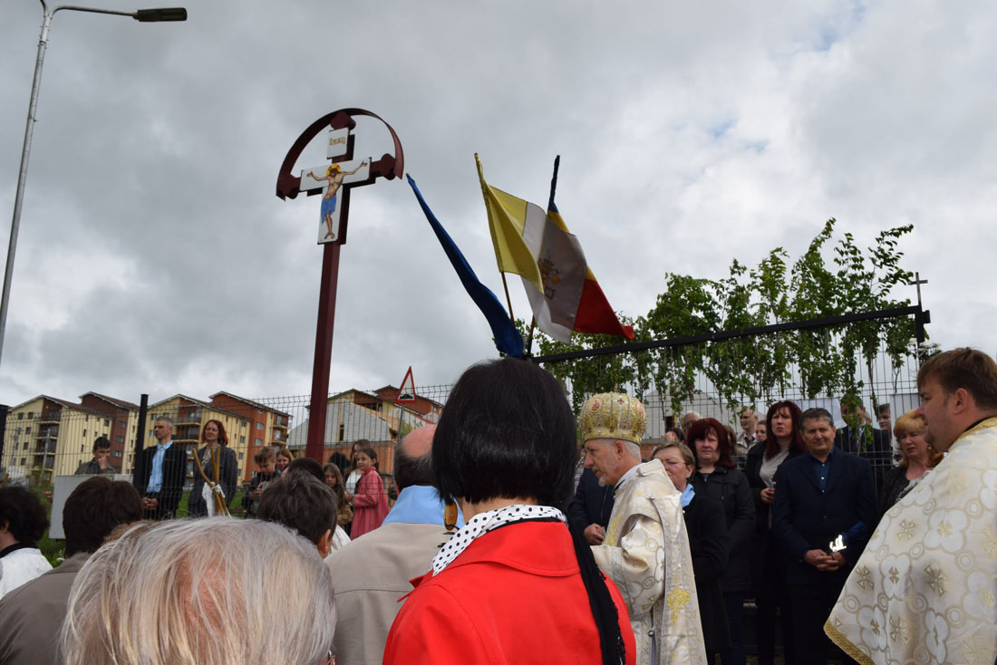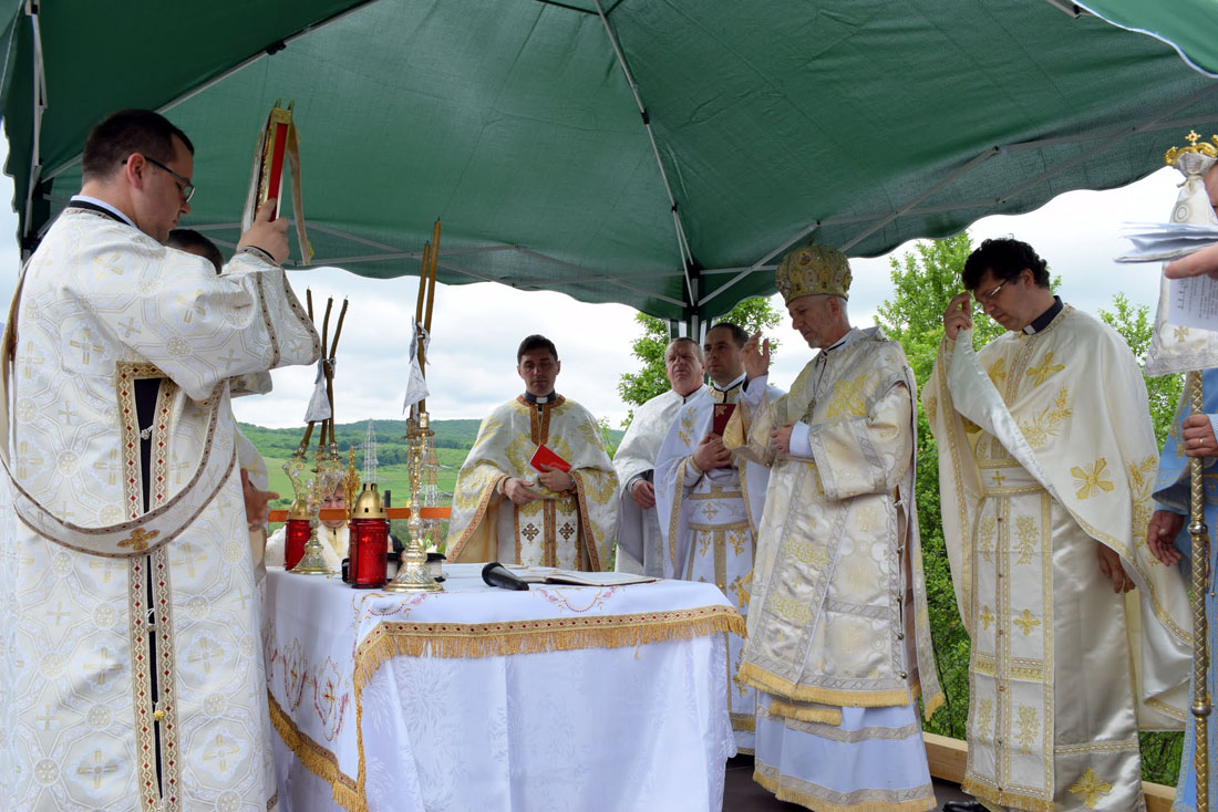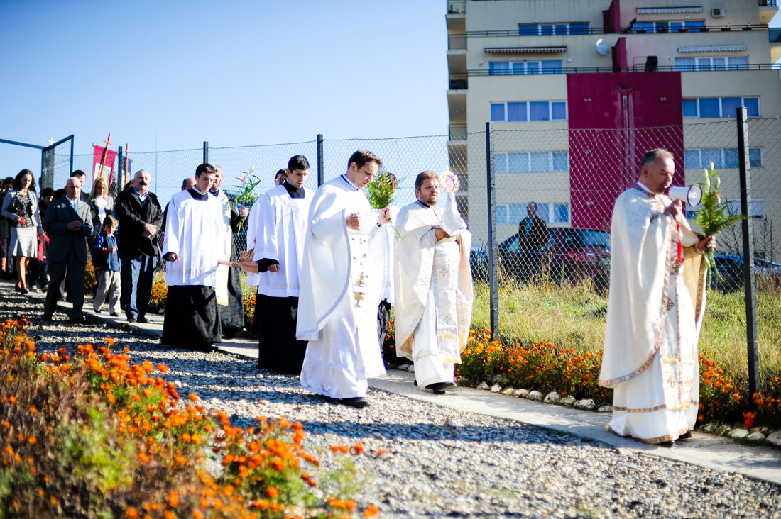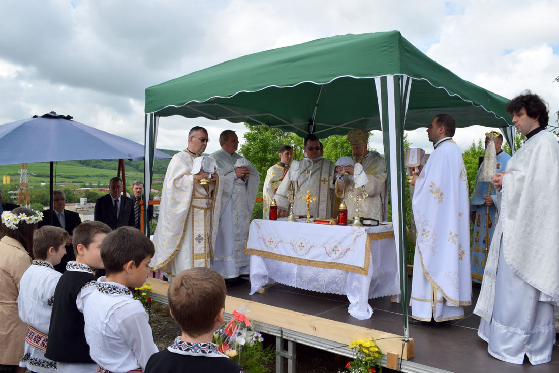 Episcopul eparhial a fost întâmpinat cu bucurie de preoți și credincioși, mai ales de cei șase copii frumos înveșmântați în strai popular, în mâini cu buchete de flori pe care i le-au oferit cu dedicația: „cules-am din holdele verzi, buchete de flori mititele, primiți-le însă cu drag, vă rugăm, căci dragostea noastră e-n ele”. După un cuvânt de întâmpinare a pr. paroh și un salut al Ierarhului, au urmat Sfânta Liturghie și ceremonia de binecuvântare celebrate în aer liber, pe placa de bază a bisericii al cărei demisol este deja realizat. Cuvântul de învățătură al Ierarhului a cuprins meditarea fragmentului evanghelic despre femeile purtătoare de mir care au plecat „dis de dimineață” acolo unde credeau că îl vor găsi pe Isus mort, dar nu l-au găsit, iar un înger li s-a arătat spunându-le: „A înviat! Nu este aici.”
