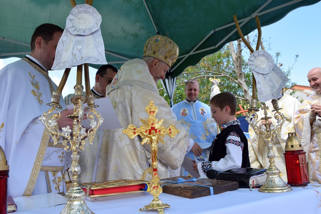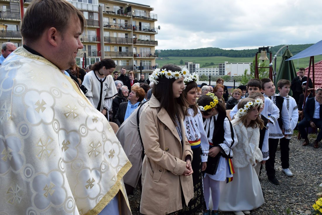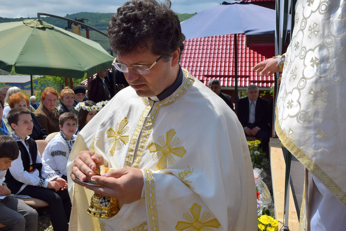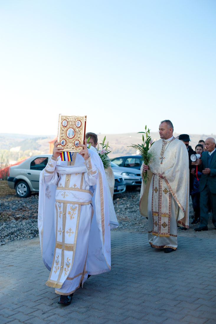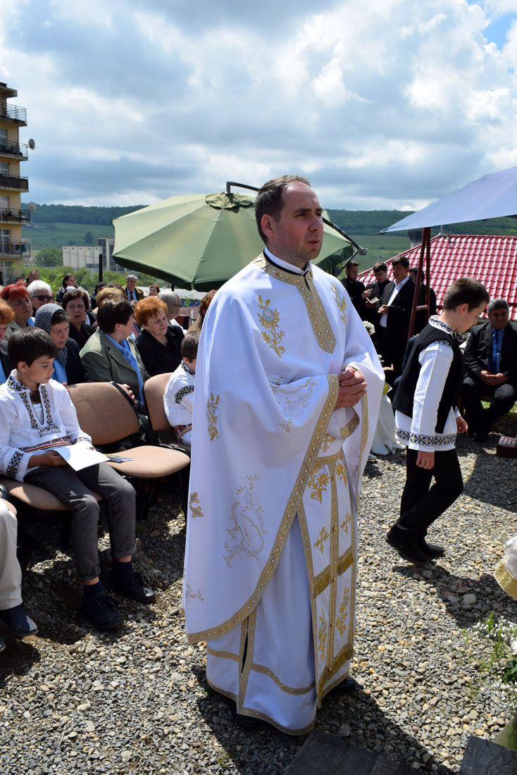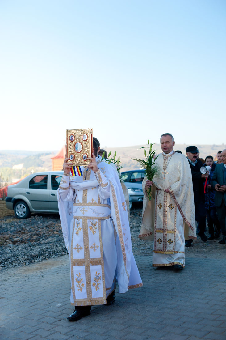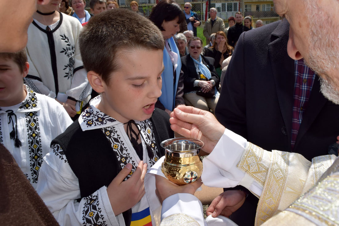 Episcopul eparhial a fost întâmpinat cu bucurie de preoți și credincioși, mai ales de cei șase copii frumos înveșmântați în strai popular, în mâini cu buchete de flori pe care i le-au oferit cu dedicația: „cules-am din holdele verzi, buchete de flori mititele, primiți-le însă cu drag, vă rugăm, căci dragostea noastră e-n ele”. După un cuvânt de întâmpinare a pr. paroh și un salut al Ierarhului, au urmat Sfânta Liturghie și ceremonia de binecuvântare celebrate în aer liber, pe placa de bază a bisericii al cărei demisol este deja realizat. Cuvântul de învățătură al Ierarhului a cuprins meditarea fragmentului evanghelic despre femeile purtătoare de mir care au plecat „dis de dimineață” acolo unde credeau că îl vor găsi pe Isus mort, dar nu l-au găsit, iar un înger li s-a arătat spunându-le: „A înviat! Nu este aici.”