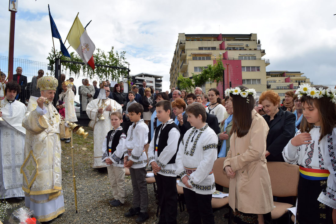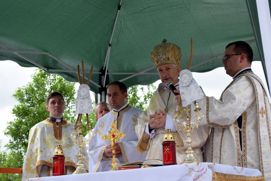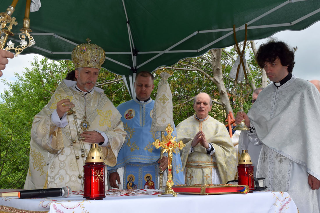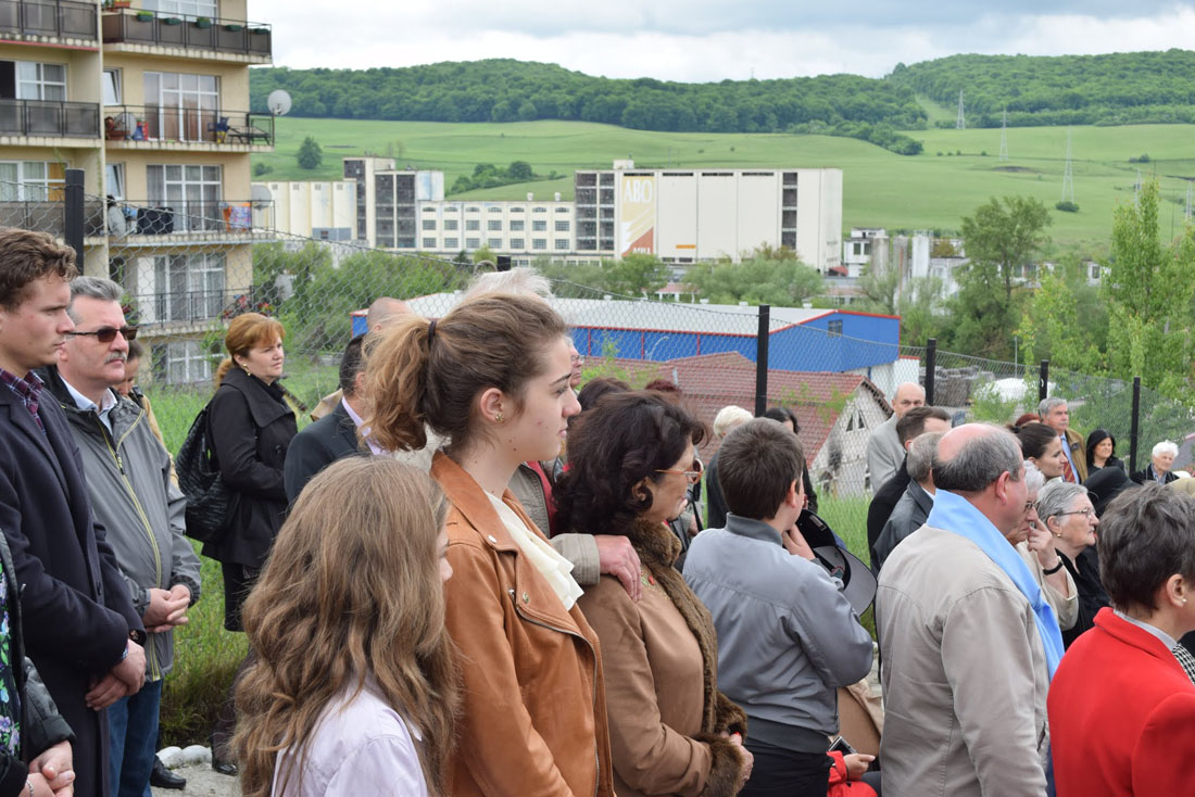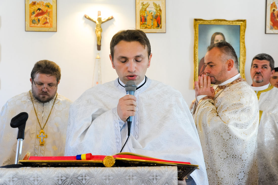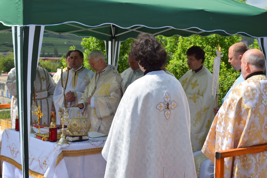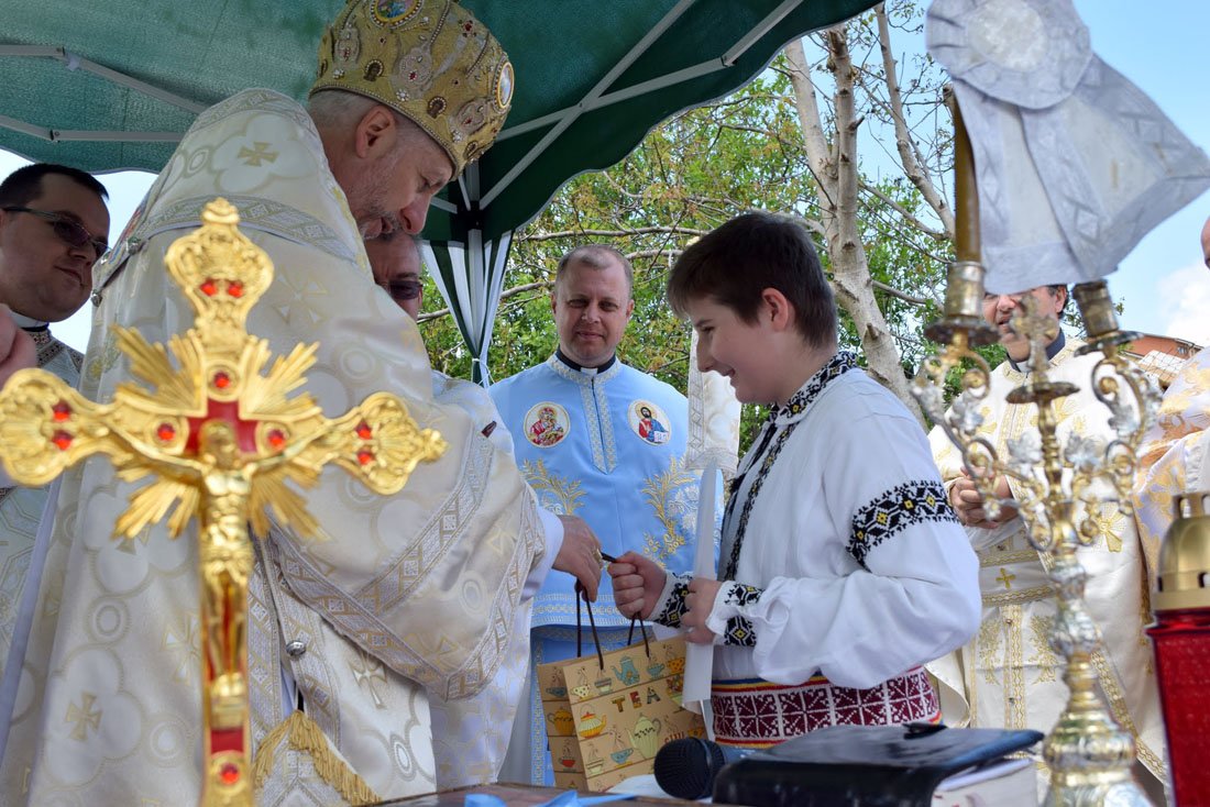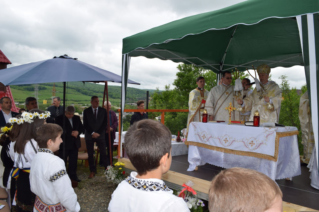 Episcopul eparhial a fost întâmpinat cu bucurie de preoți și credincioși, mai ales de cei șase copii frumos înveșmântați în strai popular, în mâini cu buchete de flori pe care i le-au oferit cu dedicația: „cules-am din holdele verzi, buchete de flori mititele, primiți-le însă cu drag, vă rugăm, căci dragostea noastră e-n ele”. După un cuvânt de întâmpinare a pr. paroh și un salut al Ierarhului, au urmat Sfânta Liturghie și ceremonia de binecuvântare celebrate în aer liber, pe placa de bază a bisericii al cărei demisol este deja realizat. Cuvântul de învățătură al Ierarhului a cuprins meditarea fragmentului evanghelic despre femeile purtătoare de mir care au plecat „dis de dimineață” acolo unde credeau că îl vor găsi pe Isus mort, dar nu l-au găsit, iar un înger li s-a arătat spunându-le: „A înviat! Nu este aici.”
