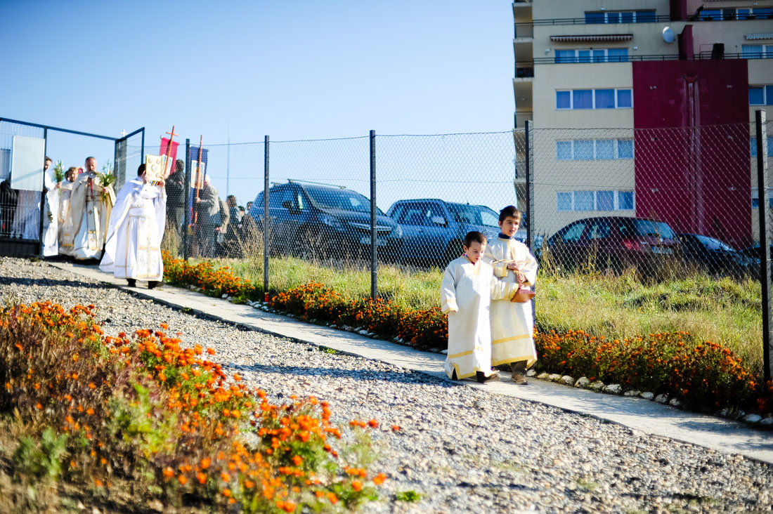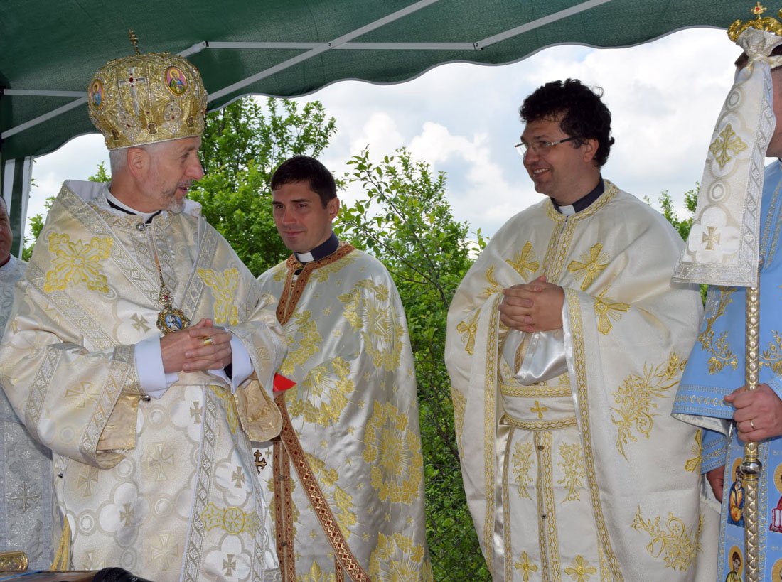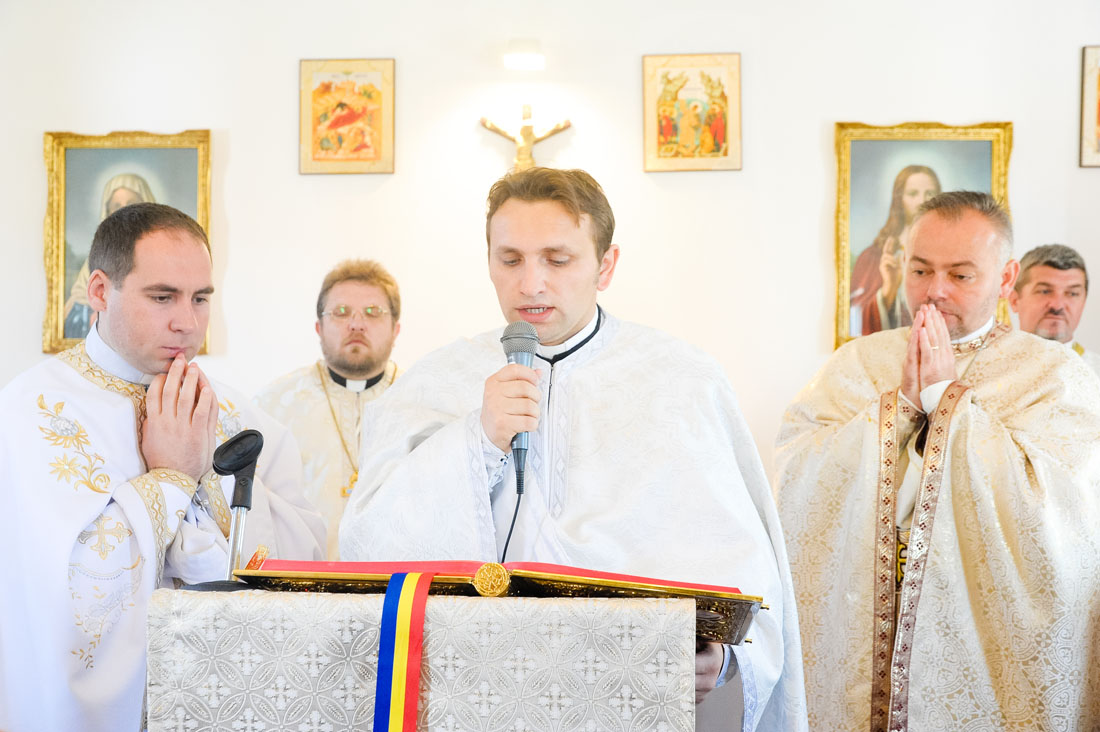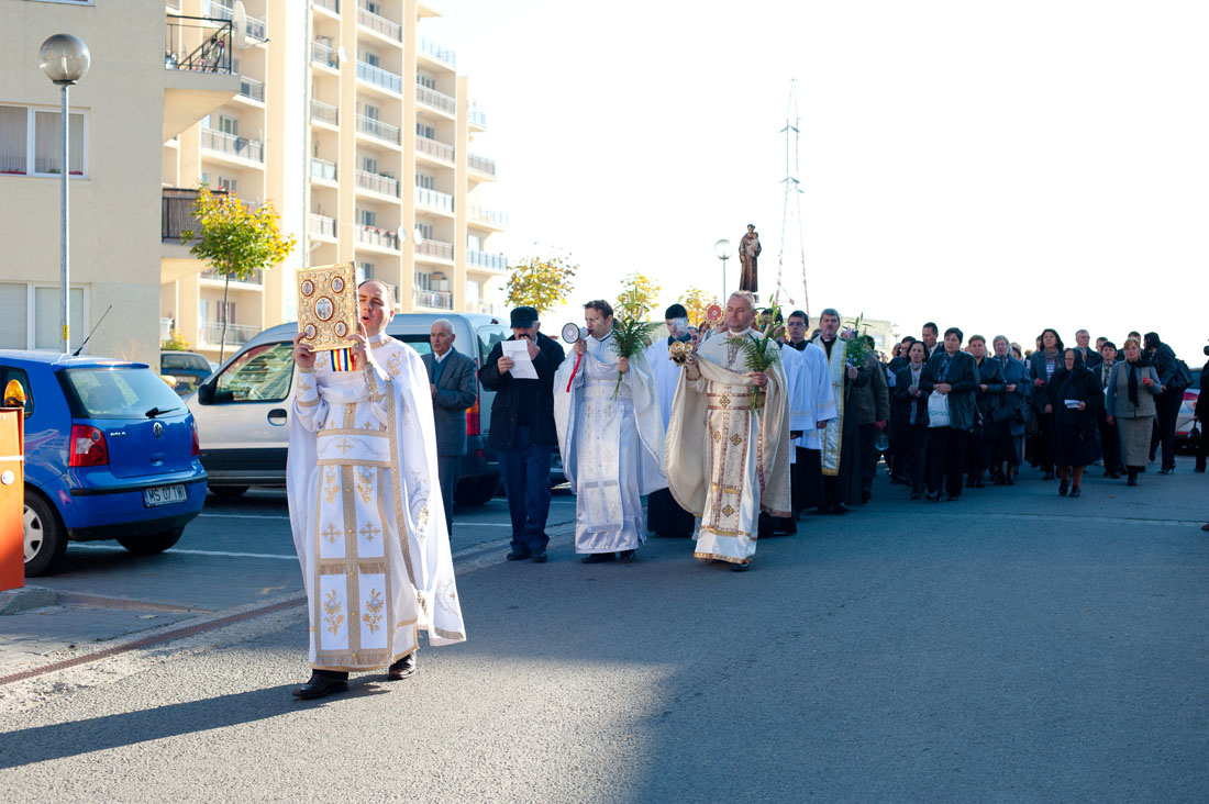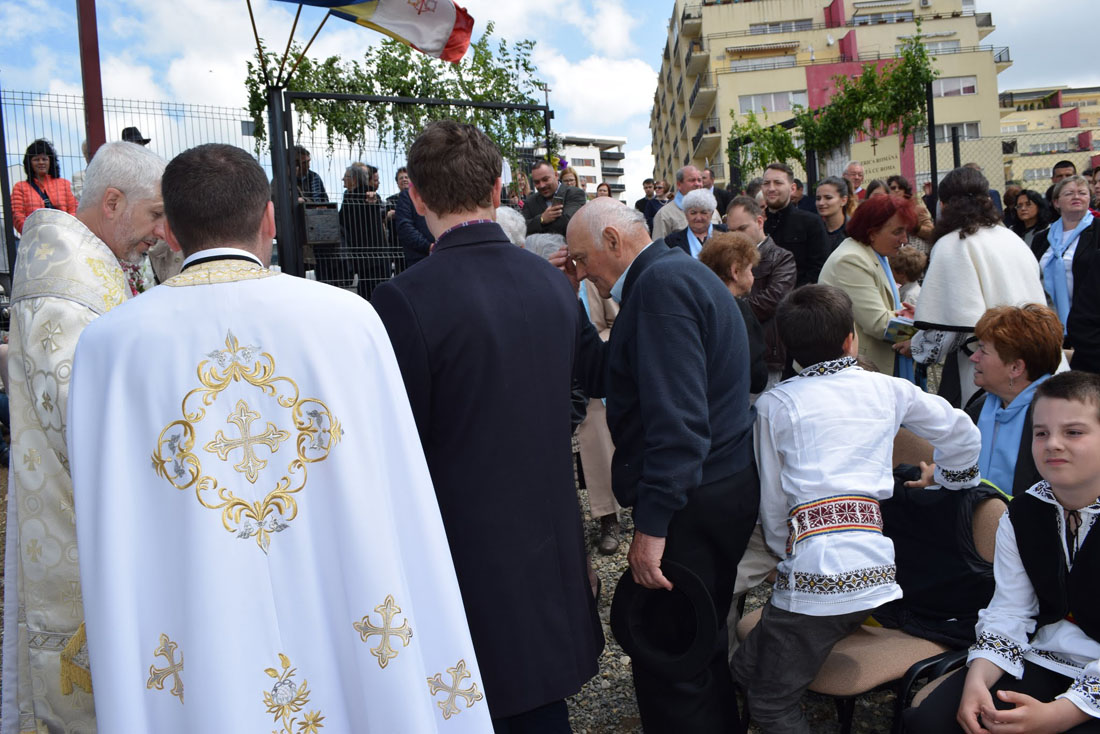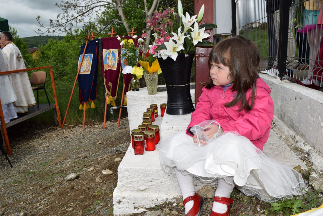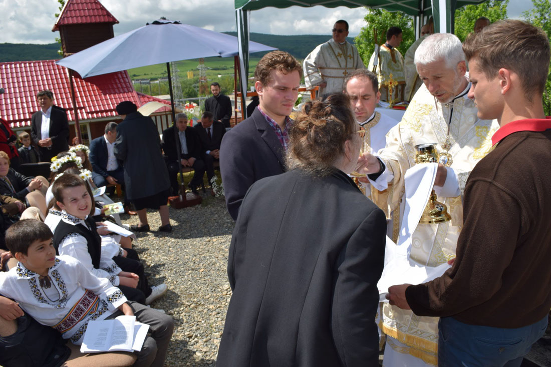 Episcopul eparhial a fost întâmpinat cu bucurie de preoți și credincioși, mai ales de cei șase copii frumos înveșmântați în strai popular, în mâini cu buchete de flori pe care i le-au oferit cu dedicația: „cules-am din holdele verzi, buchete de flori mititele, primiți-le însă cu drag, vă rugăm, căci dragostea noastră e-n ele”. După un cuvânt de întâmpinare a pr. paroh și un salut al Ierarhului, au urmat Sfânta Liturghie și ceremonia de binecuvântare celebrate în aer liber, pe placa de bază a bisericii al cărei demisol este deja realizat. Cuvântul de învățătură al Ierarhului a cuprins meditarea fragmentului evanghelic despre femeile purtătoare de mir care au plecat „dis de dimineață” acolo unde credeau că îl vor găsi pe Isus mort, dar nu l-au găsit, iar un înger li s-a arătat spunându-le: „A înviat! Nu este aici.”