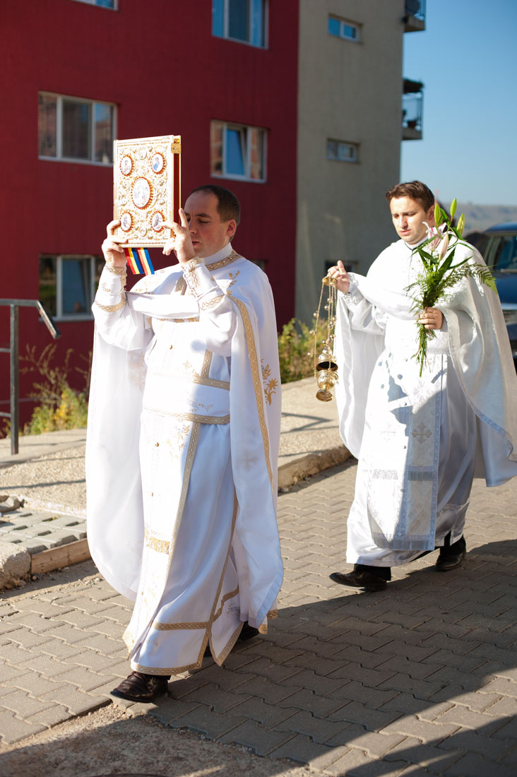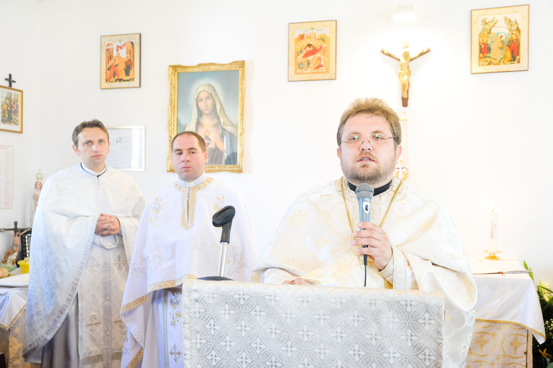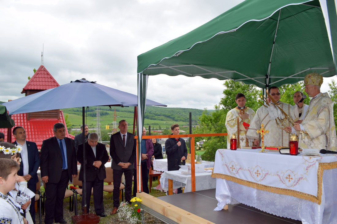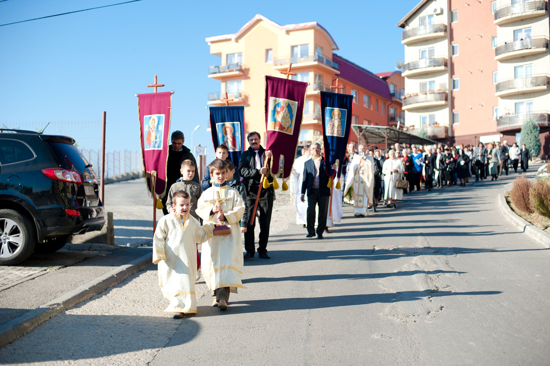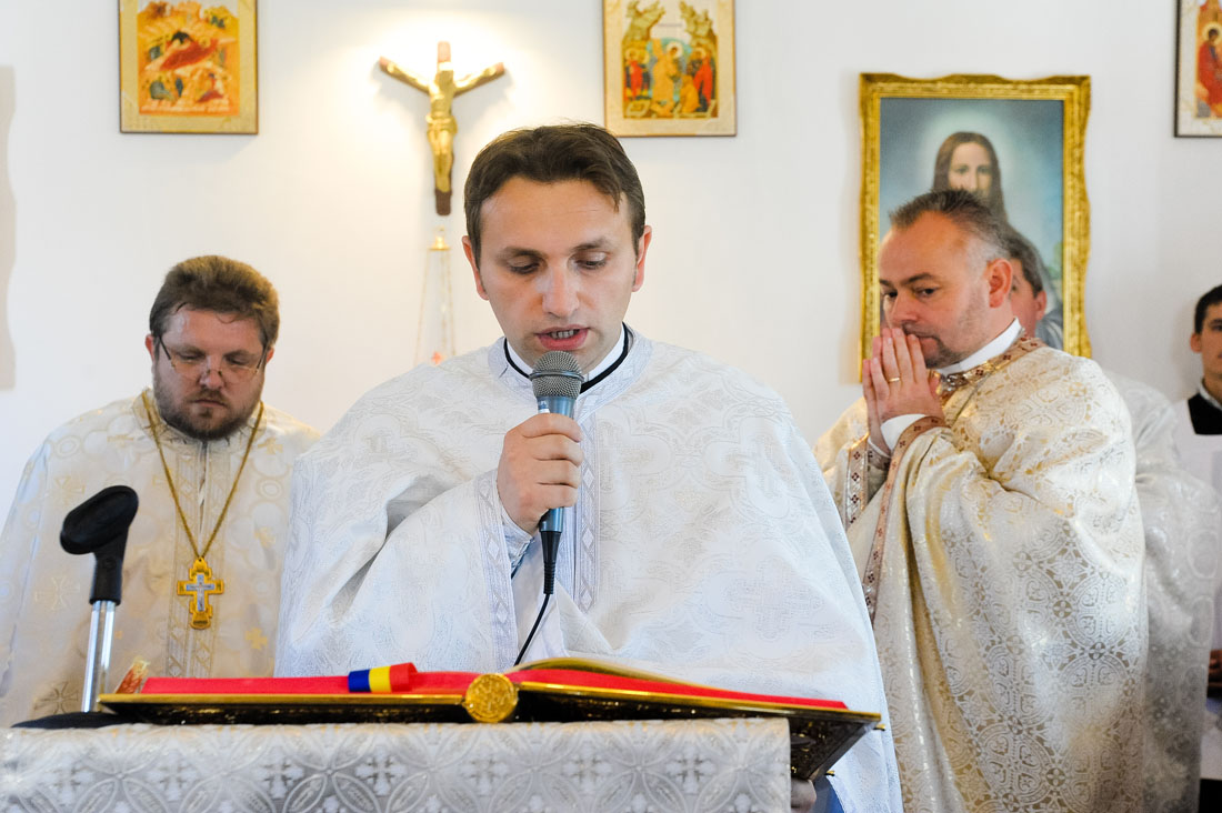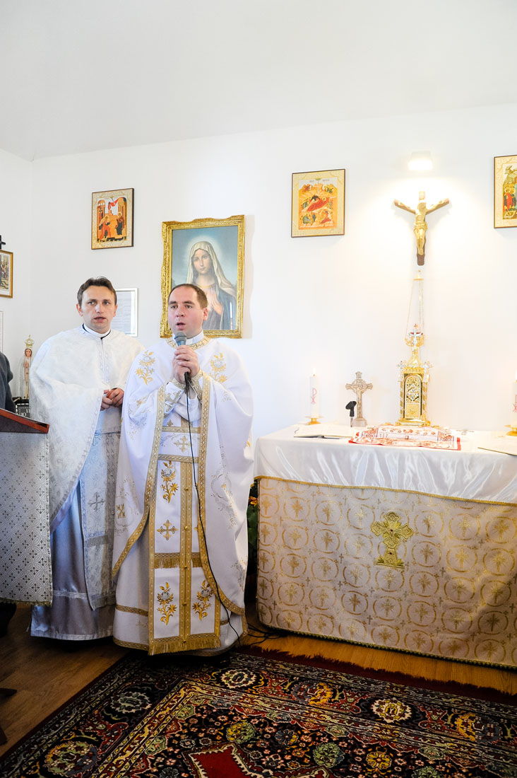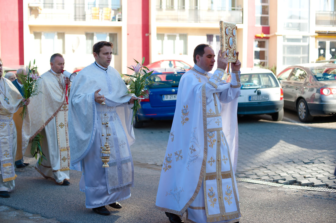 Episcopul eparhial a fost întâmpinat cu bucurie de preoți și credincioși, mai ales de cei șase copii frumos înveșmântați în strai popular, în mâini cu buchete de flori pe care i le-au oferit cu dedicația: „cules-am din holdele verzi, buchete de flori mititele, primiți-le însă cu drag, vă rugăm, căci dragostea noastră e-n ele”. După un cuvânt de întâmpinare a pr. paroh și un salut al Ierarhului, au urmat Sfânta Liturghie și ceremonia de binecuvântare celebrate în aer liber, pe placa de bază a bisericii al cărei demisol este deja realizat. Cuvântul de învățătură al Ierarhului a cuprins meditarea fragmentului evanghelic despre femeile purtătoare de mir care au plecat „dis de dimineață” acolo unde credeau că îl vor găsi pe Isus mort, dar nu l-au găsit, iar un înger li s-a arătat spunându-le: „A înviat! Nu este aici.”