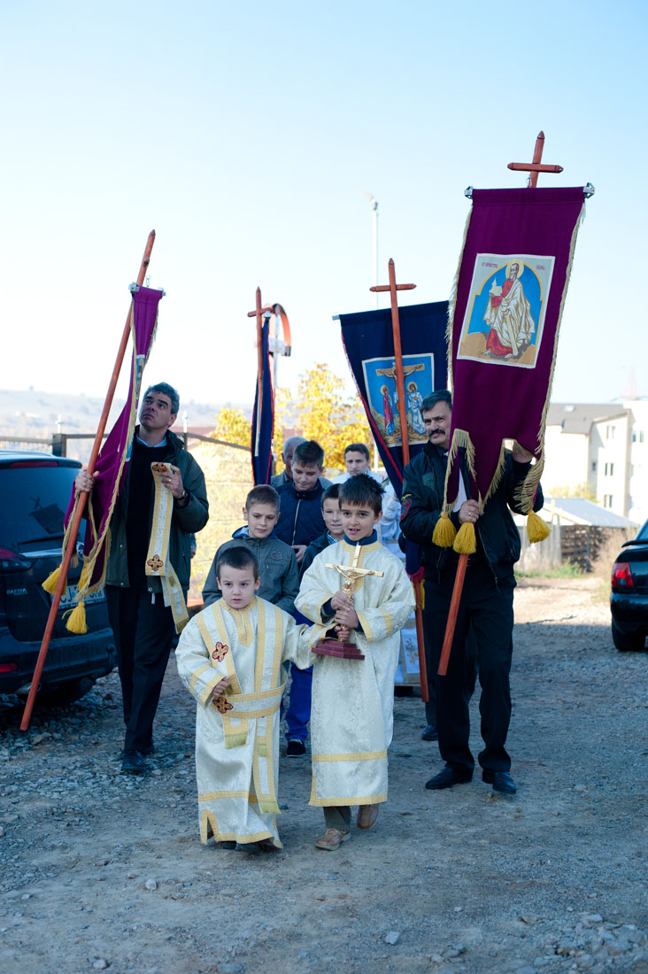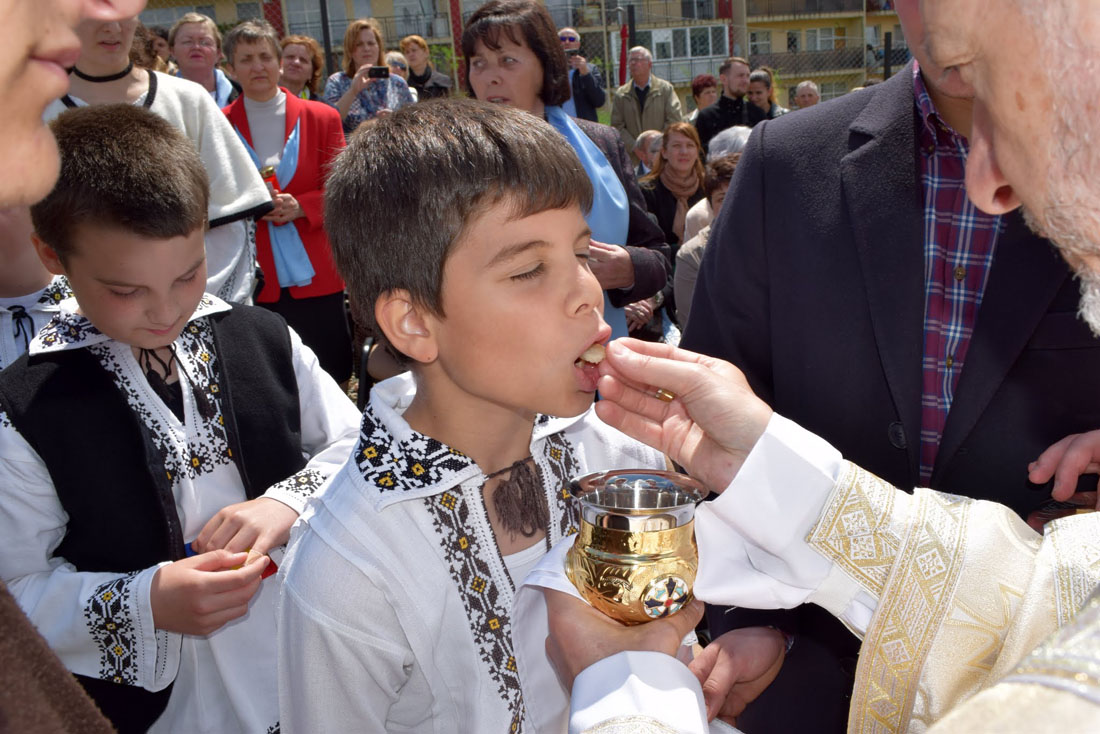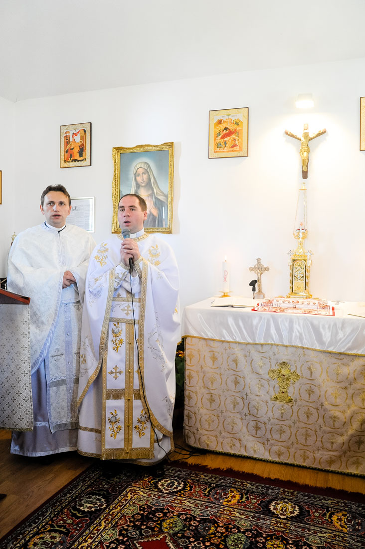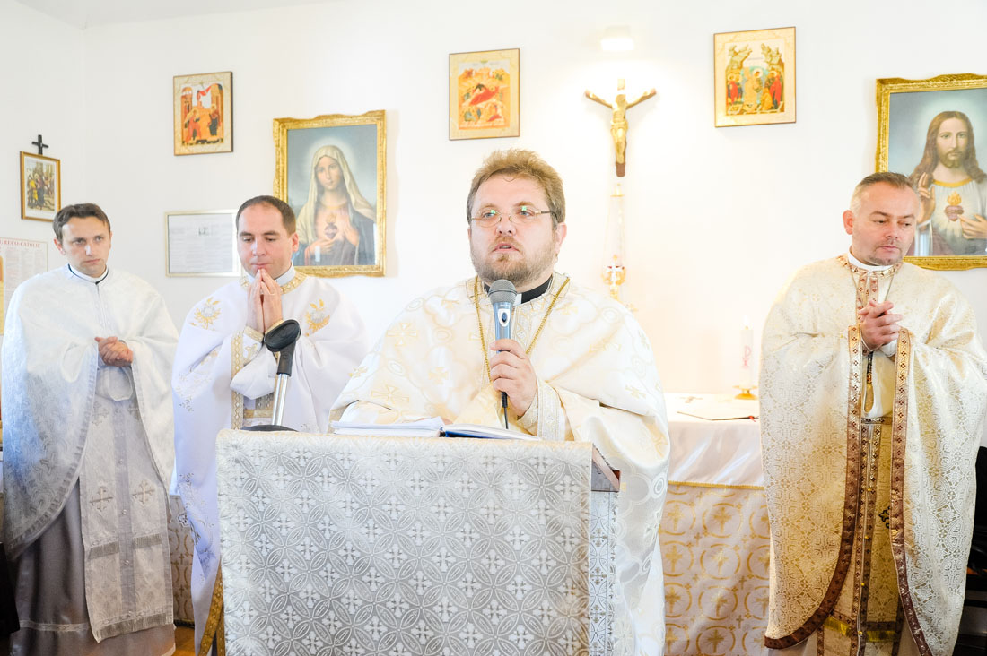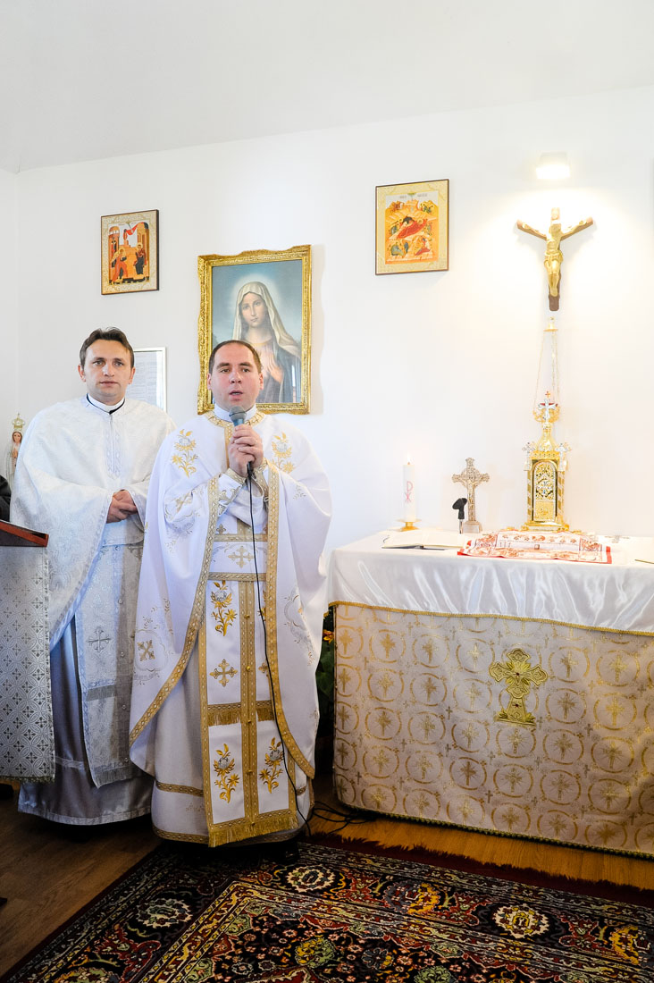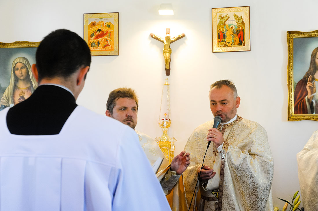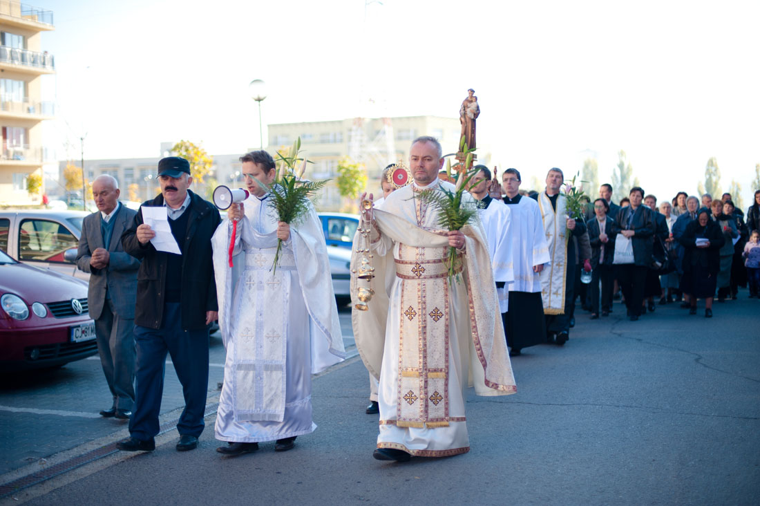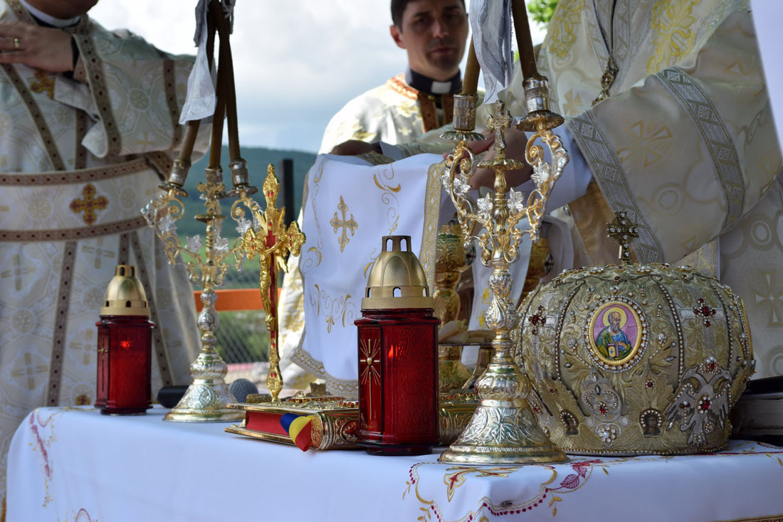 Episcopul eparhial a fost întâmpinat cu bucurie de preoți și credincioși, mai ales de cei șase copii frumos înveșmântați în strai popular, în mâini cu buchete de flori pe care i le-au oferit cu dedicația: „cules-am din holdele verzi, buchete de flori mititele, primiți-le însă cu drag, vă rugăm, căci dragostea noastră e-n ele”. După un cuvânt de întâmpinare a pr. paroh și un salut al Ierarhului, au urmat Sfânta Liturghie și ceremonia de binecuvântare celebrate în aer liber, pe placa de bază a bisericii al cărei demisol este deja realizat. Cuvântul de învățătură al Ierarhului a cuprins meditarea fragmentului evanghelic despre femeile purtătoare de mir care au plecat „dis de dimineață” acolo unde credeau că îl vor găsi pe Isus mort, dar nu l-au găsit, iar un înger li s-a arătat spunându-le: „A înviat! Nu este aici.”