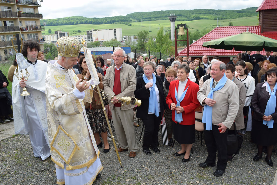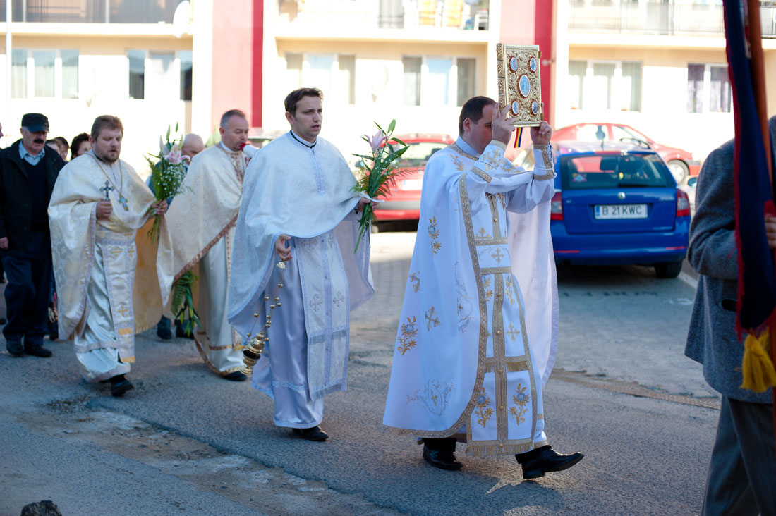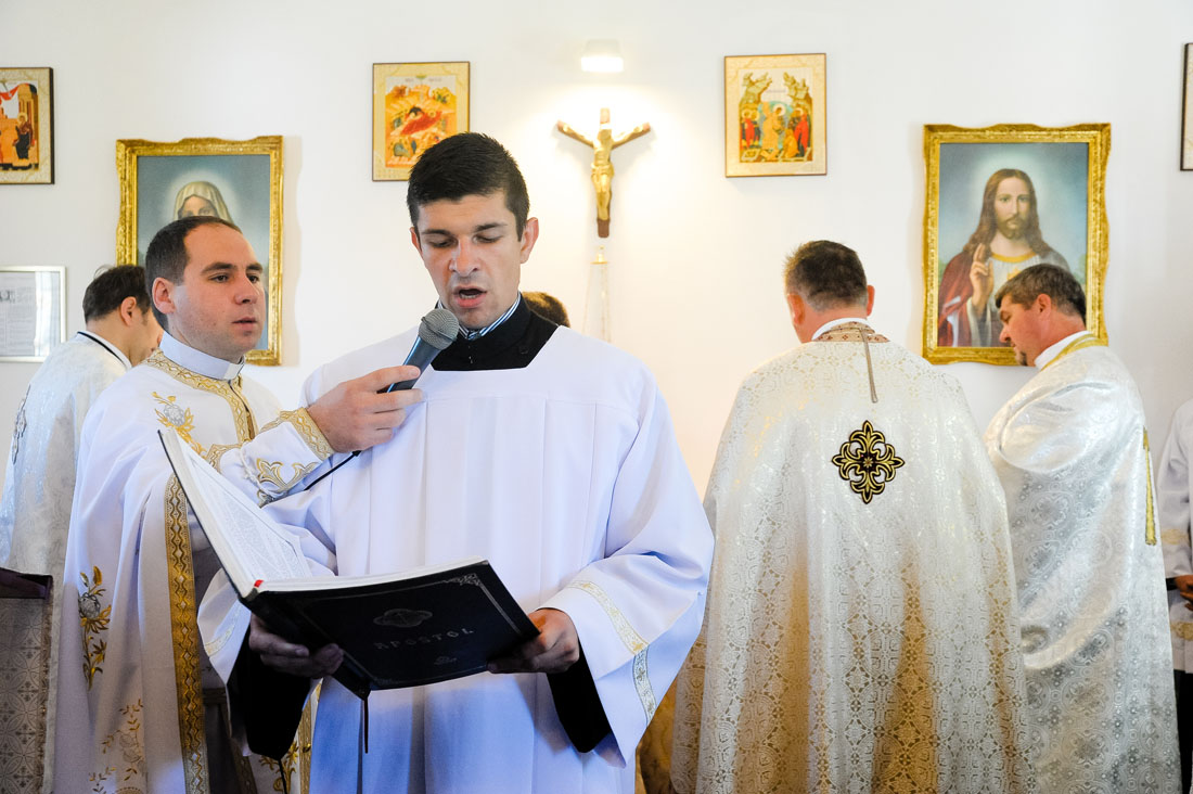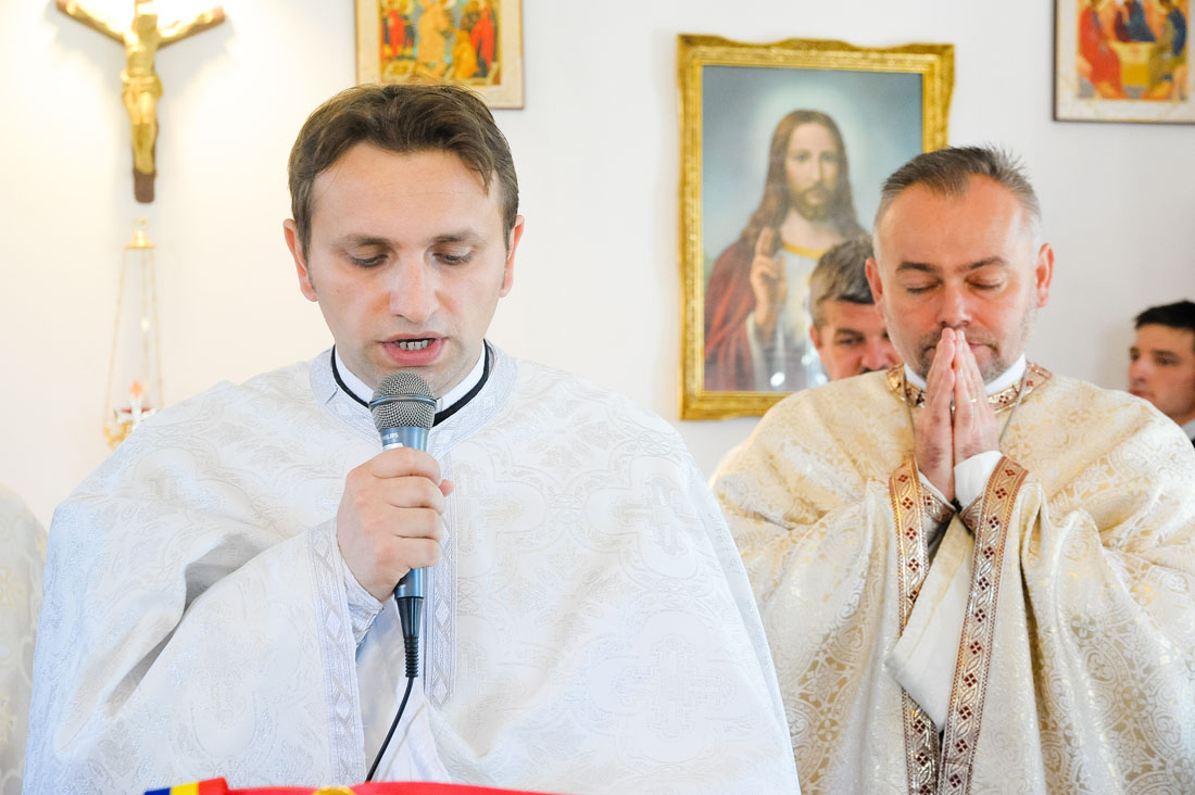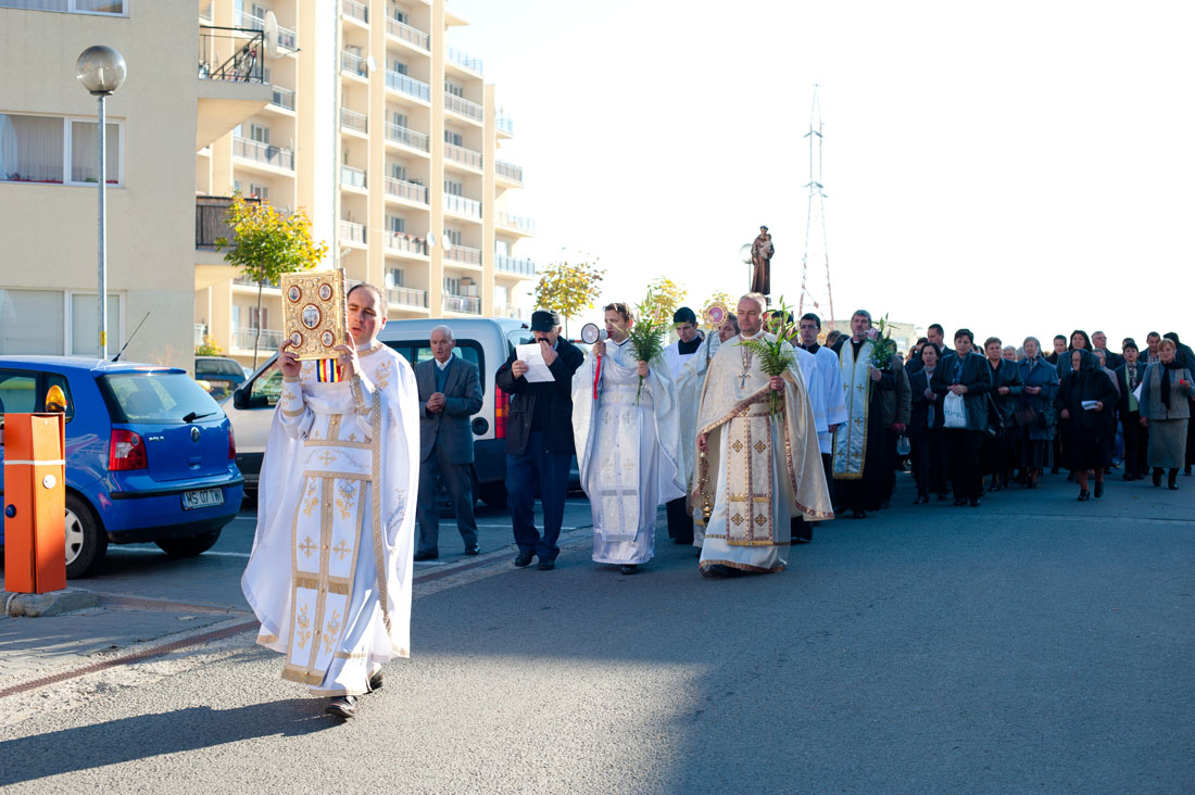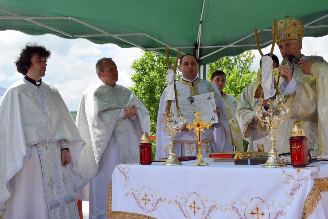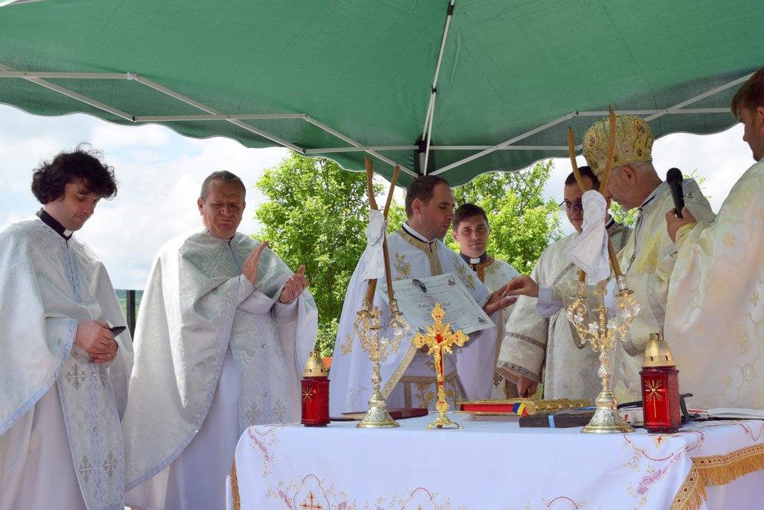 Episcopul eparhial a fost întâmpinat cu bucurie de preoți și credincioși, mai ales de cei șase copii frumos înveșmântați în strai popular, în mâini cu buchete de flori pe care i le-au oferit cu dedicația: „cules-am din holdele verzi, buchete de flori mititele, primiți-le însă cu drag, vă rugăm, căci dragostea noastră e-n ele”. După un cuvânt de întâmpinare a pr. paroh și un salut al Ierarhului, au urmat Sfânta Liturghie și ceremonia de binecuvântare celebrate în aer liber, pe placa de bază a bisericii al cărei demisol este deja realizat. Cuvântul de învățătură al Ierarhului a cuprins meditarea fragmentului evanghelic despre femeile purtătoare de mir care au plecat „dis de dimineață” acolo unde credeau că îl vor găsi pe Isus mort, dar nu l-au găsit, iar un înger li s-a arătat spunându-le: „A înviat! Nu este aici.”