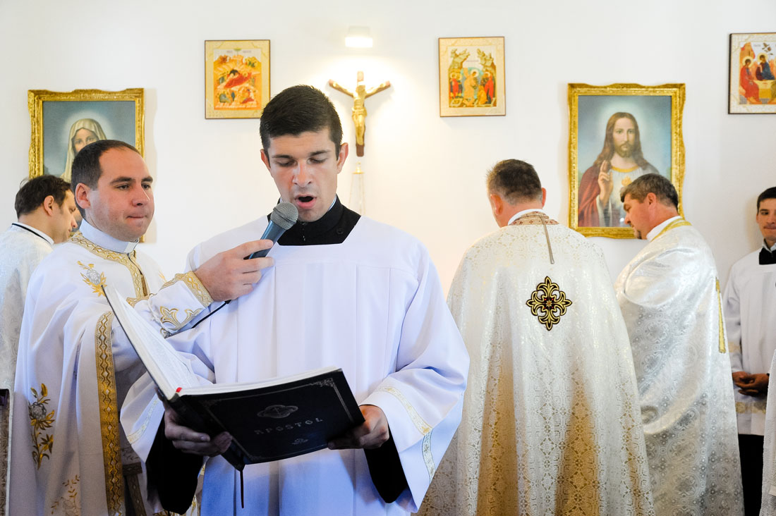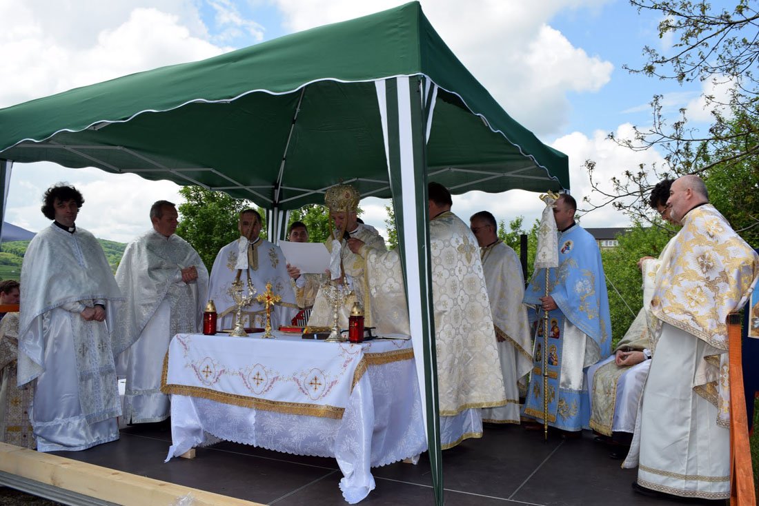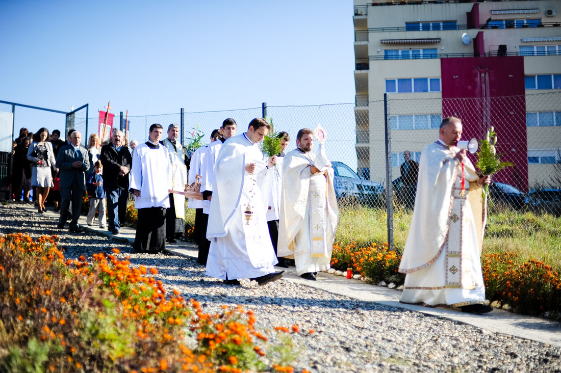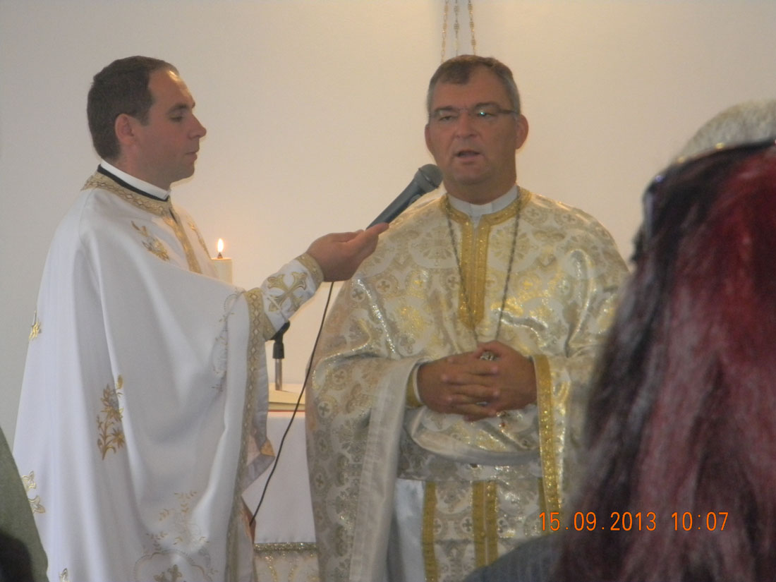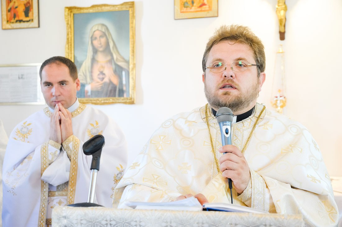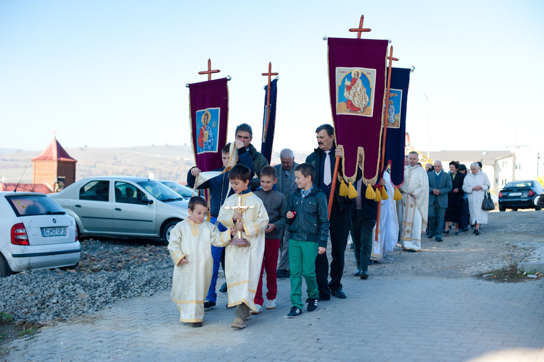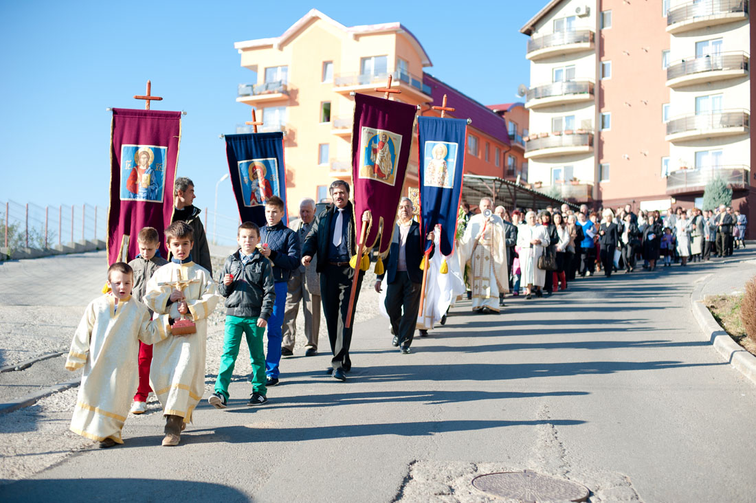 Episcopul eparhial a fost întâmpinat cu bucurie de preoți și credincioși, mai ales de cei șase copii frumos înveșmântați în strai popular, în mâini cu buchete de flori pe care i le-au oferit cu dedicația: „cules-am din holdele verzi, buchete de flori mititele, primiți-le însă cu drag, vă rugăm, căci dragostea noastră e-n ele”. După un cuvânt de întâmpinare a pr. paroh și un salut al Ierarhului, au urmat Sfânta Liturghie și ceremonia de binecuvântare celebrate în aer liber, pe placa de bază a bisericii al cărei demisol este deja realizat. Cuvântul de învățătură al Ierarhului a cuprins meditarea fragmentului evanghelic despre femeile purtătoare de mir care au plecat „dis de dimineață” acolo unde credeau că îl vor găsi pe Isus mort, dar nu l-au găsit, iar un înger li s-a arătat spunându-le: „A înviat! Nu este aici.”