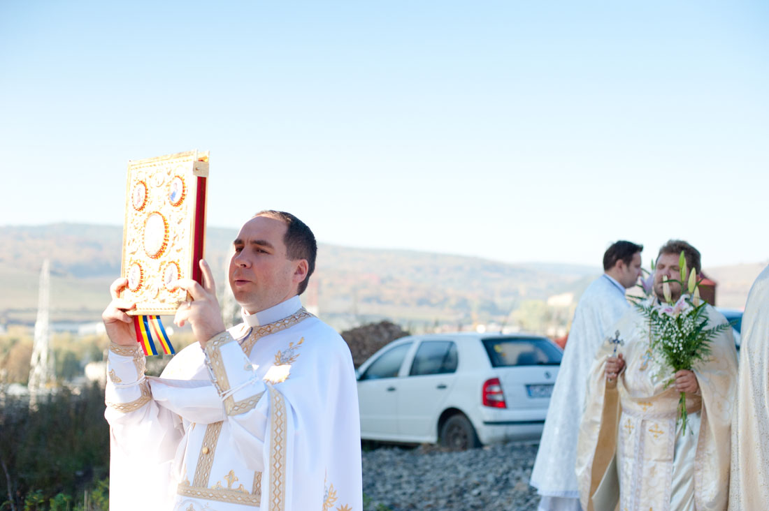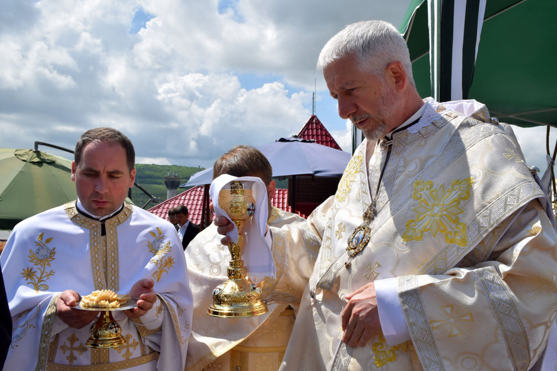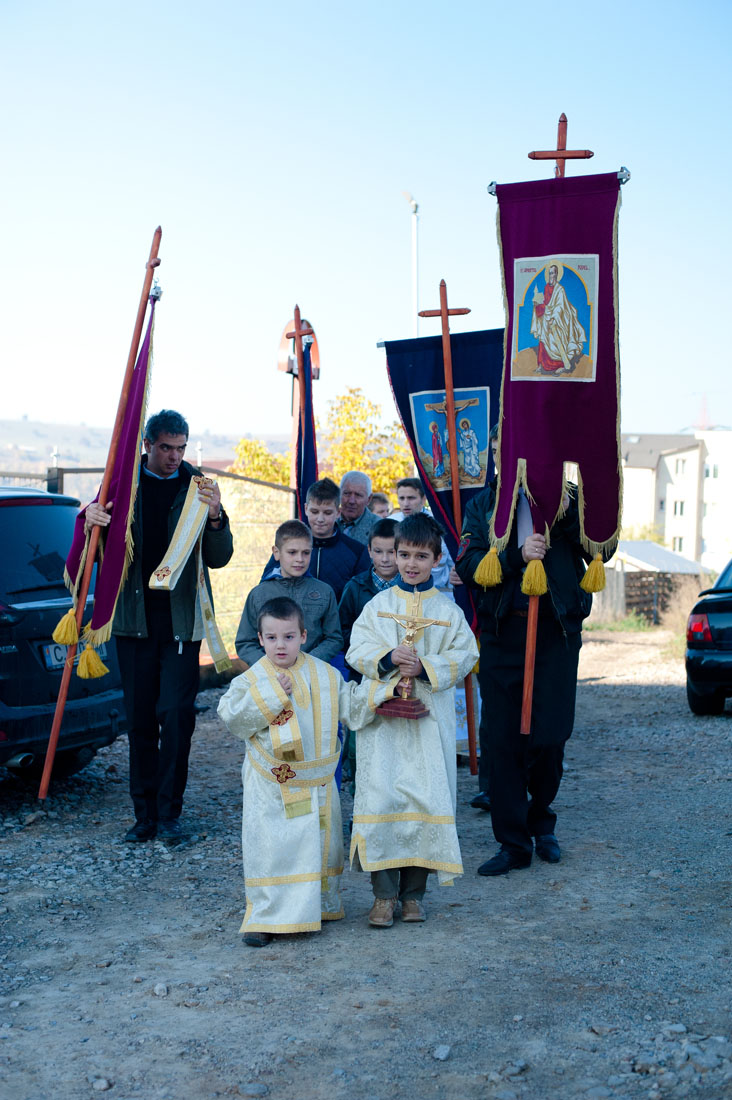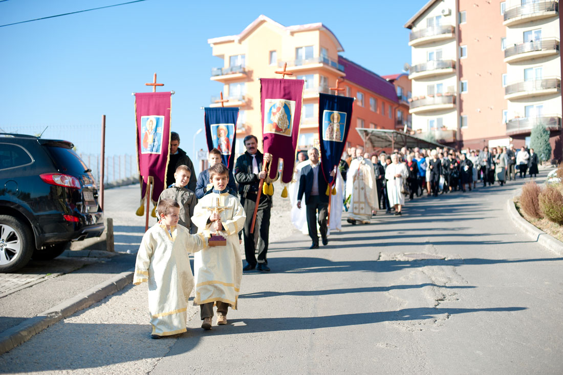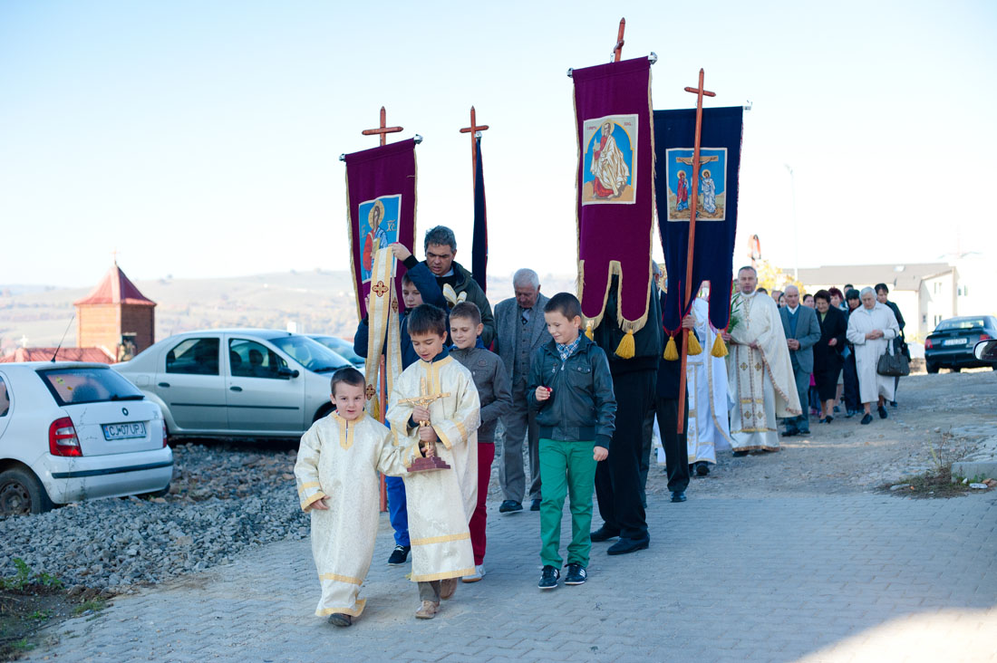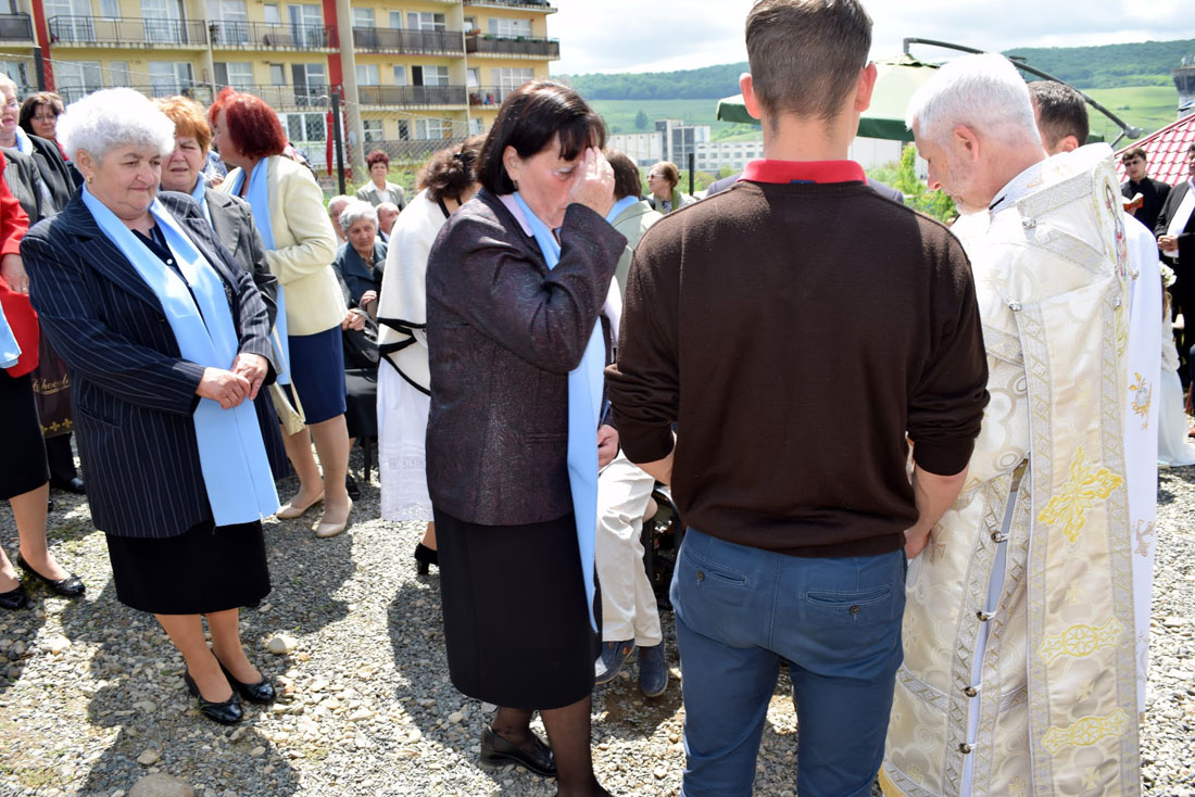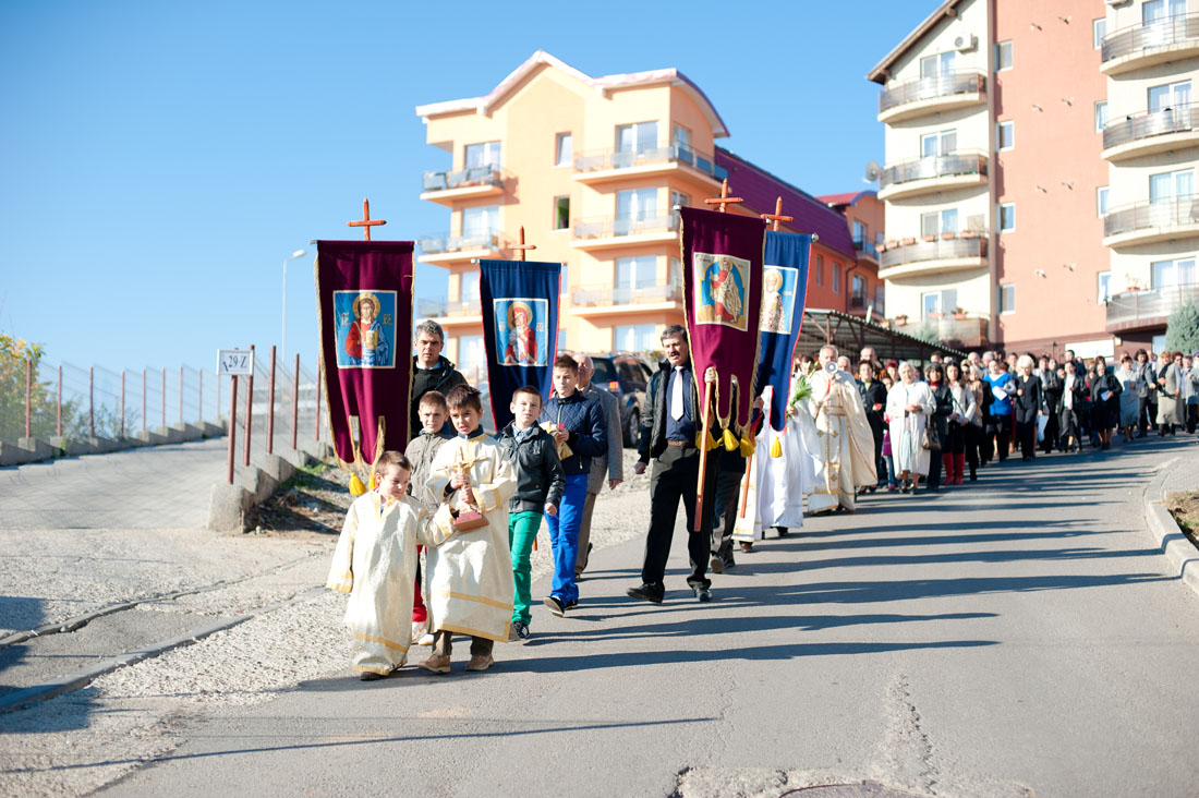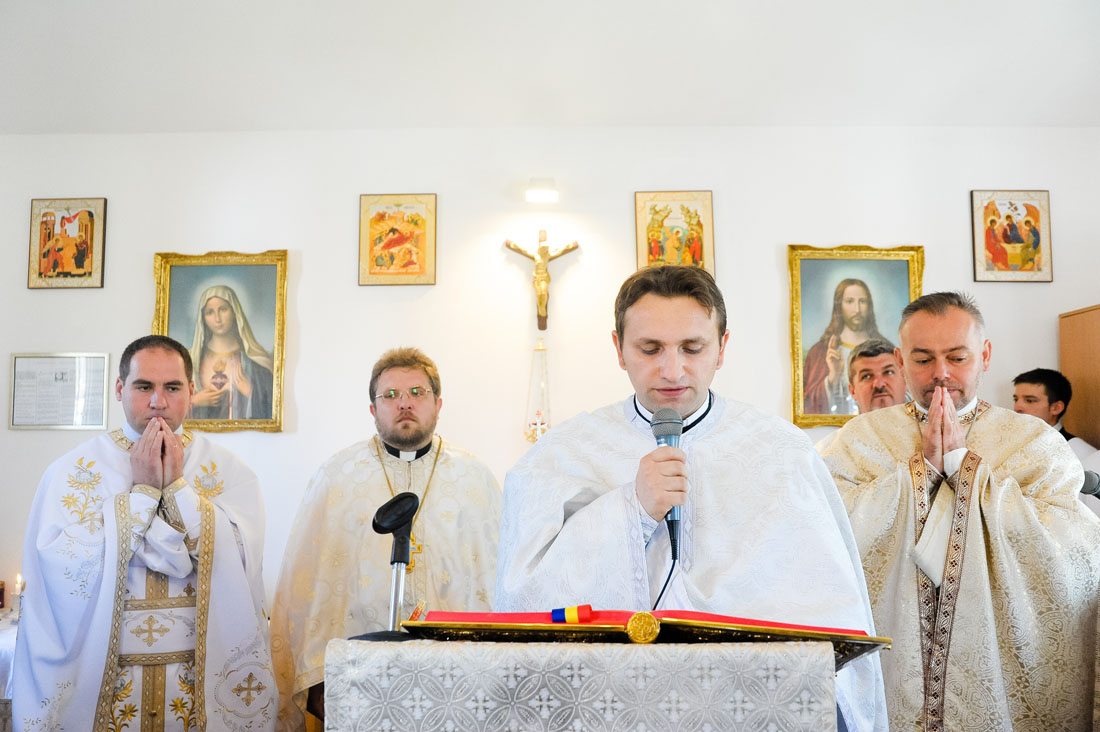 Episcopul eparhial a fost întâmpinat cu bucurie de preoți și credincioși, mai ales de cei șase copii frumos înveșmântați în strai popular, în mâini cu buchete de flori pe care i le-au oferit cu dedicația: „cules-am din holdele verzi, buchete de flori mititele, primiți-le însă cu drag, vă rugăm, căci dragostea noastră e-n ele”. După un cuvânt de întâmpinare a pr. paroh și un salut al Ierarhului, au urmat Sfânta Liturghie și ceremonia de binecuvântare celebrate în aer liber, pe placa de bază a bisericii al cărei demisol este deja realizat. Cuvântul de învățătură al Ierarhului a cuprins meditarea fragmentului evanghelic despre femeile purtătoare de mir care au plecat „dis de dimineață” acolo unde credeau că îl vor găsi pe Isus mort, dar nu l-au găsit, iar un înger li s-a arătat spunându-le: „A înviat! Nu este aici.”