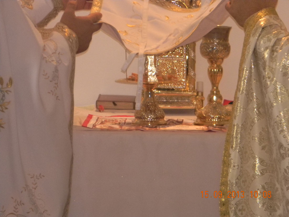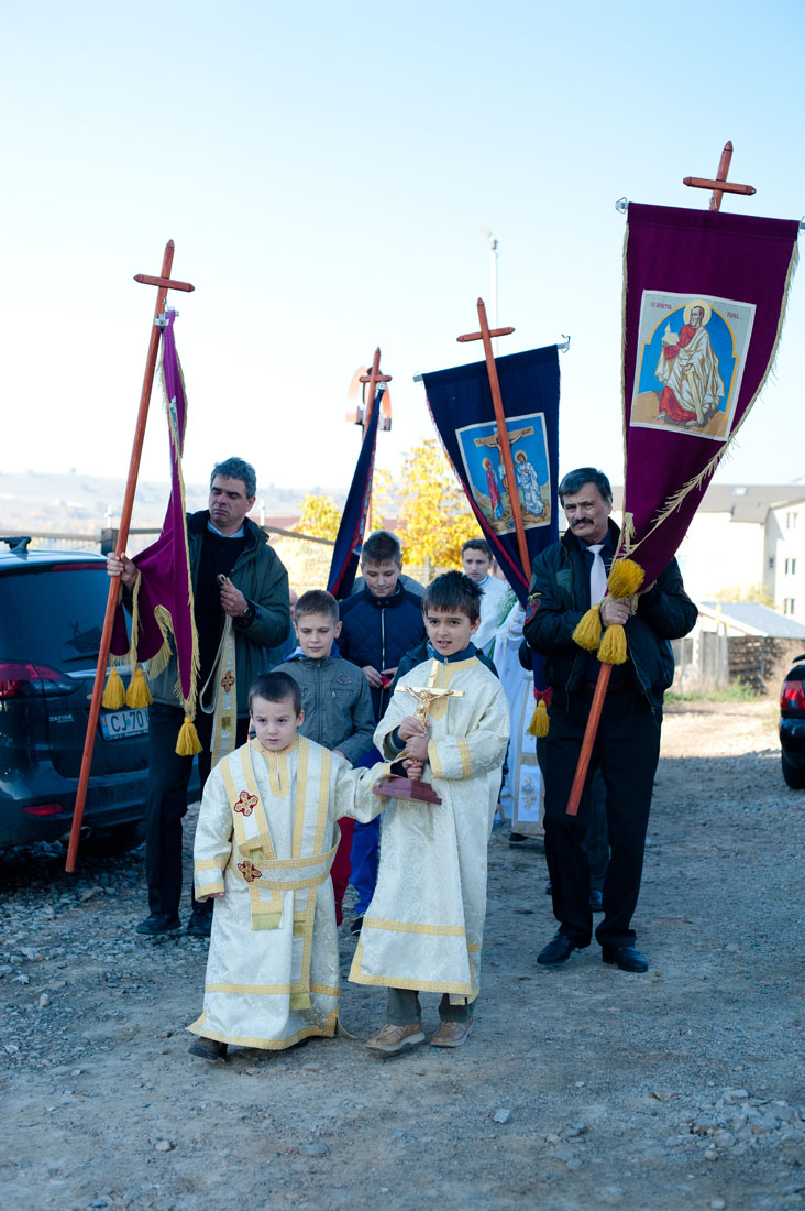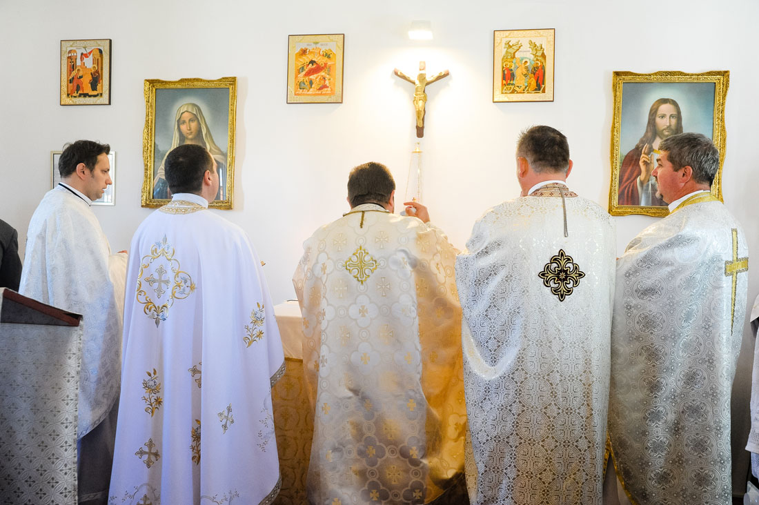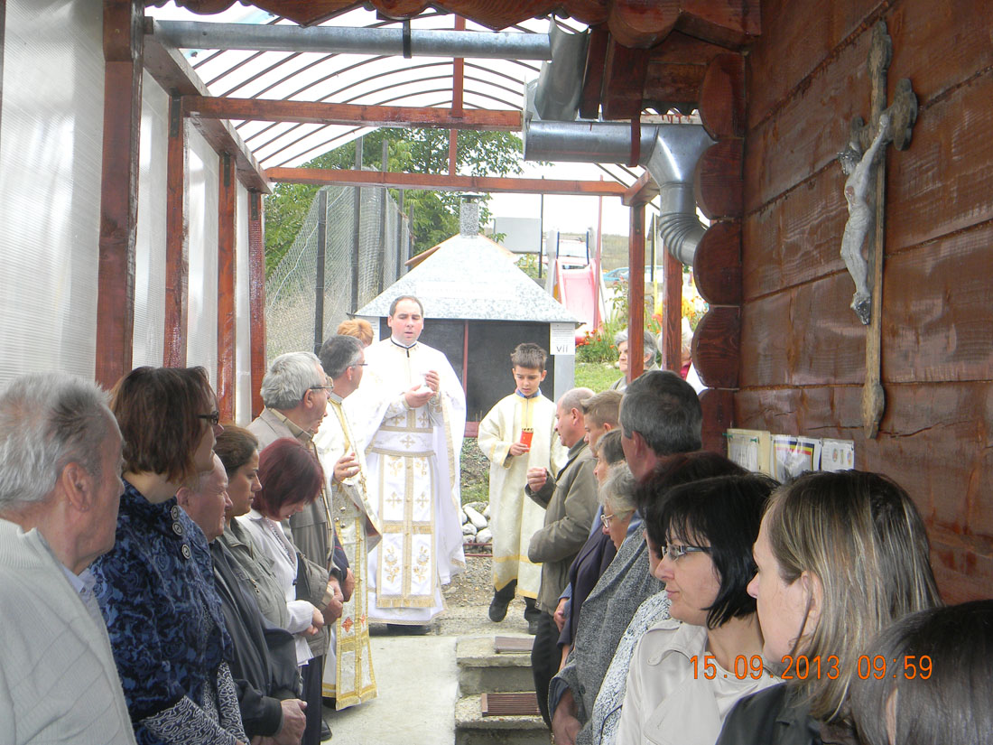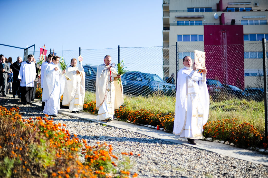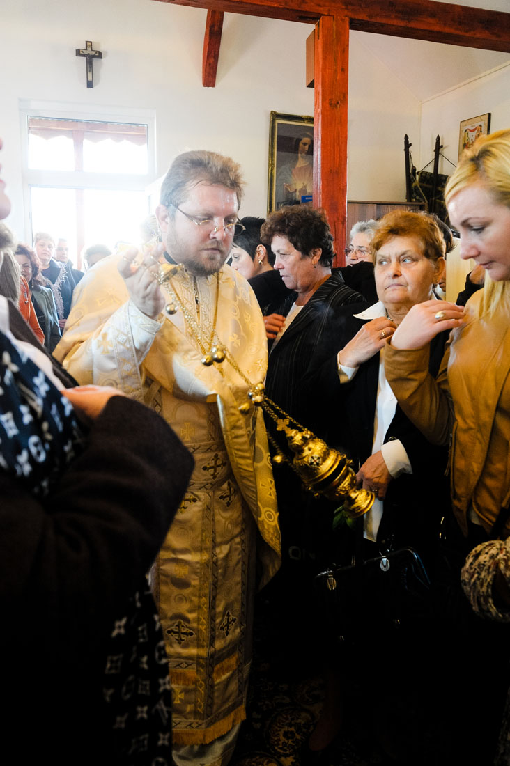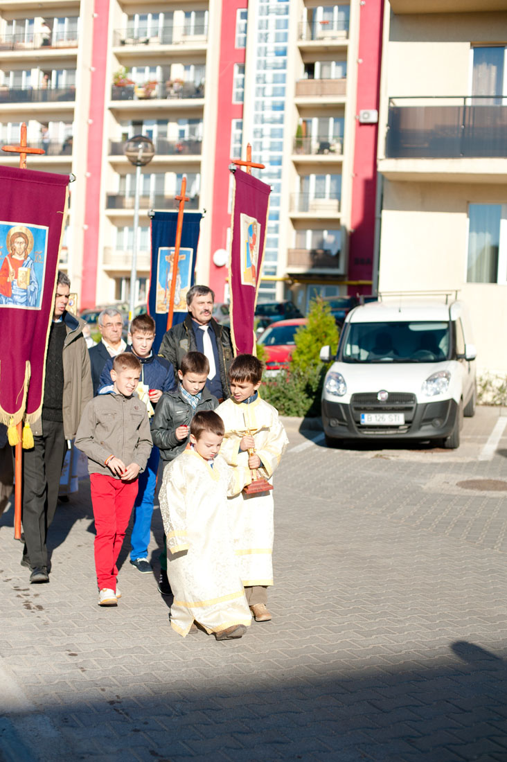 Episcopul eparhial a fost întâmpinat cu bucurie de preoți și credincioși, mai ales de cei șase copii frumos înveșmântați în strai popular, în mâini cu buchete de flori pe care i le-au oferit cu dedicația: „cules-am din holdele verzi, buchete de flori mititele, primiți-le însă cu drag, vă rugăm, căci dragostea noastră e-n ele”. După un cuvânt de întâmpinare a pr. paroh și un salut al Ierarhului, au urmat Sfânta Liturghie și ceremonia de binecuvântare celebrate în aer liber, pe placa de bază a bisericii al cărei demisol este deja realizat. Cuvântul de învățătură al Ierarhului a cuprins meditarea fragmentului evanghelic despre femeile purtătoare de mir care au plecat „dis de dimineață” acolo unde credeau că îl vor găsi pe Isus mort, dar nu l-au găsit, iar un înger li s-a arătat spunându-le: „A înviat! Nu este aici.”