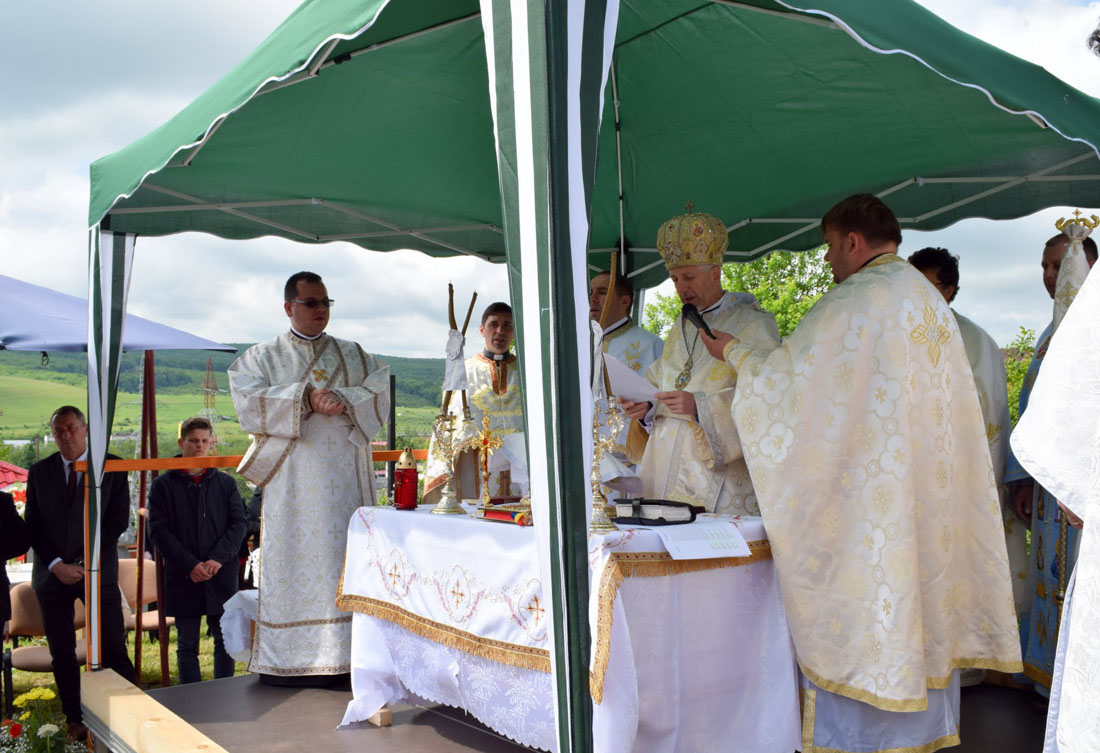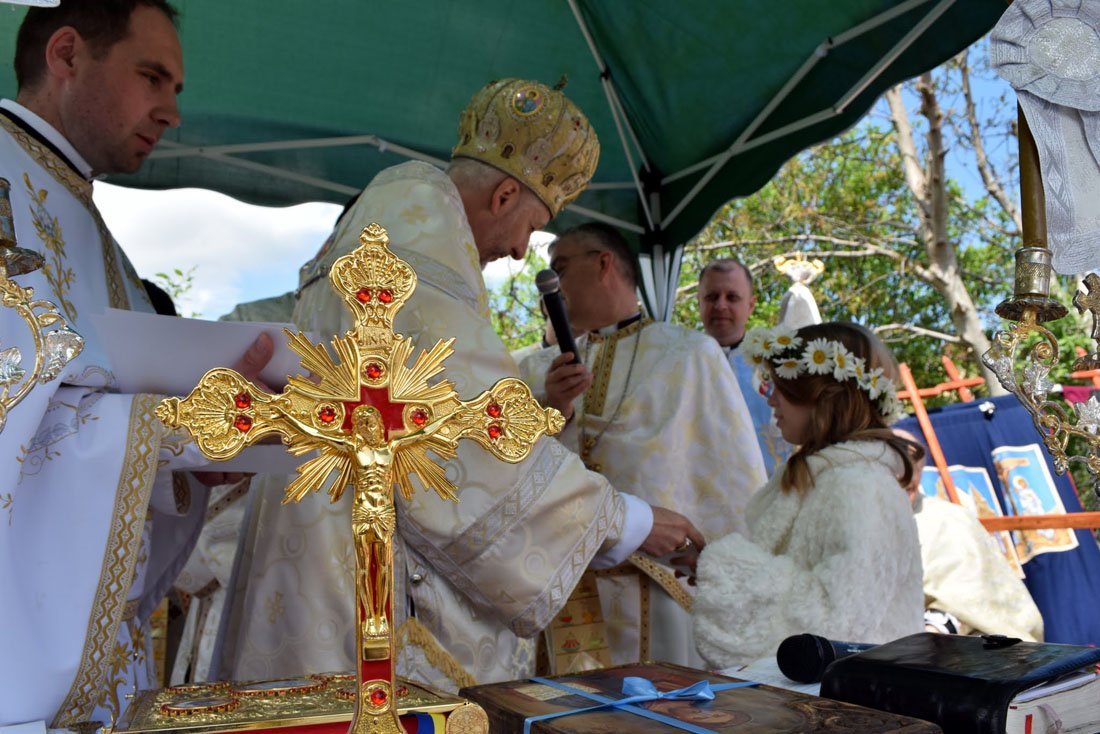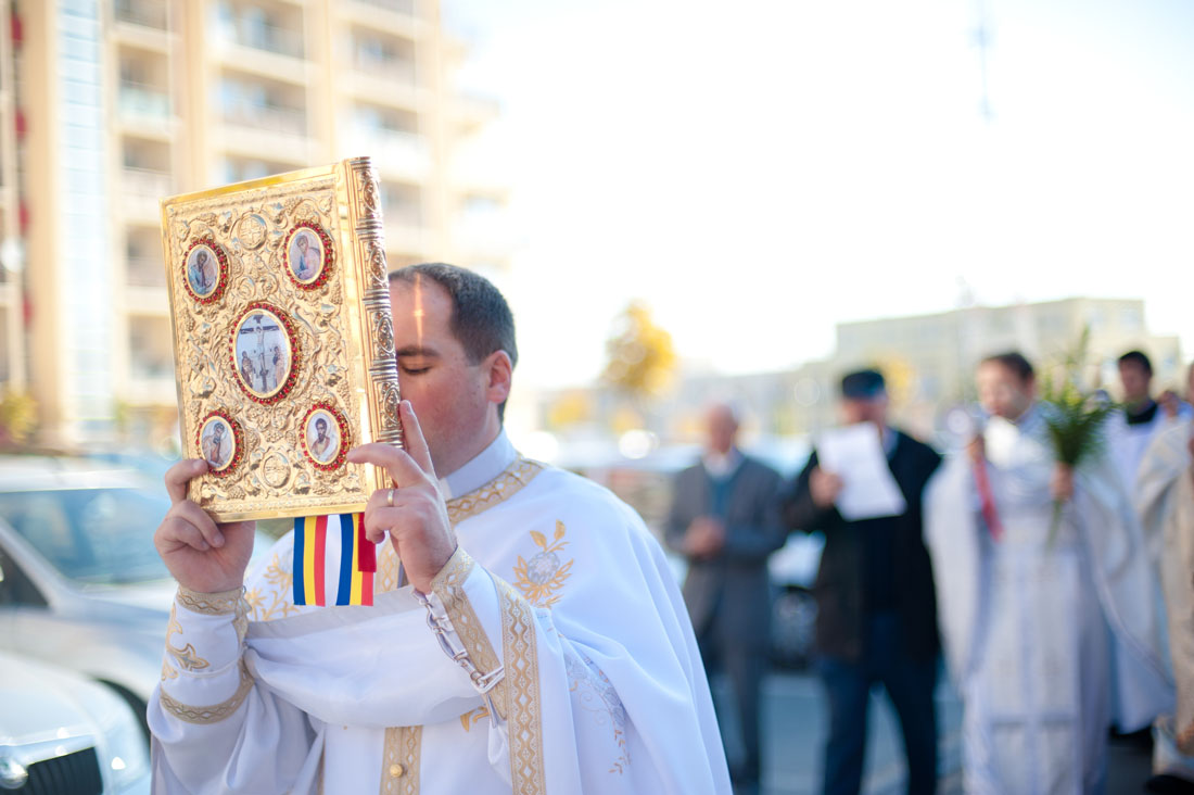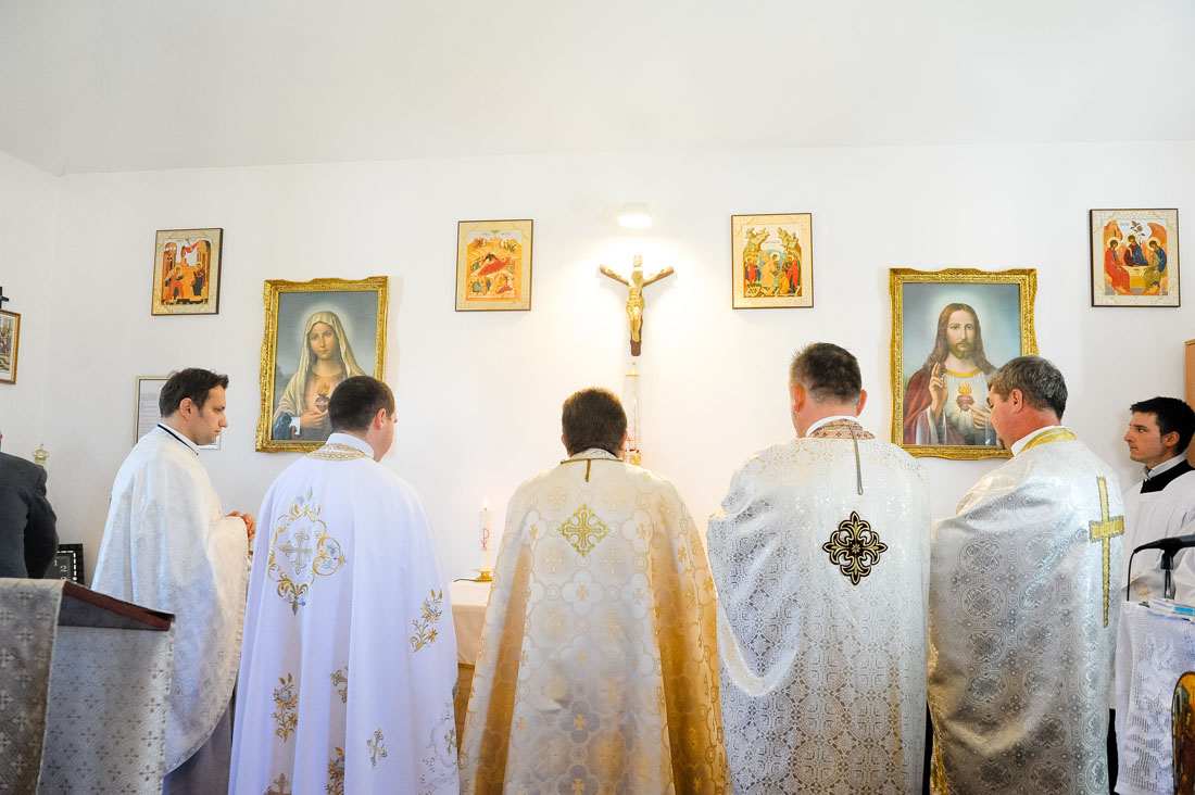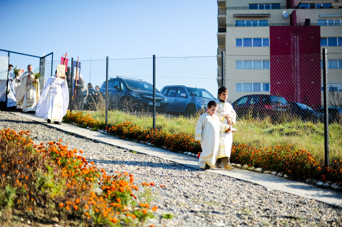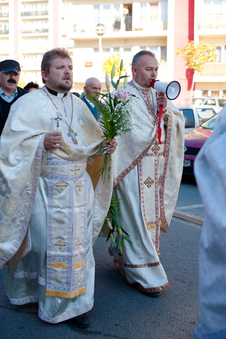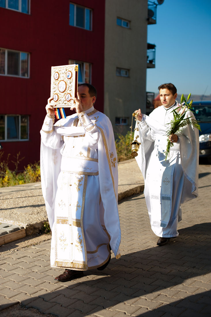 Episcopul eparhial a fost întâmpinat cu bucurie de preoți și credincioși, mai ales de cei șase copii frumos înveșmântați în strai popular, în mâini cu buchete de flori pe care i le-au oferit cu dedicația: „cules-am din holdele verzi, buchete de flori mititele, primiți-le însă cu drag, vă rugăm, căci dragostea noastră e-n ele”. După un cuvânt de întâmpinare a pr. paroh și un salut al Ierarhului, au urmat Sfânta Liturghie și ceremonia de binecuvântare celebrate în aer liber, pe placa de bază a bisericii al cărei demisol este deja realizat. Cuvântul de învățătură al Ierarhului a cuprins meditarea fragmentului evanghelic despre femeile purtătoare de mir care au plecat „dis de dimineață” acolo unde credeau că îl vor găsi pe Isus mort, dar nu l-au găsit, iar un înger li s-a arătat spunându-le: „A înviat! Nu este aici.”