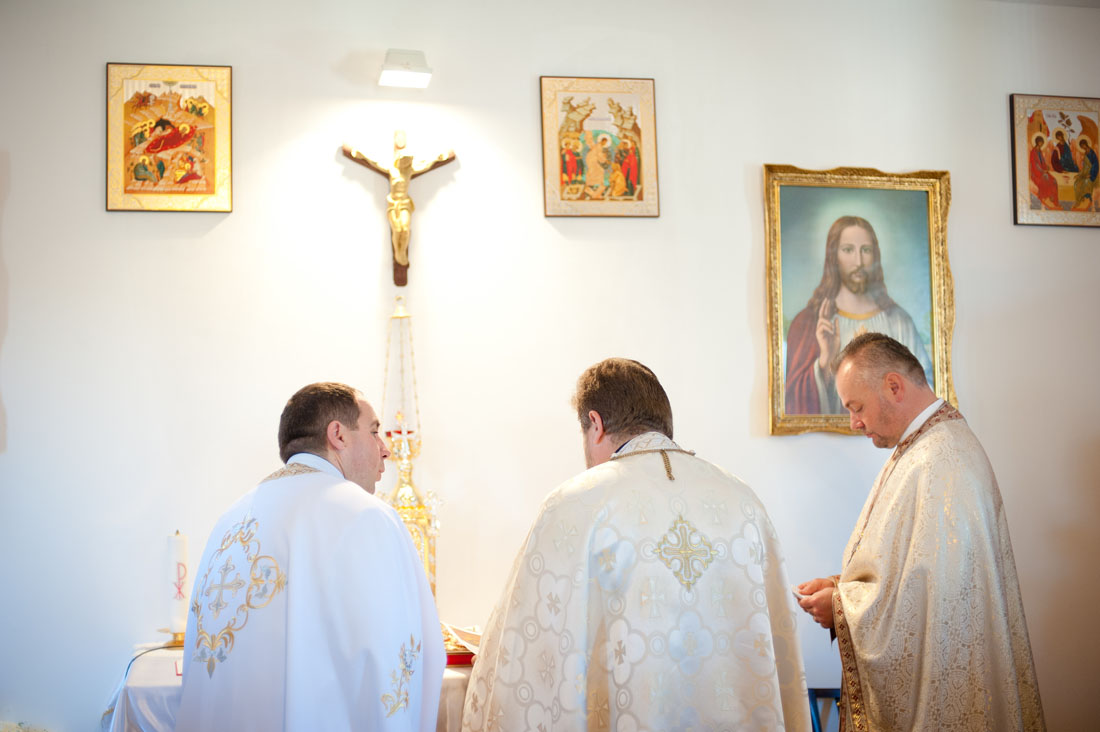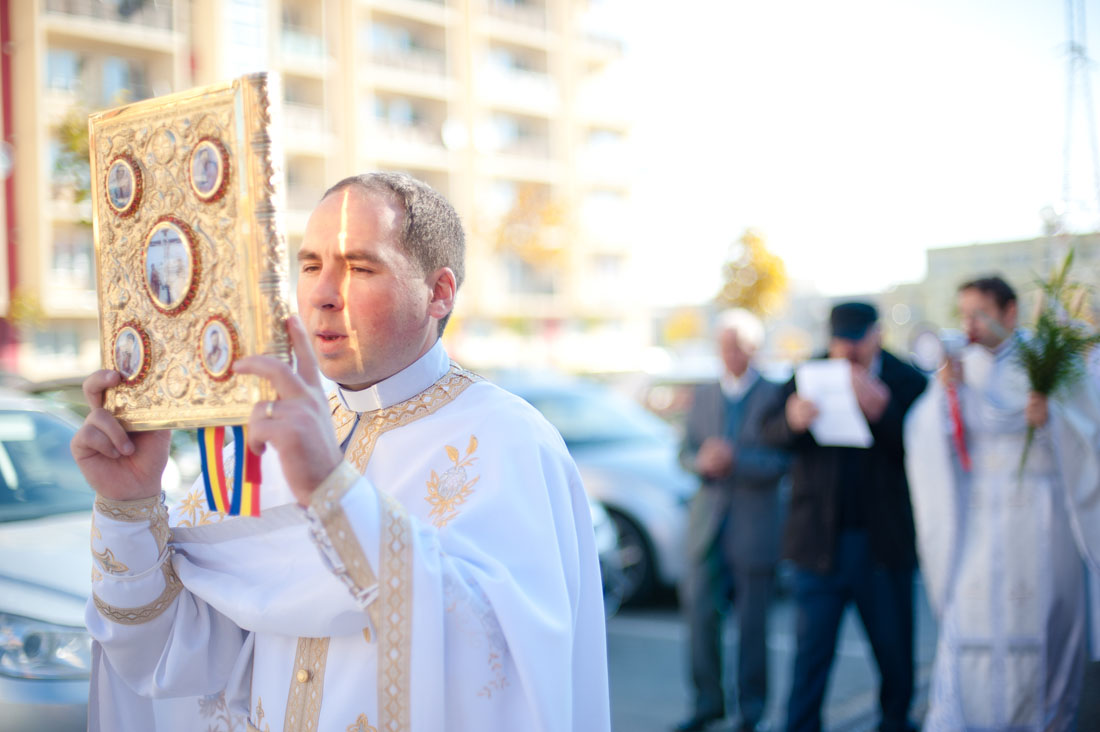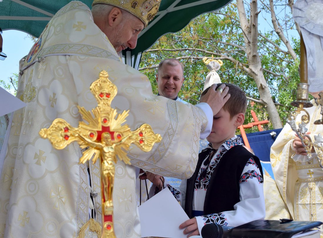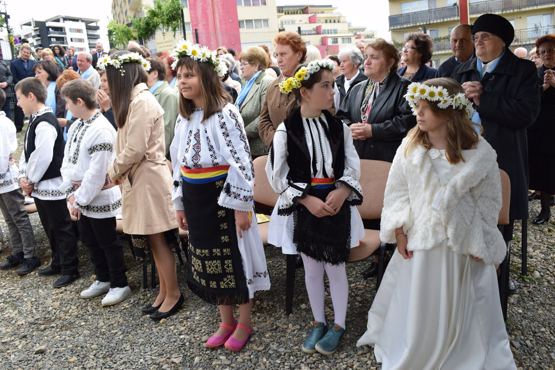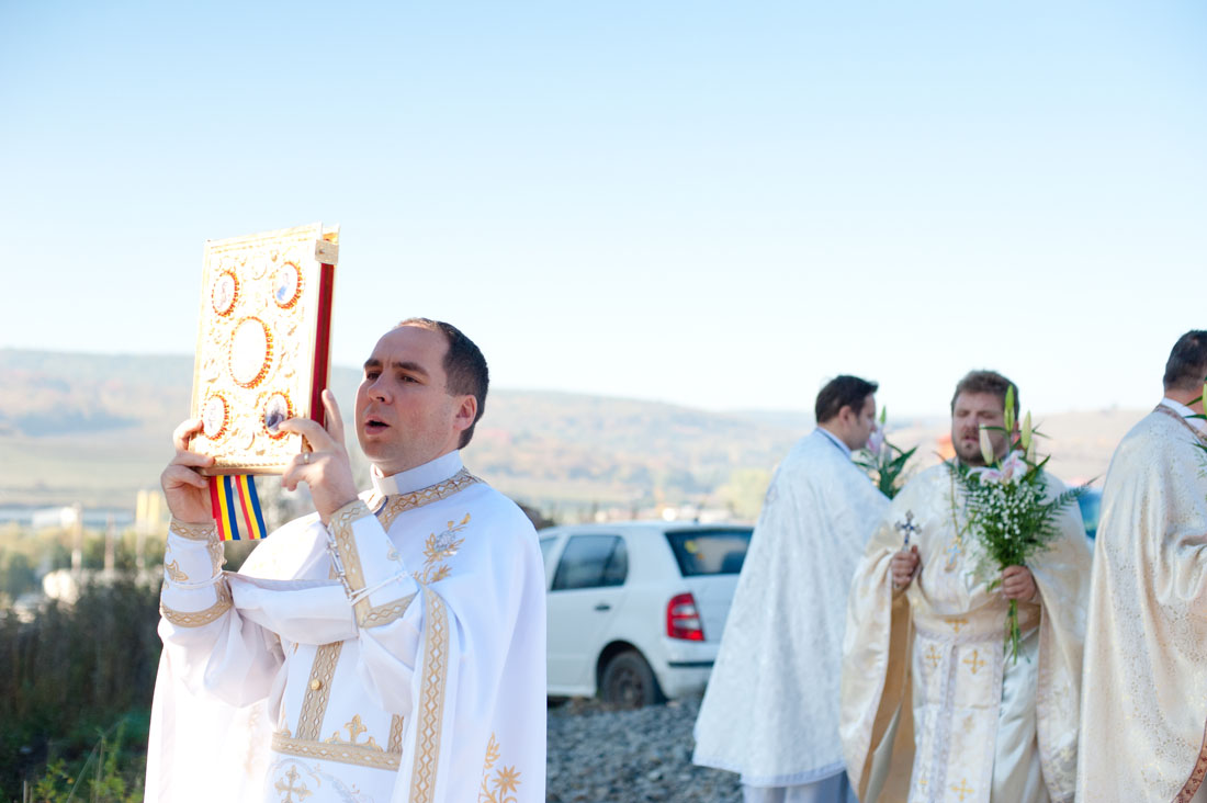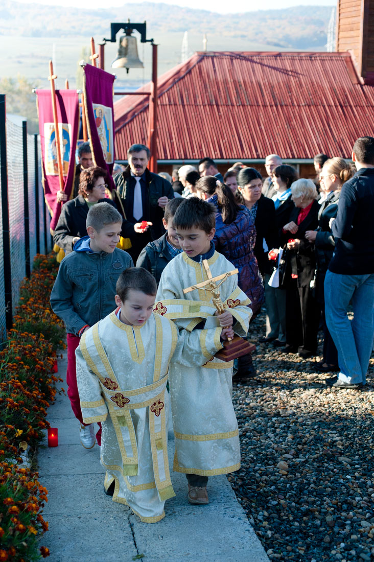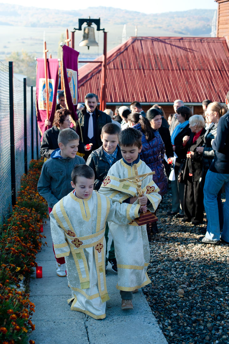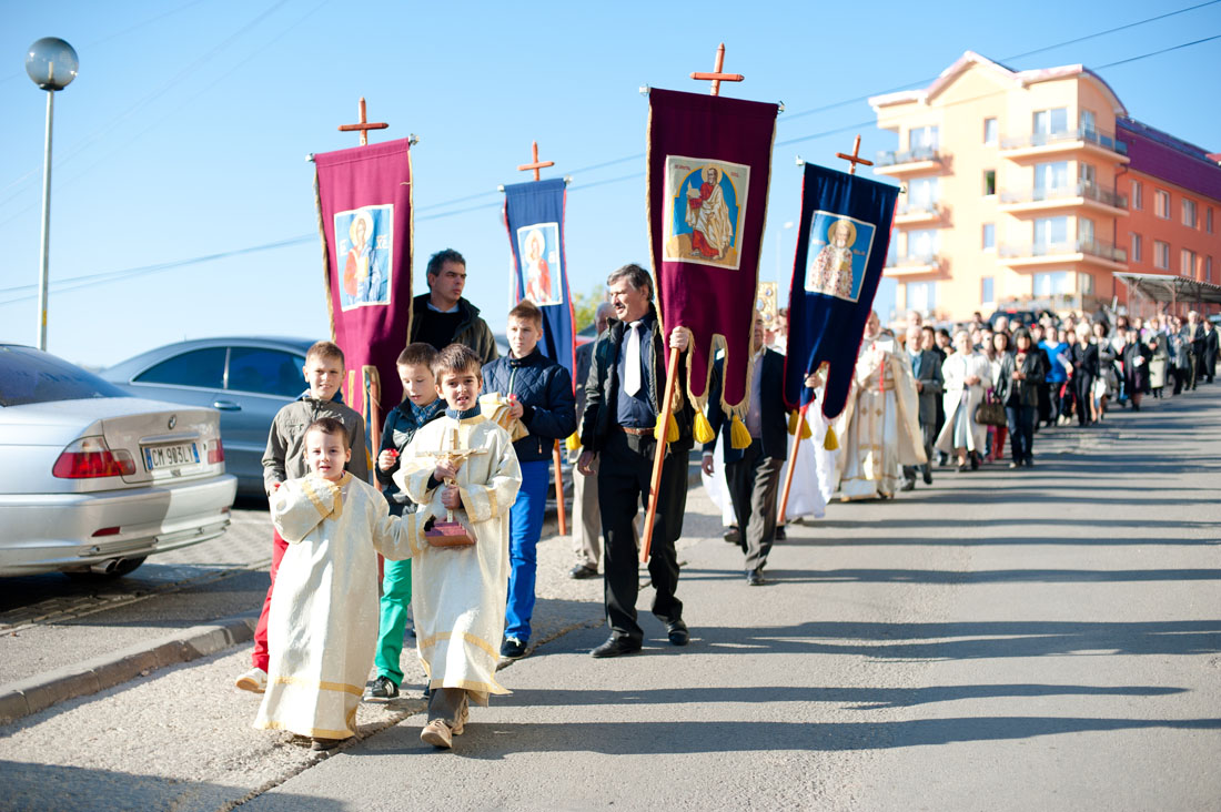 Episcopul eparhial a fost întâmpinat cu bucurie de preoți și credincioși, mai ales de cei șase copii frumos înveșmântați în strai popular, în mâini cu buchete de flori pe care i le-au oferit cu dedicația: „cules-am din holdele verzi, buchete de flori mititele, primiți-le însă cu drag, vă rugăm, căci dragostea noastră e-n ele”. După un cuvânt de întâmpinare a pr. paroh și un salut al Ierarhului, au urmat Sfânta Liturghie și ceremonia de binecuvântare celebrate în aer liber, pe placa de bază a bisericii al cărei demisol este deja realizat. Cuvântul de învățătură al Ierarhului a cuprins meditarea fragmentului evanghelic despre femeile purtătoare de mir care au plecat „dis de dimineață” acolo unde credeau că îl vor găsi pe Isus mort, dar nu l-au găsit, iar un înger li s-a arătat spunându-le: „A înviat! Nu este aici.”