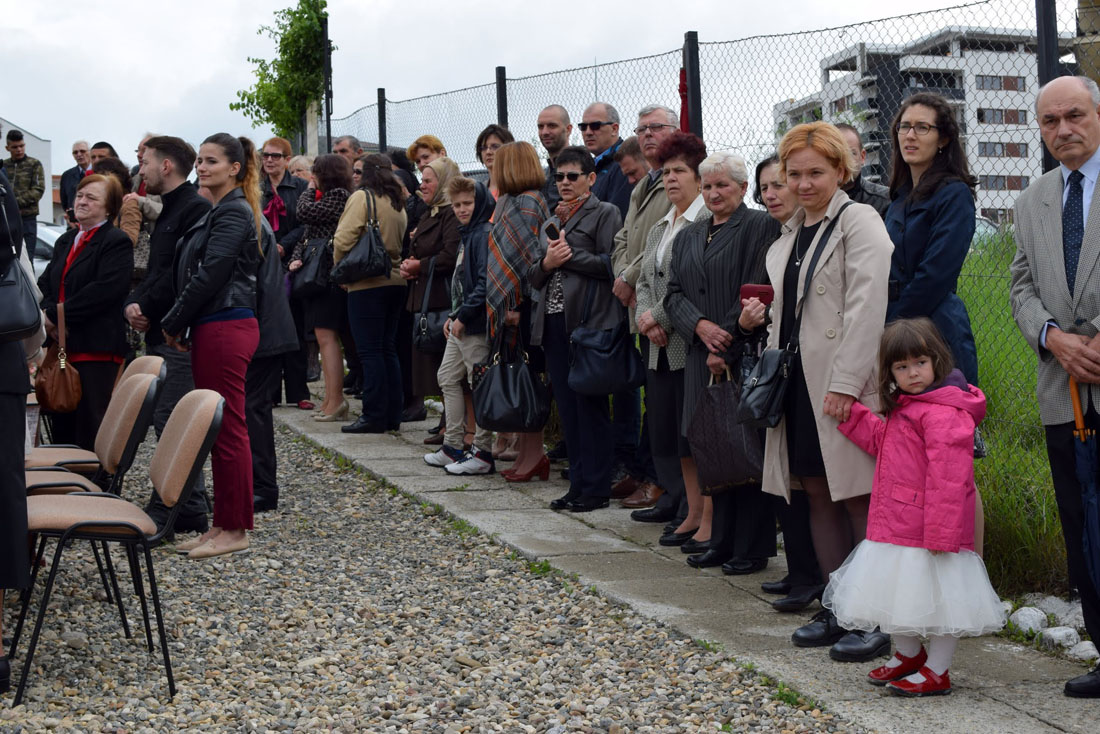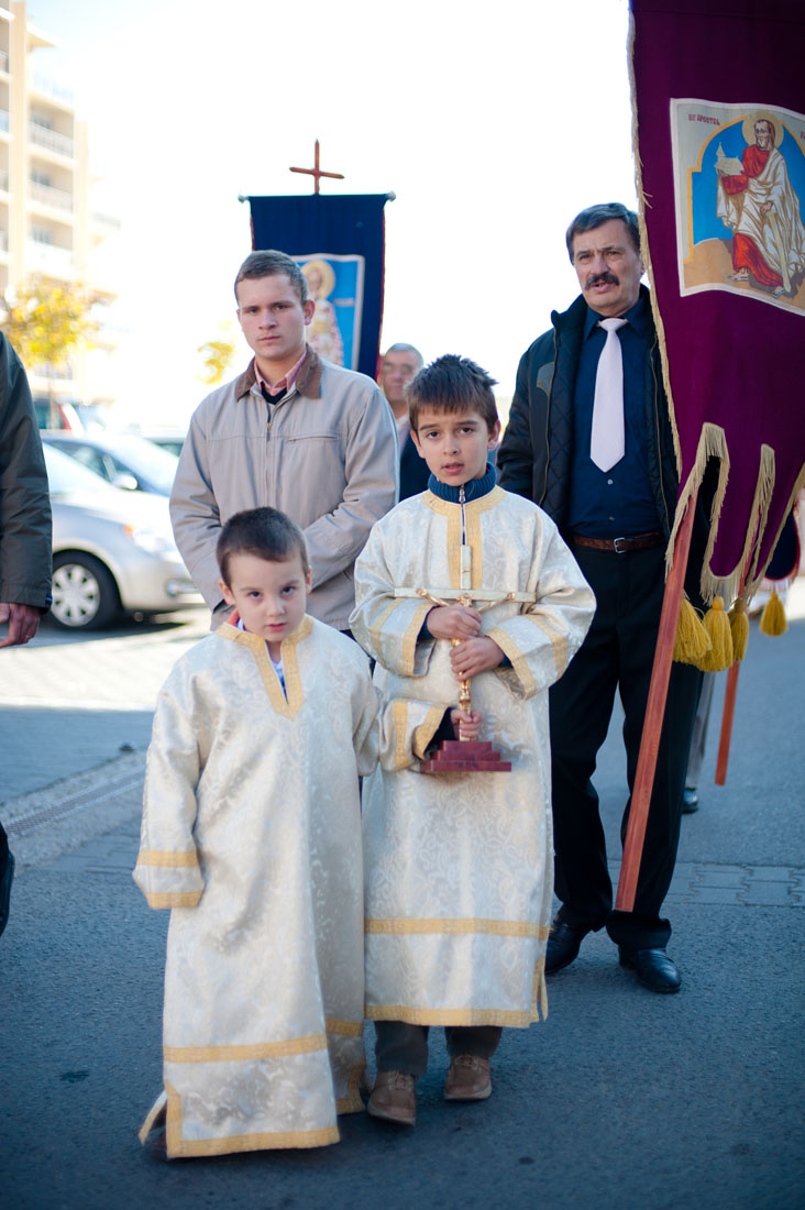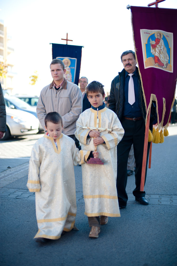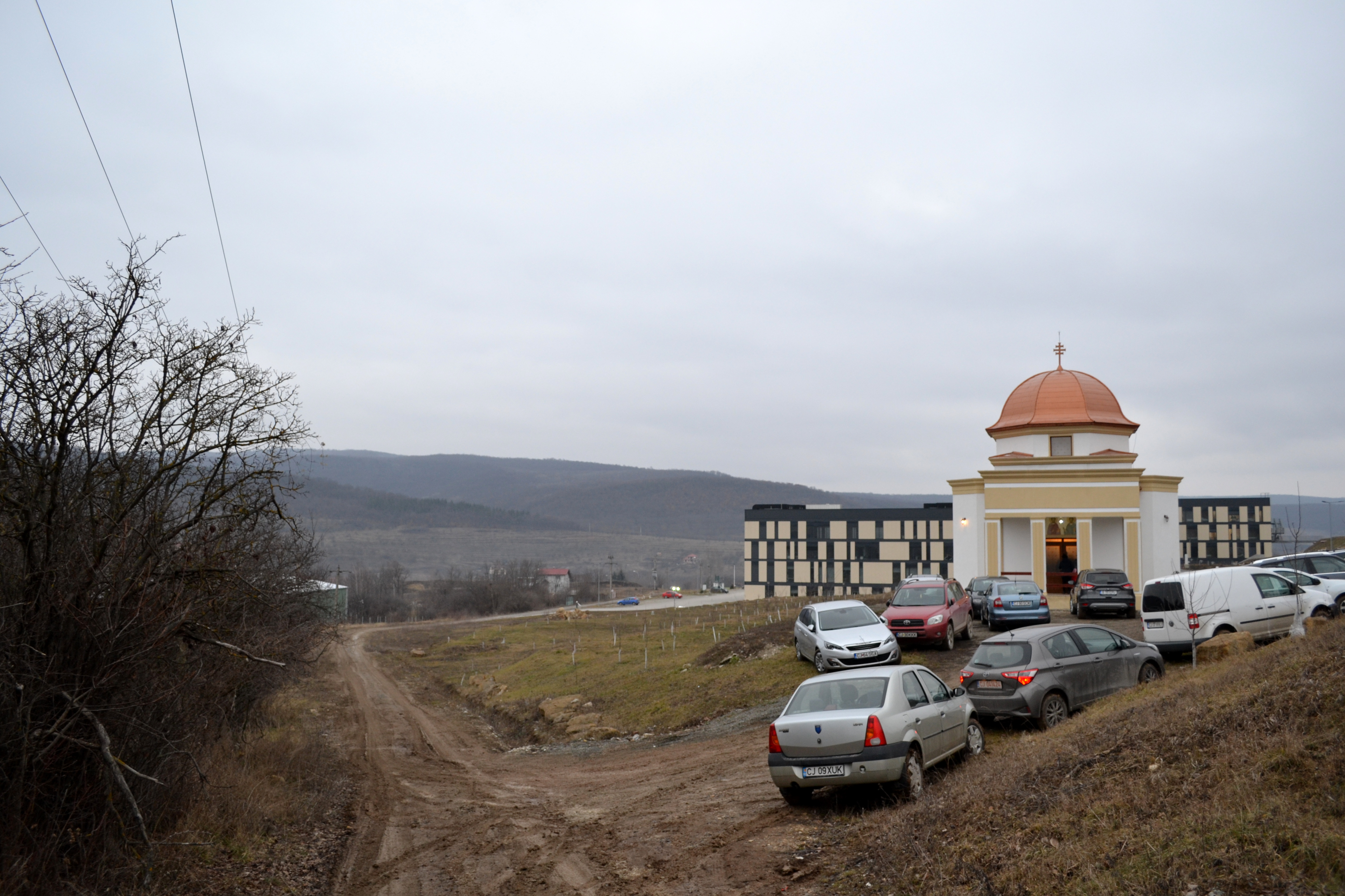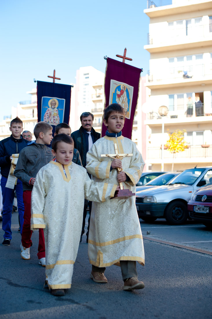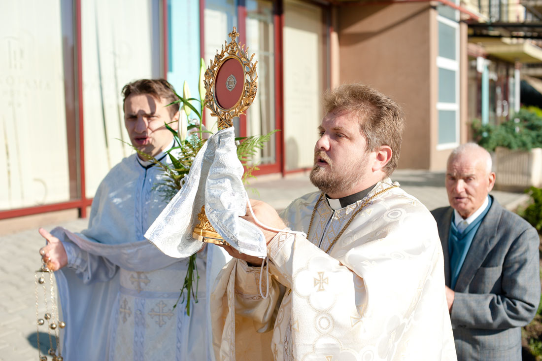 Episcopul eparhial a fost întâmpinat cu bucurie de preoți și credincioși, mai ales de cei șase copii frumos înveșmântați în strai popular, în mâini cu buchete de flori pe care i le-au oferit cu dedicația: „cules-am din holdele verzi, buchete de flori mititele, primiți-le însă cu drag, vă rugăm, căci dragostea noastră e-n ele”. După un cuvânt de întâmpinare a pr. paroh și un salut al Ierarhului, au urmat Sfânta Liturghie și ceremonia de binecuvântare celebrate în aer liber, pe placa de bază a bisericii al cărei demisol este deja realizat. Cuvântul de învățătură al Ierarhului a cuprins meditarea fragmentului evanghelic despre femeile purtătoare de mir care au plecat „dis de dimineață” acolo unde credeau că îl vor găsi pe Isus mort, dar nu l-au găsit, iar un înger li s-a arătat spunându-le: „A înviat! Nu este aici.”