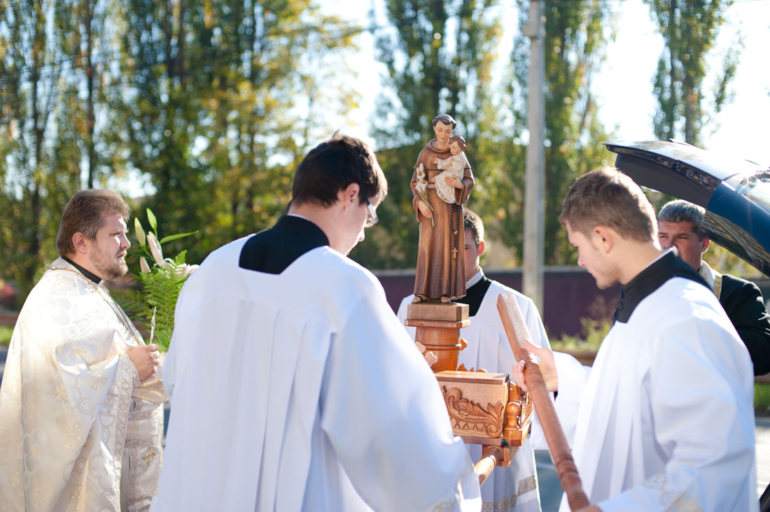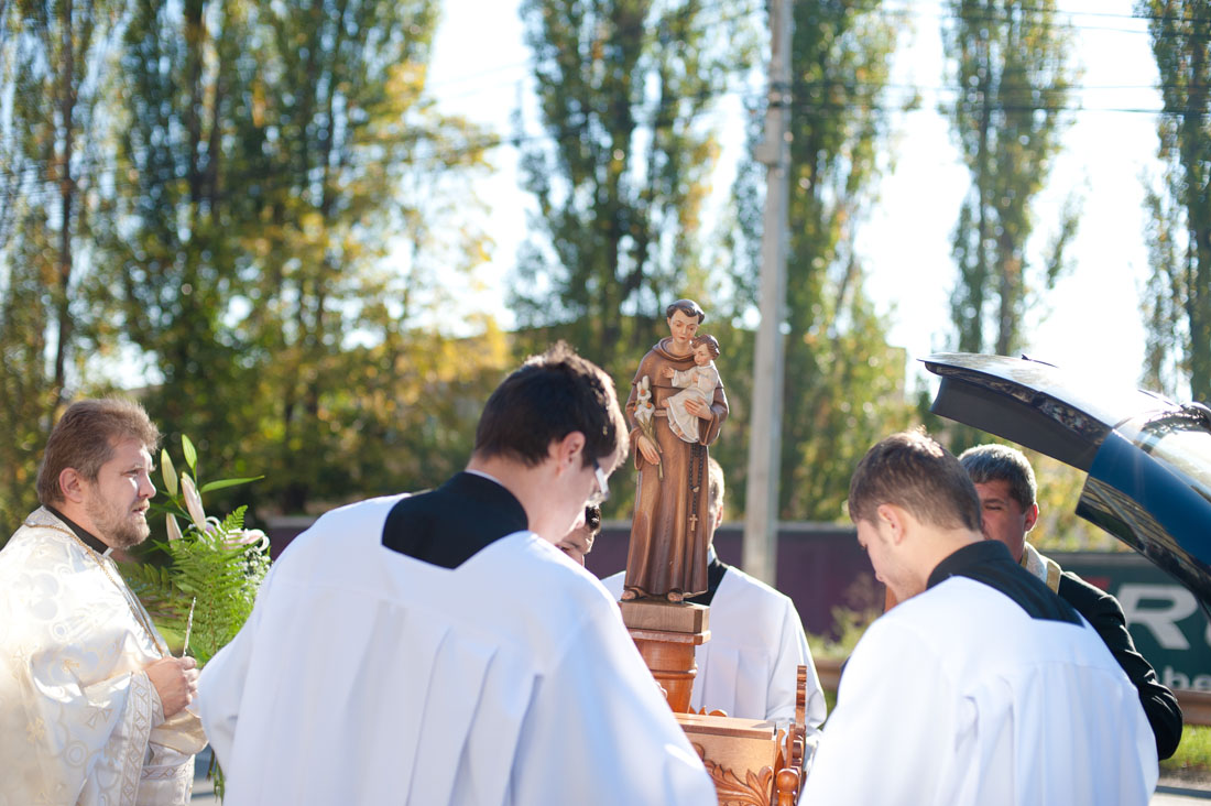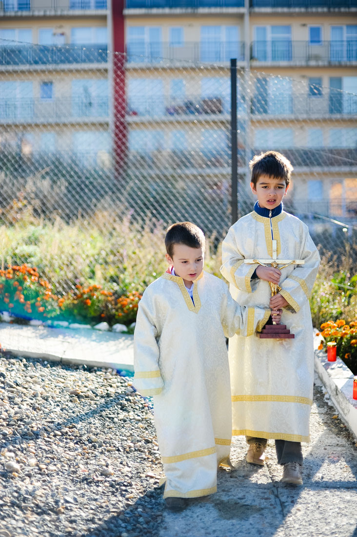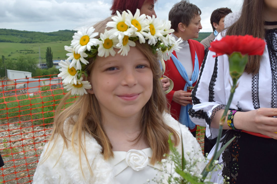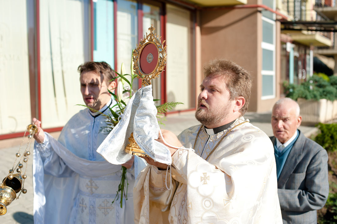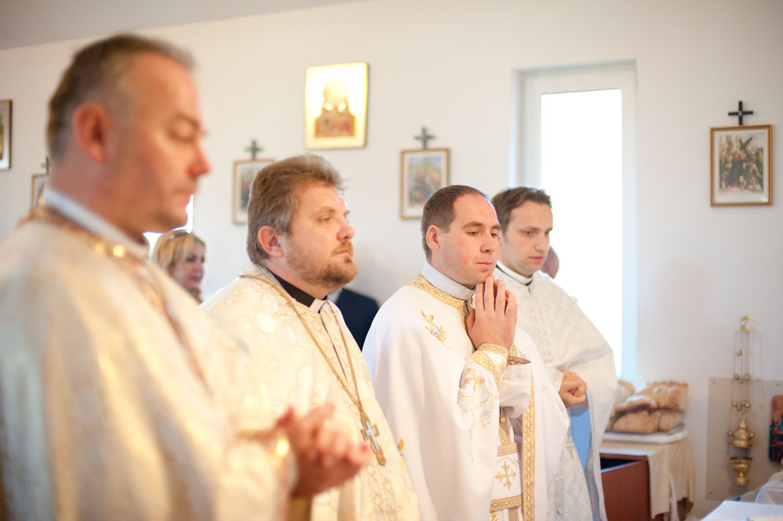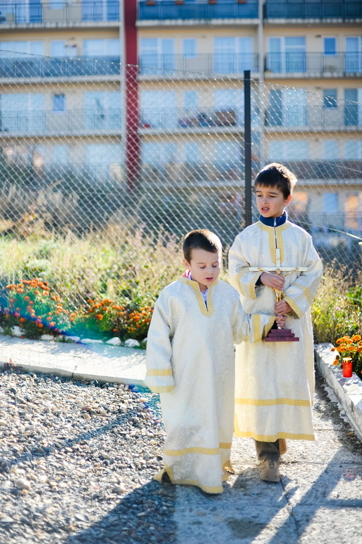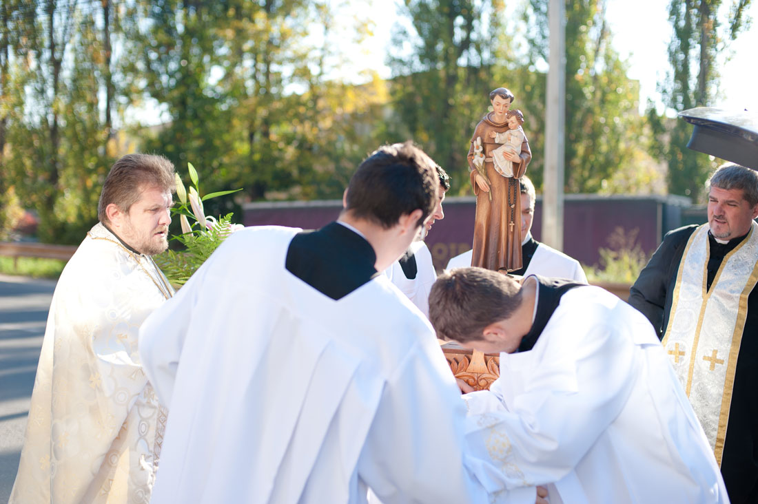 Episcopul eparhial a fost întâmpinat cu bucurie de preoți și credincioși, mai ales de cei șase copii frumos înveșmântați în strai popular, în mâini cu buchete de flori pe care i le-au oferit cu dedicația: „cules-am din holdele verzi, buchete de flori mititele, primiți-le însă cu drag, vă rugăm, căci dragostea noastră e-n ele”. După un cuvânt de întâmpinare a pr. paroh și un salut al Ierarhului, au urmat Sfânta Liturghie și ceremonia de binecuvântare celebrate în aer liber, pe placa de bază a bisericii al cărei demisol este deja realizat. Cuvântul de învățătură al Ierarhului a cuprins meditarea fragmentului evanghelic despre femeile purtătoare de mir care au plecat „dis de dimineață” acolo unde credeau că îl vor găsi pe Isus mort, dar nu l-au găsit, iar un înger li s-a arătat spunându-le: „A înviat! Nu este aici.”