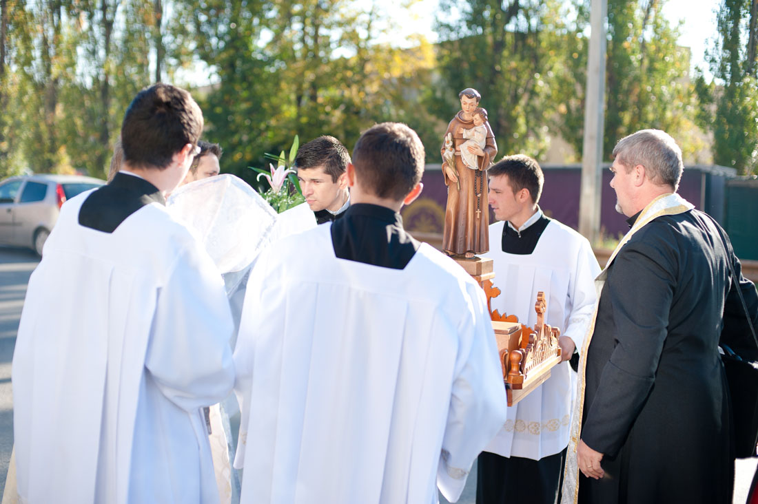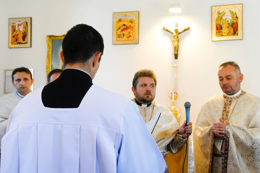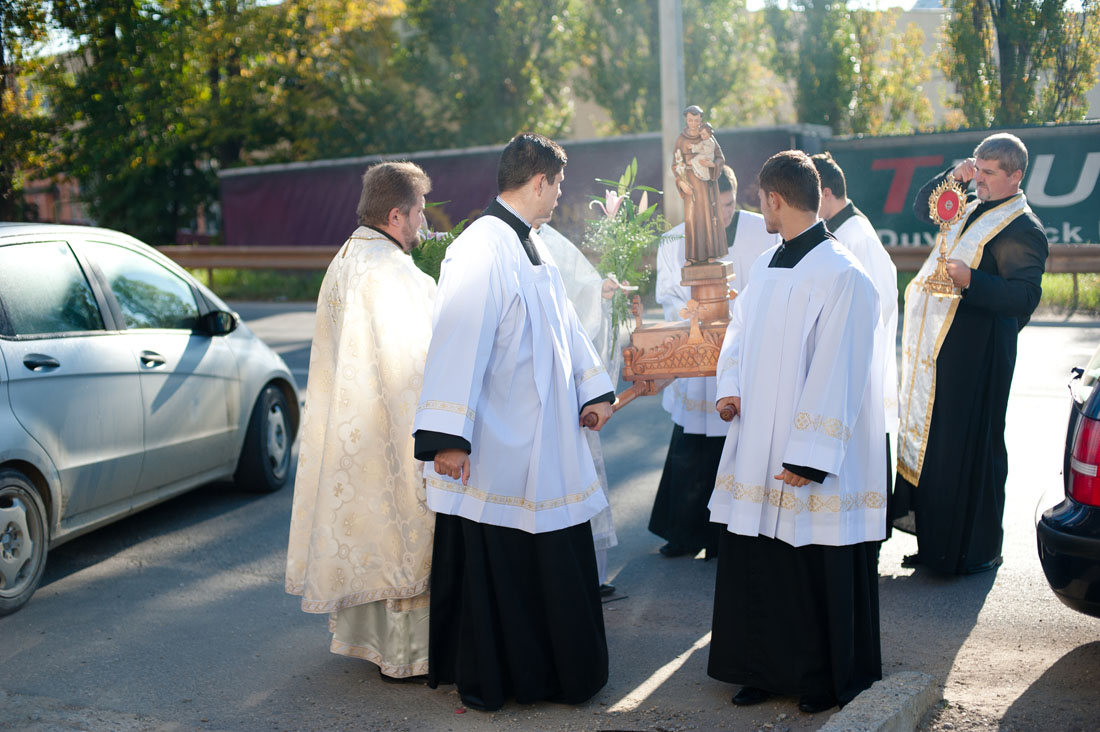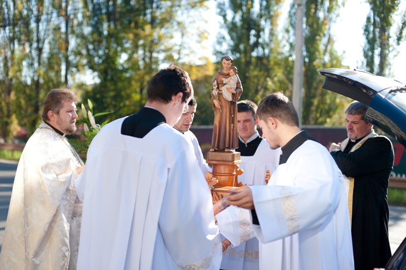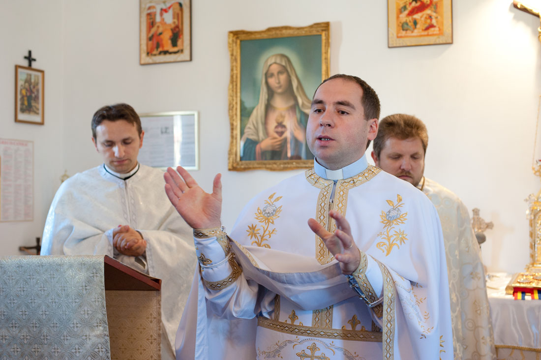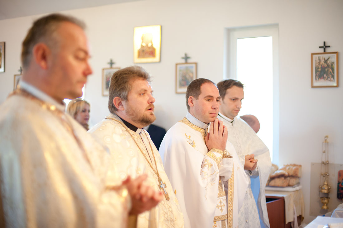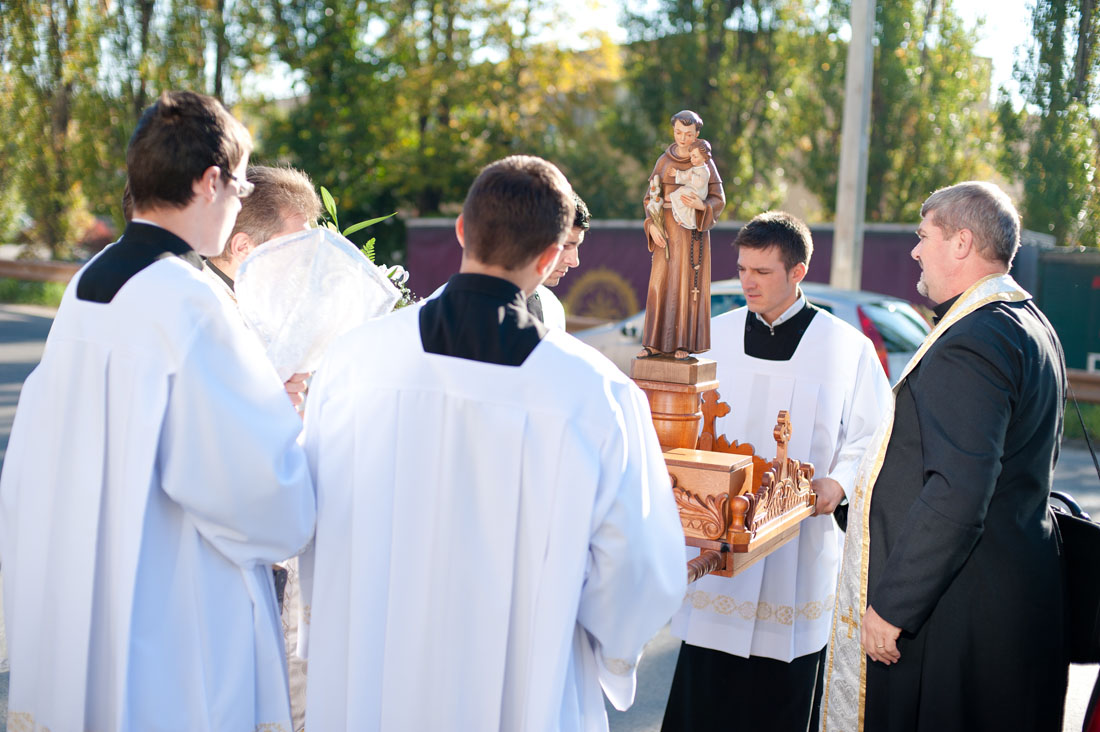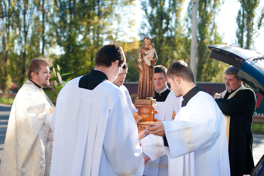 Episcopul eparhial a fost întâmpinat cu bucurie de preoți și credincioși, mai ales de cei șase copii frumos înveșmântați în strai popular, în mâini cu buchete de flori pe care i le-au oferit cu dedicația: „cules-am din holdele verzi, buchete de flori mititele, primiți-le însă cu drag, vă rugăm, căci dragostea noastră e-n ele”. După un cuvânt de întâmpinare a pr. paroh și un salut al Ierarhului, au urmat Sfânta Liturghie și ceremonia de binecuvântare celebrate în aer liber, pe placa de bază a bisericii al cărei demisol este deja realizat. Cuvântul de învățătură al Ierarhului a cuprins meditarea fragmentului evanghelic despre femeile purtătoare de mir care au plecat „dis de dimineață” acolo unde credeau că îl vor găsi pe Isus mort, dar nu l-au găsit, iar un înger li s-a arătat spunându-le: „A înviat! Nu este aici.”