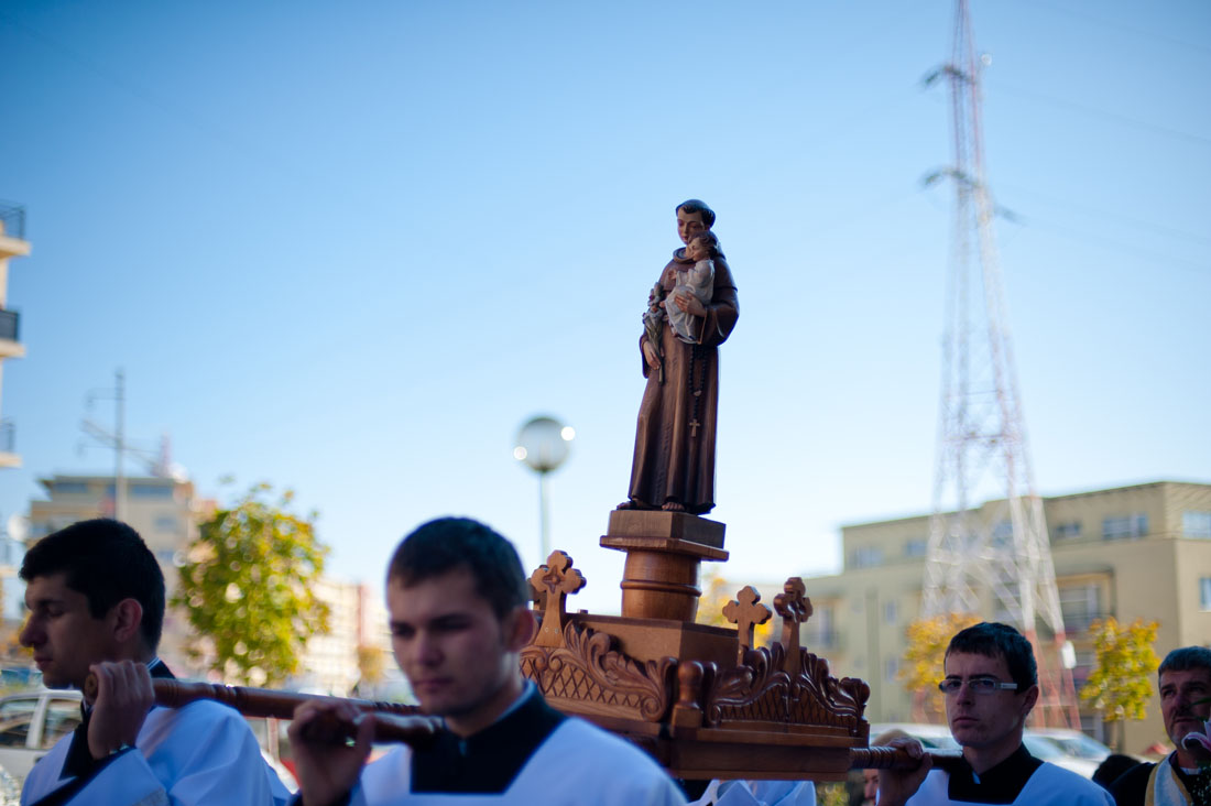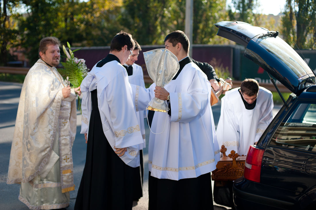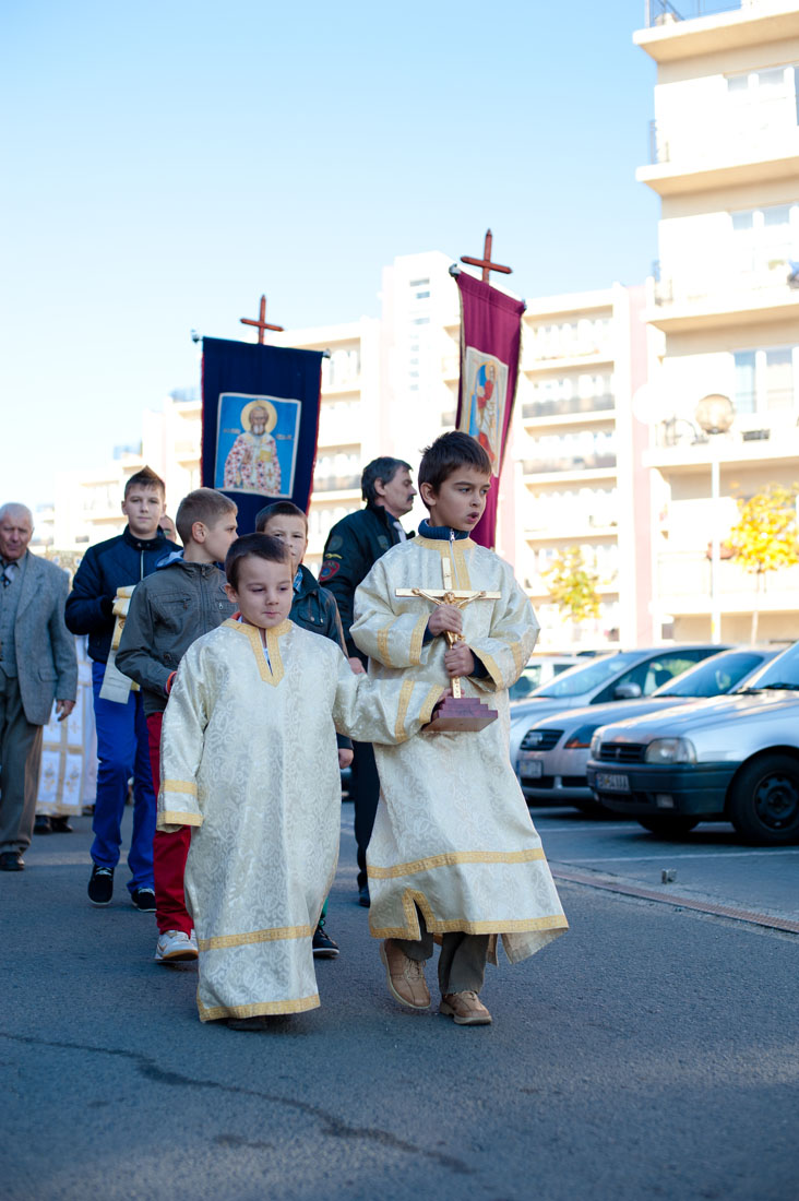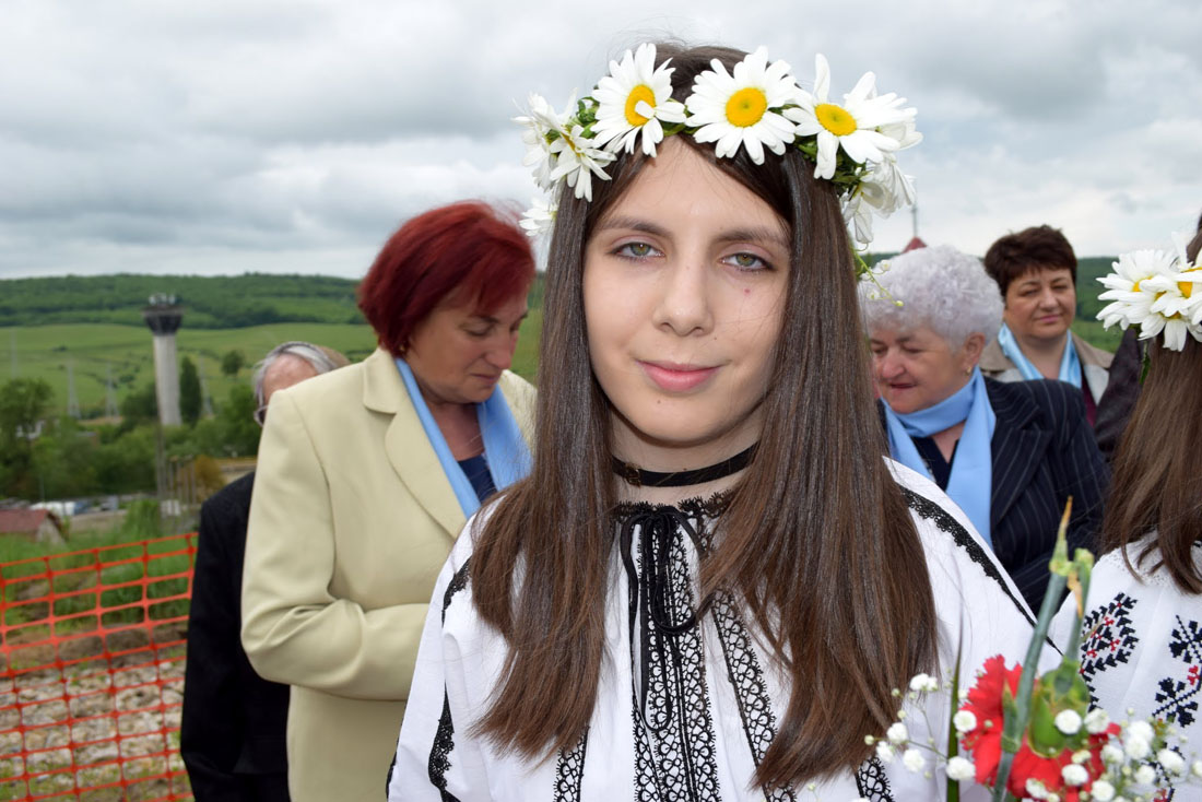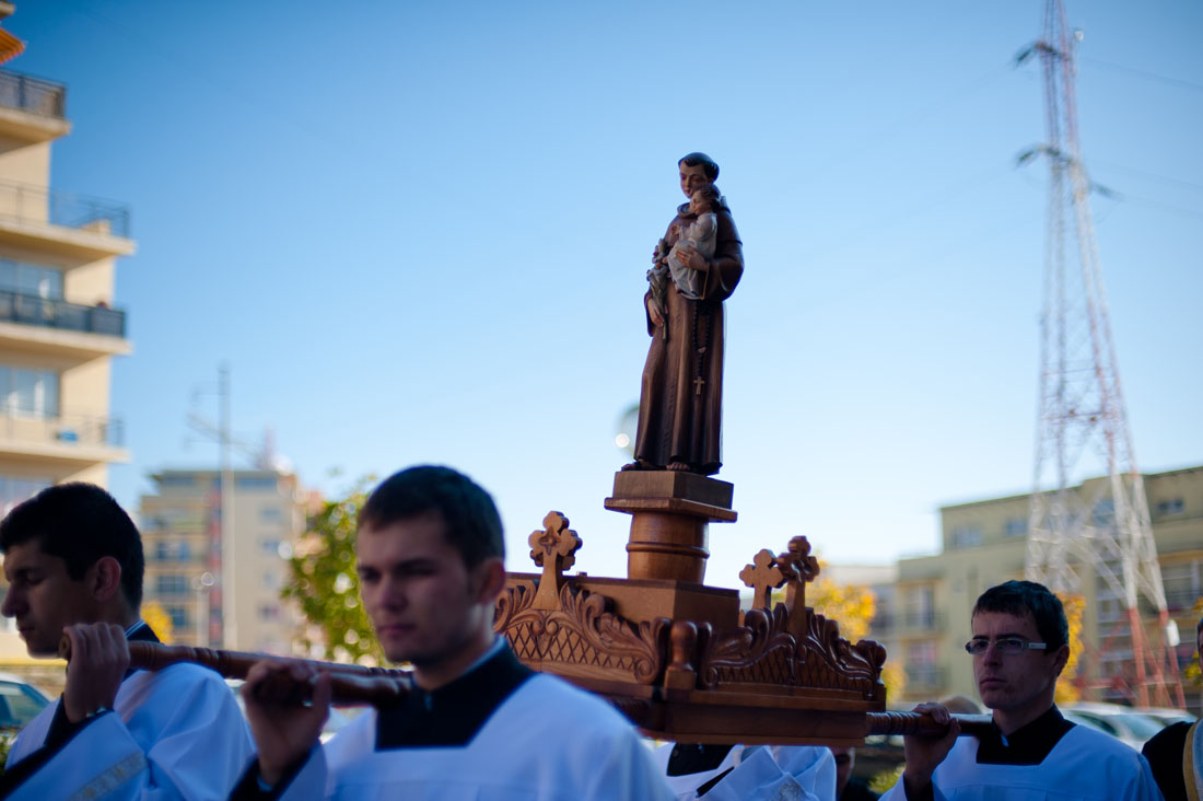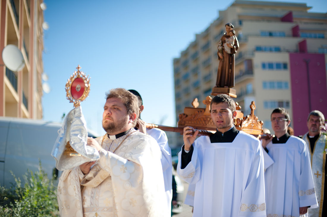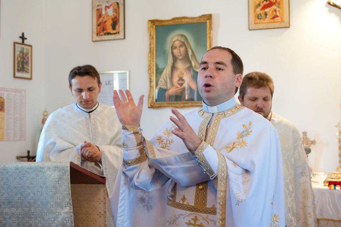 Episcopul eparhial a fost întâmpinat cu bucurie de preoți și credincioși, mai ales de cei șase copii frumos înveșmântați în strai popular, în mâini cu buchete de flori pe care i le-au oferit cu dedicația: „cules-am din holdele verzi, buchete de flori mititele, primiți-le însă cu drag, vă rugăm, căci dragostea noastră e-n ele”. După un cuvânt de întâmpinare a pr. paroh și un salut al Ierarhului, au urmat Sfânta Liturghie și ceremonia de binecuvântare celebrate în aer liber, pe placa de bază a bisericii al cărei demisol este deja realizat. Cuvântul de învățătură al Ierarhului a cuprins meditarea fragmentului evanghelic despre femeile purtătoare de mir care au plecat „dis de dimineață” acolo unde credeau că îl vor găsi pe Isus mort, dar nu l-au găsit, iar un înger li s-a arătat spunându-le: „A înviat! Nu este aici.”