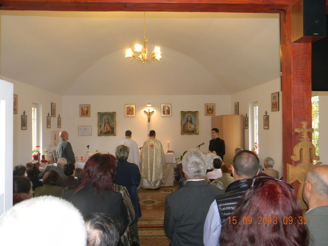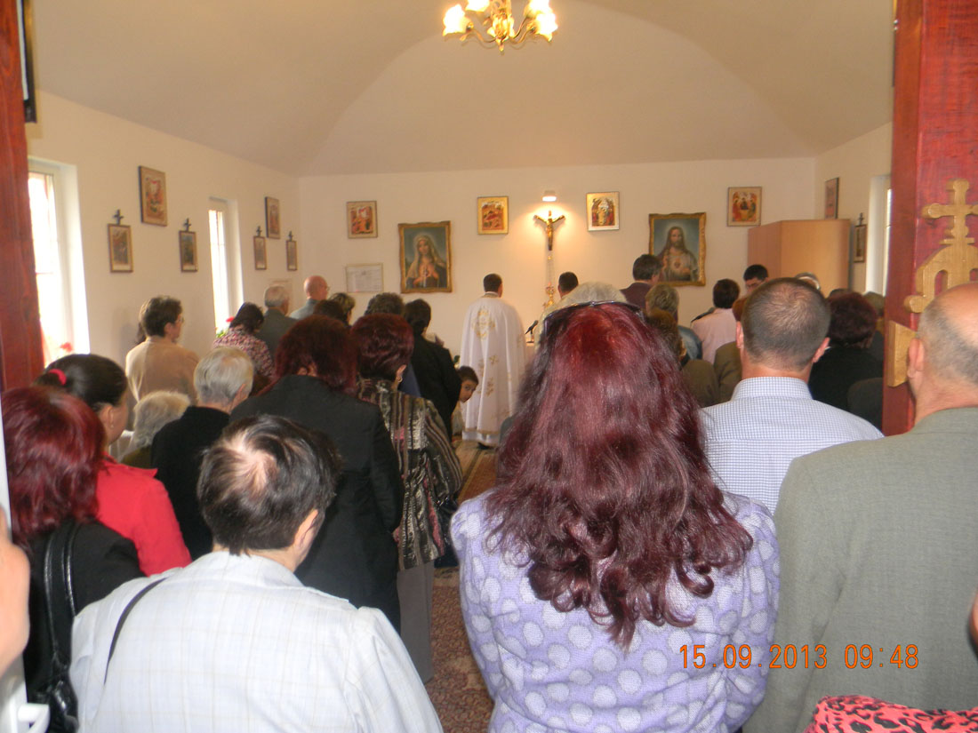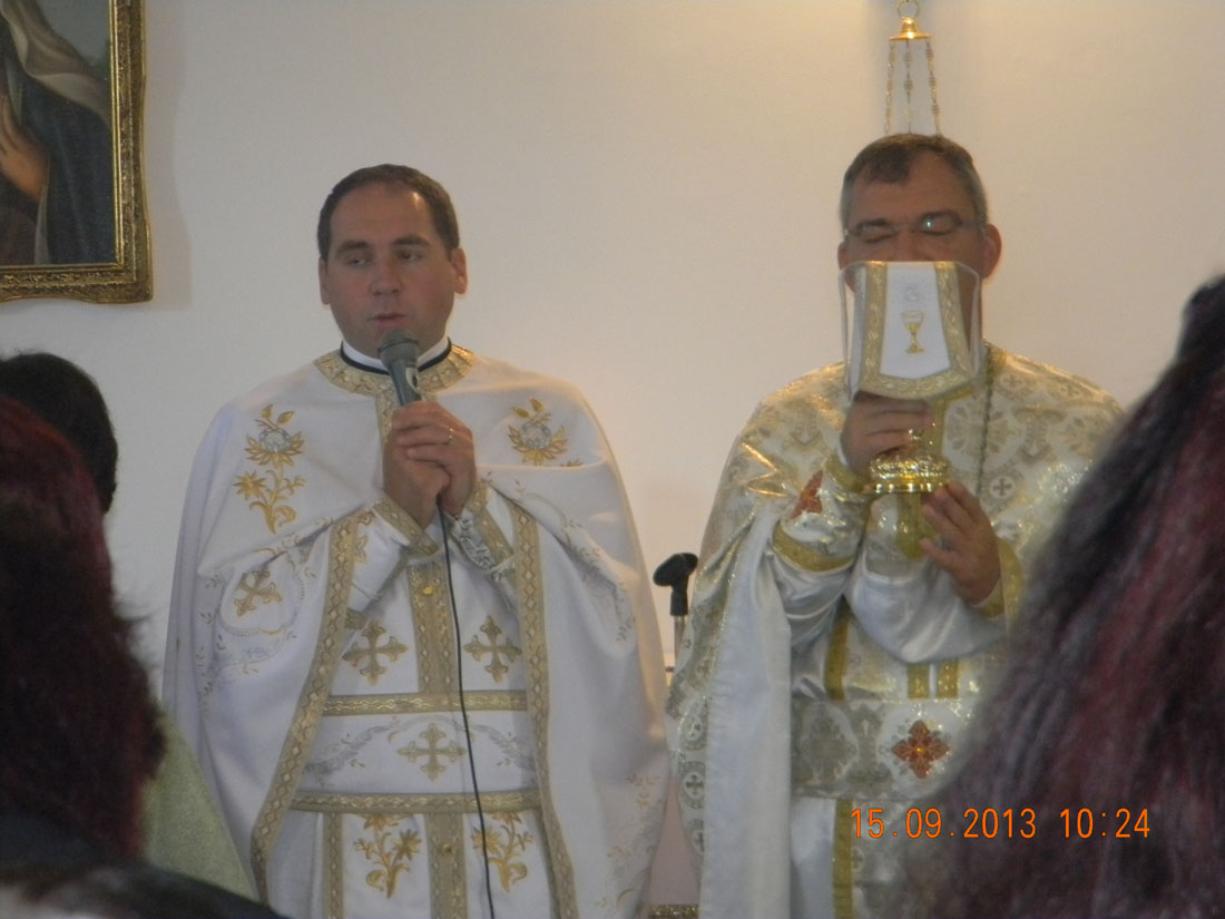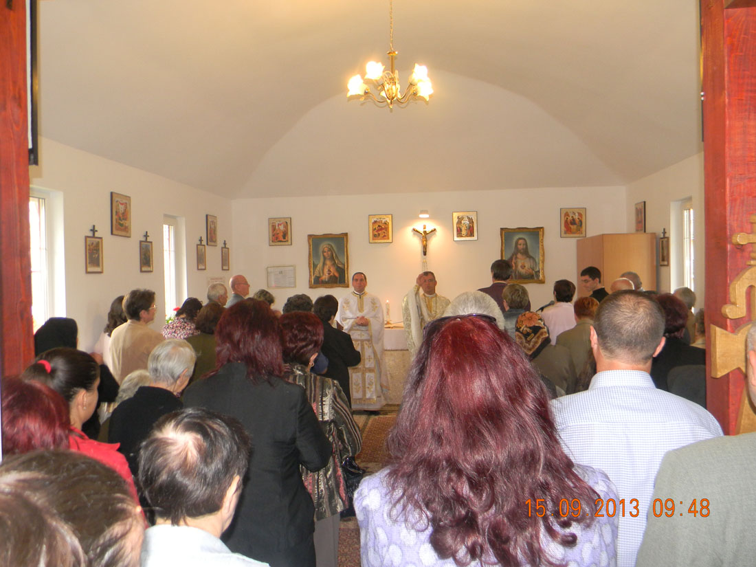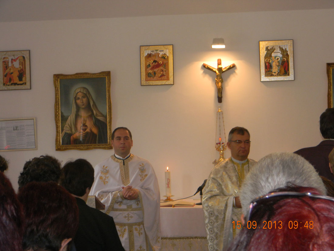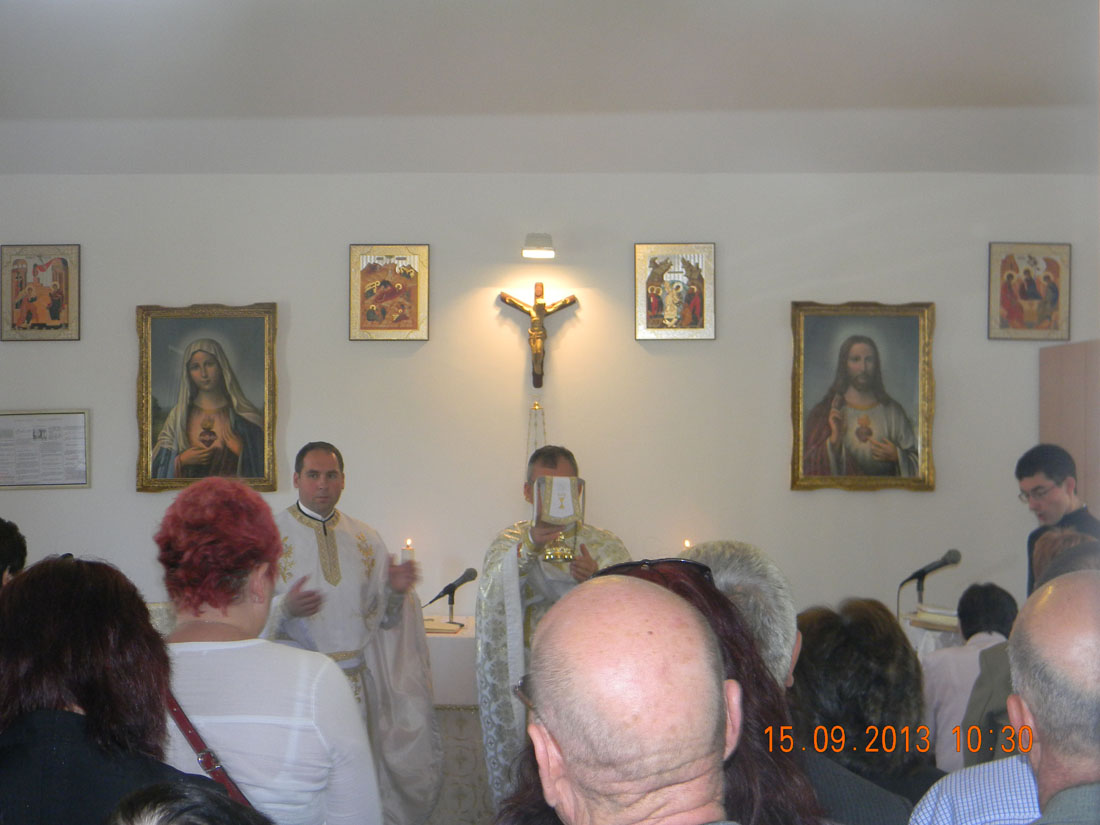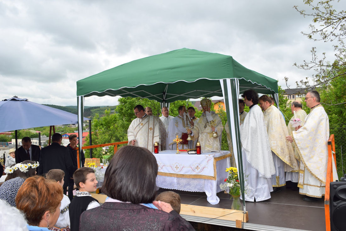 Sfânta Liturghie s-a celebrat la masa altarului improvizat, de către PS Florentin asistat de un sobor de preoți, între care pr. Cristian Sabău, protopop de Cluj I, pr. consilier Romulus Silaghi, pr. consilier Marius Cerghizan, preoți clujeni și preoți invitați, între care pr. Andrei Borzași de la Oradea și pr. Gelu Ardelean, protopop de Turda. Răspunsurile liturgice le-au dat studenți ai Seminarului Teologic eparhial din Cluj-Napoca. O participare numeroasă a fost din partea Reuniunii Mariane, foarte activă în această parohie; de asemenea au fost de față primarul localității, autorități locale, enoriașii parohiei.