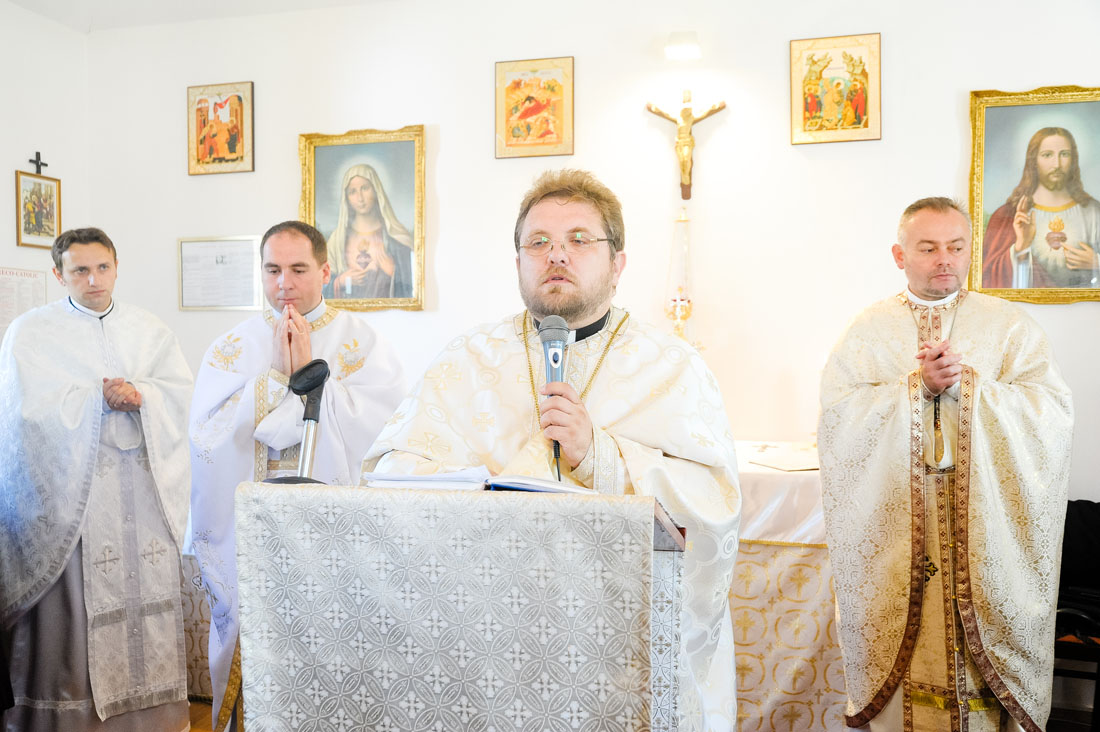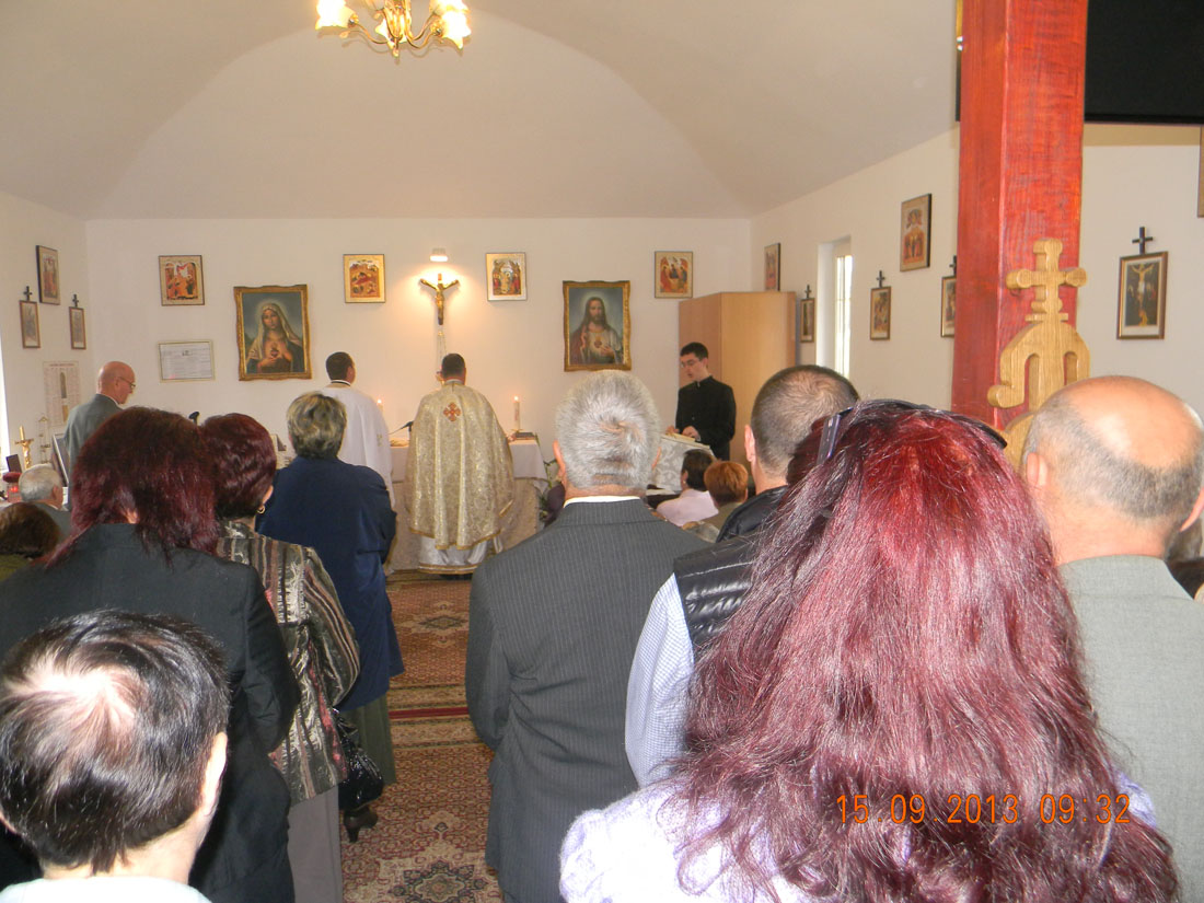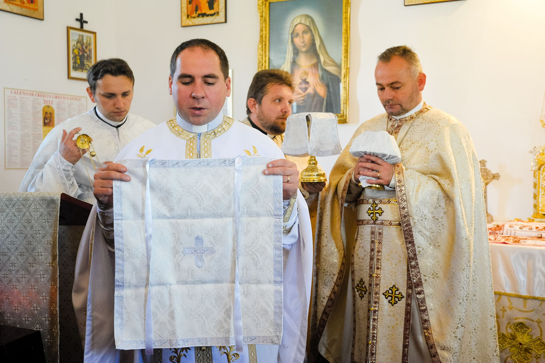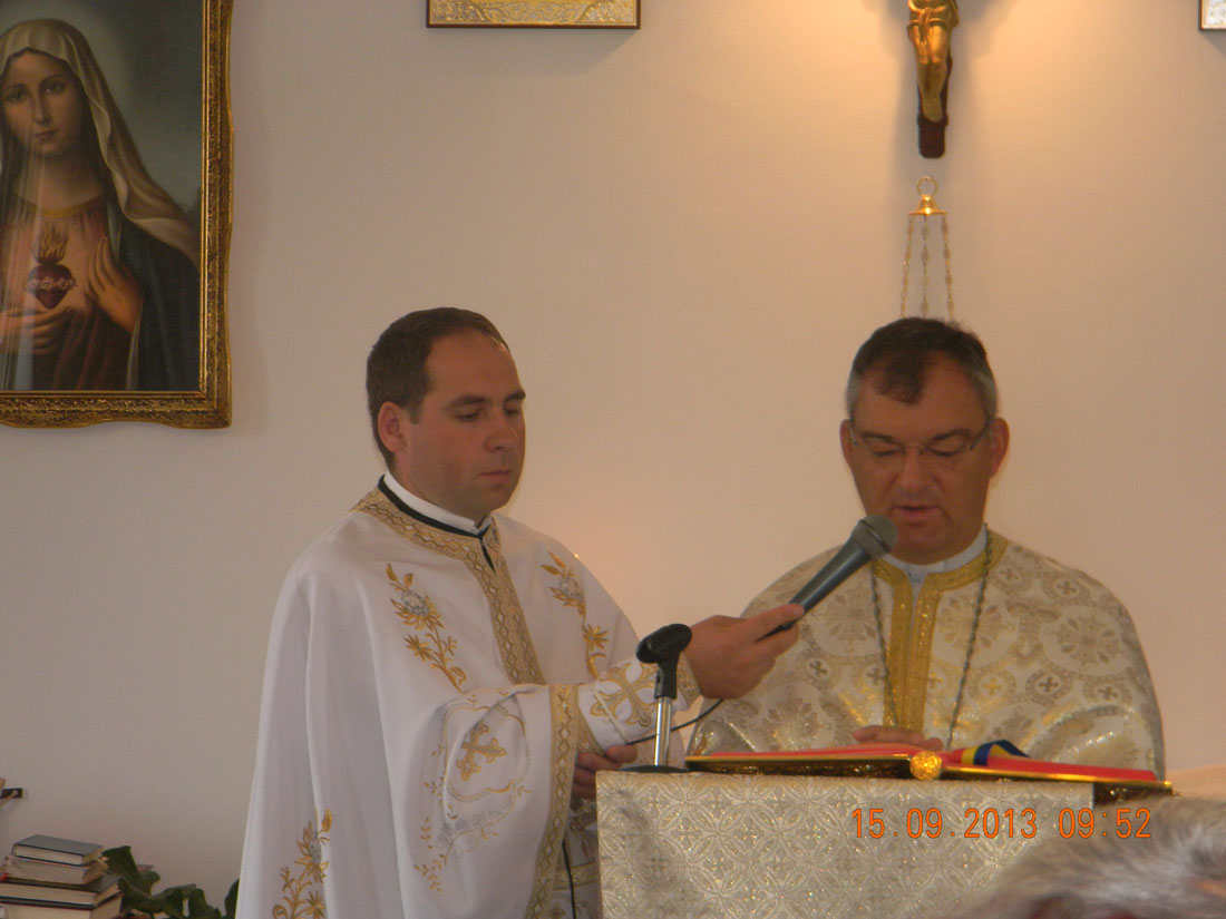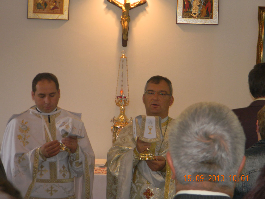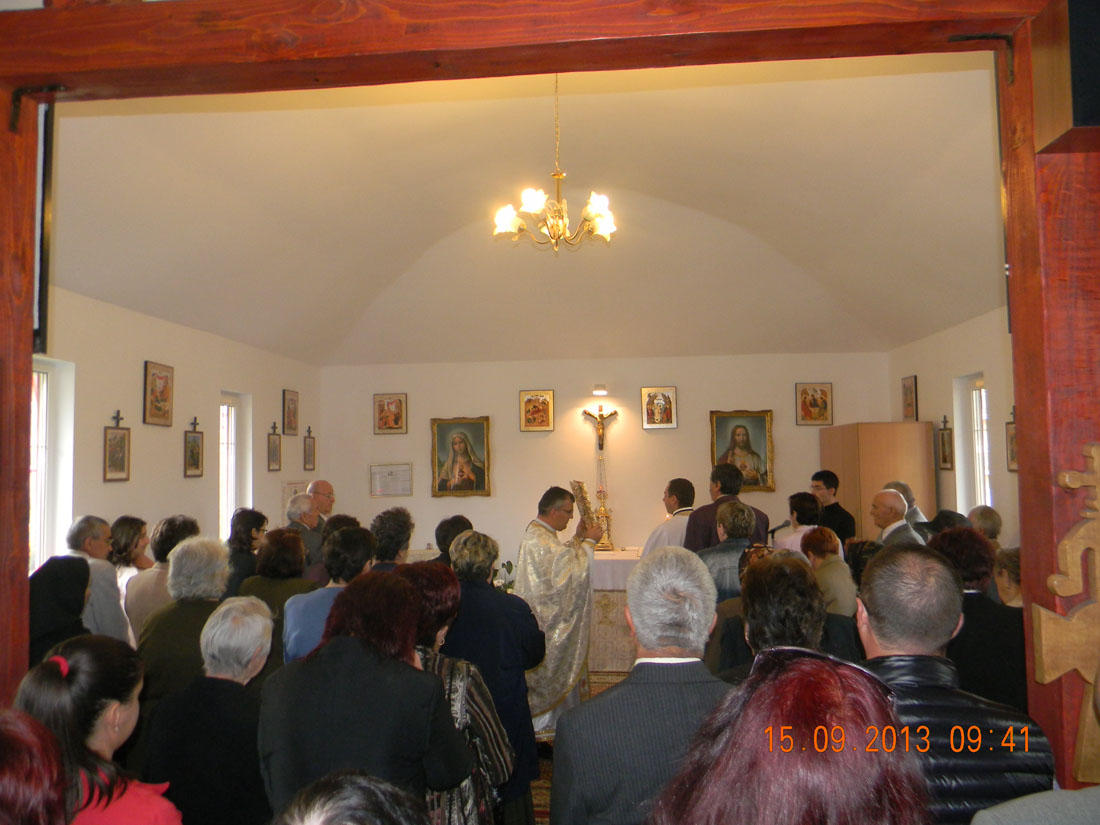 Sfânta Liturghie s-a celebrat la masa altarului improvizat, de către PS Florentin asistat de un sobor de preoți, între care pr. Cristian Sabău, protopop de Cluj I, pr. consilier Romulus Silaghi, pr. consilier Marius Cerghizan, preoți clujeni și preoți invitați, între care pr. Andrei Borzași de la Oradea și pr. Gelu Ardelean, protopop de Turda. Răspunsurile liturgice le-au dat studenți ai Seminarului Teologic eparhial din Cluj-Napoca. O participare numeroasă a fost din partea Reuniunii Mariane, foarte activă în această parohie; de asemenea au fost de față primarul localității, autorități locale, enoriașii parohiei.