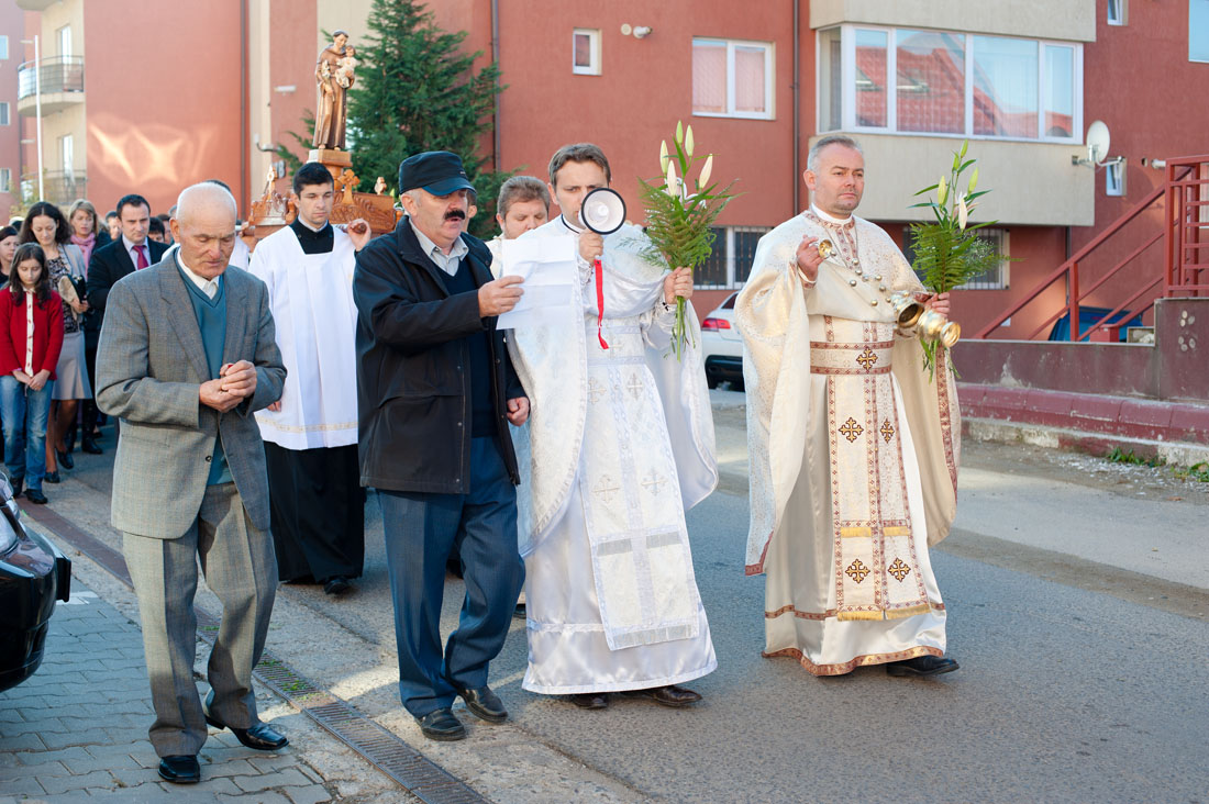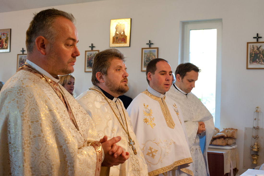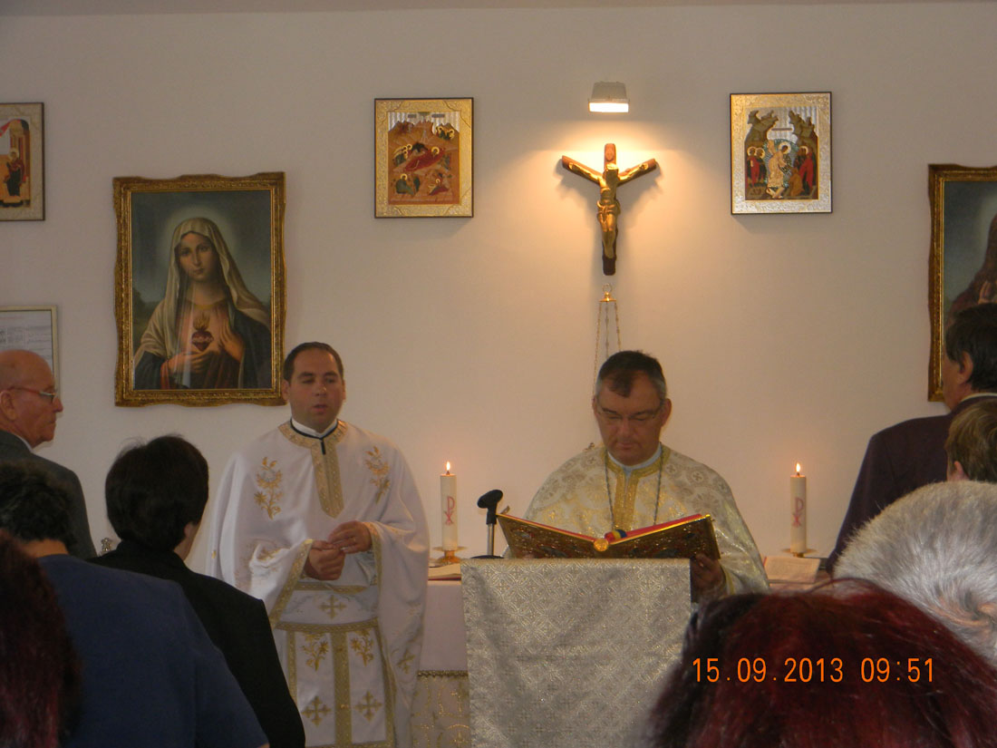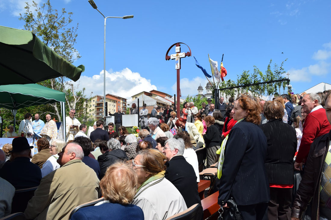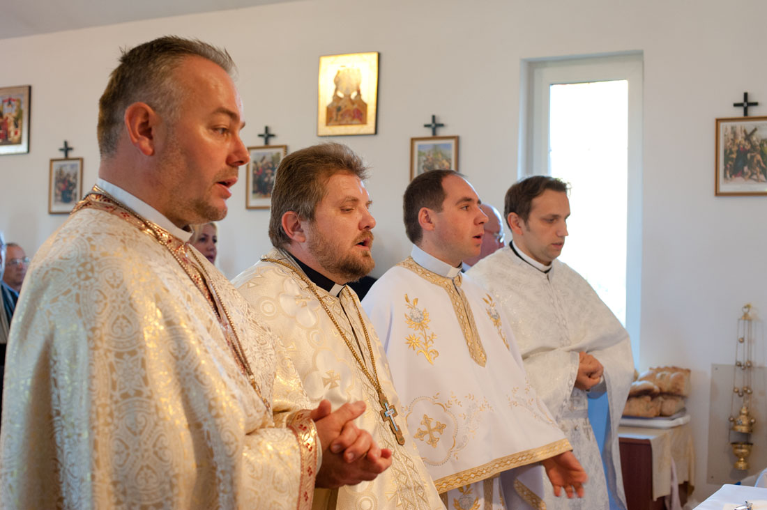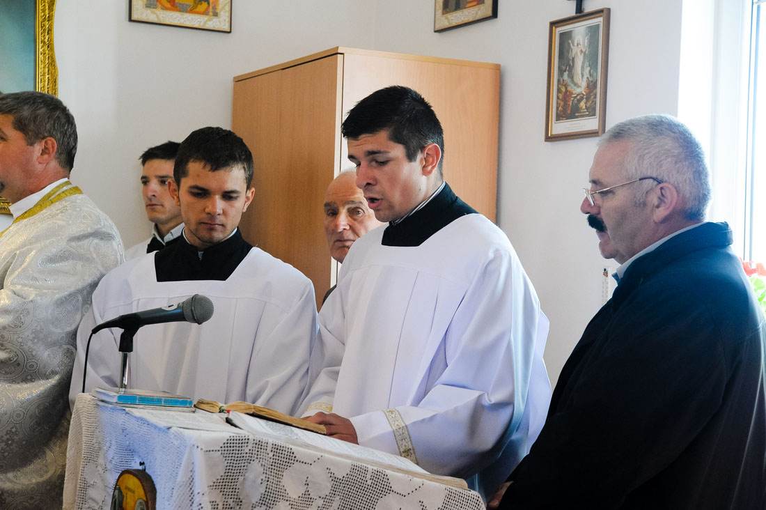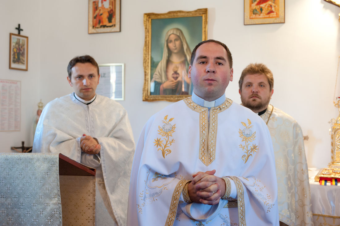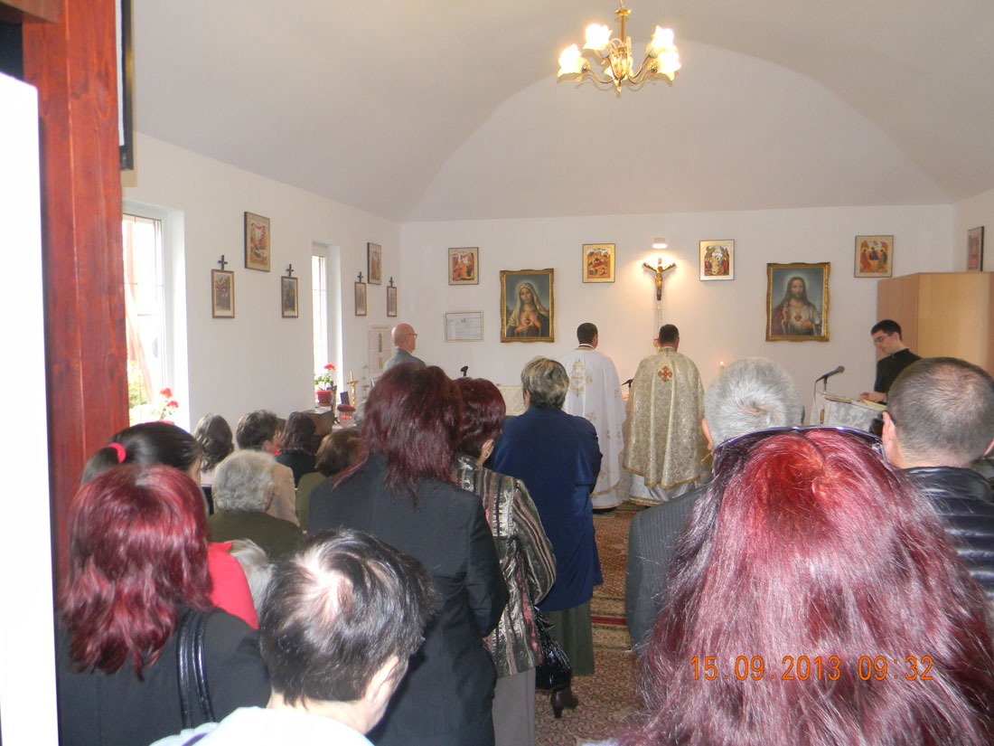 Sfânta Liturghie s-a celebrat la masa altarului improvizat, de către PS Florentin asistat de un sobor de preoți, între care pr. Cristian Sabău, protopop de Cluj I, pr. consilier Romulus Silaghi, pr. consilier Marius Cerghizan, preoți clujeni și preoți invitați, între care pr. Andrei Borzași de la Oradea și pr. Gelu Ardelean, protopop de Turda. Răspunsurile liturgice le-au dat studenți ai Seminarului Teologic eparhial din Cluj-Napoca. O participare numeroasă a fost din partea Reuniunii Mariane, foarte activă în această parohie; de asemenea au fost de față primarul localității, autorități locale, enoriașii parohiei.