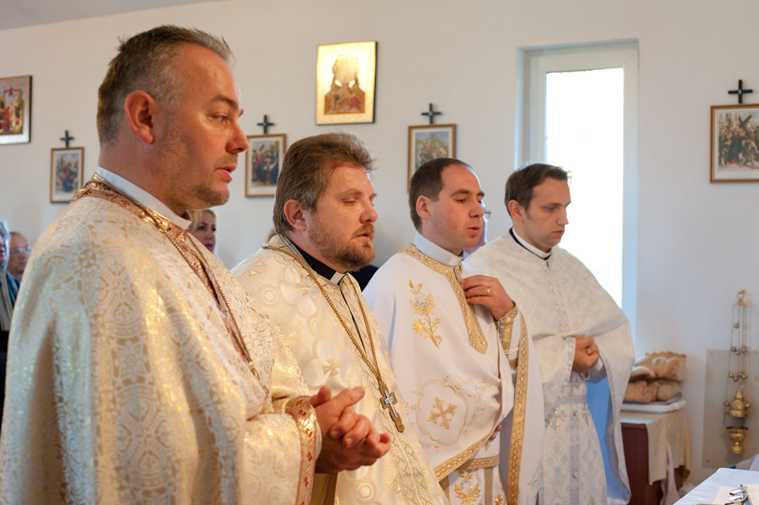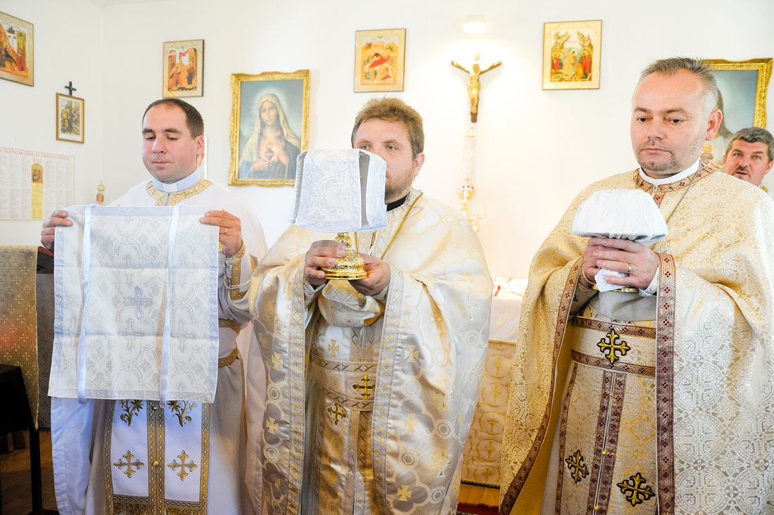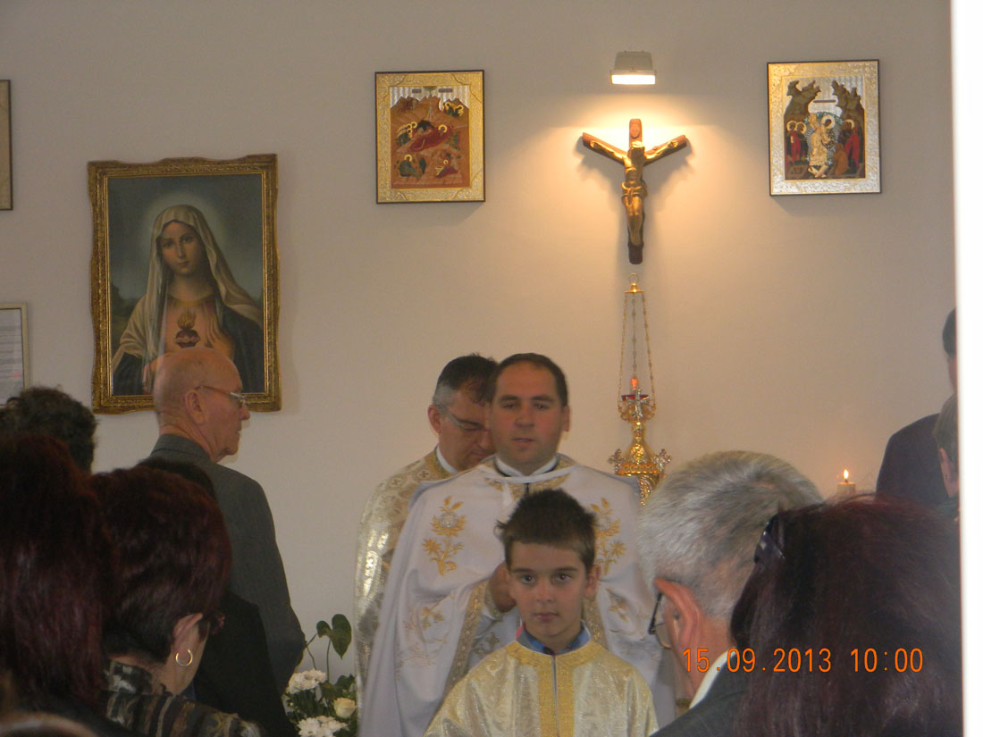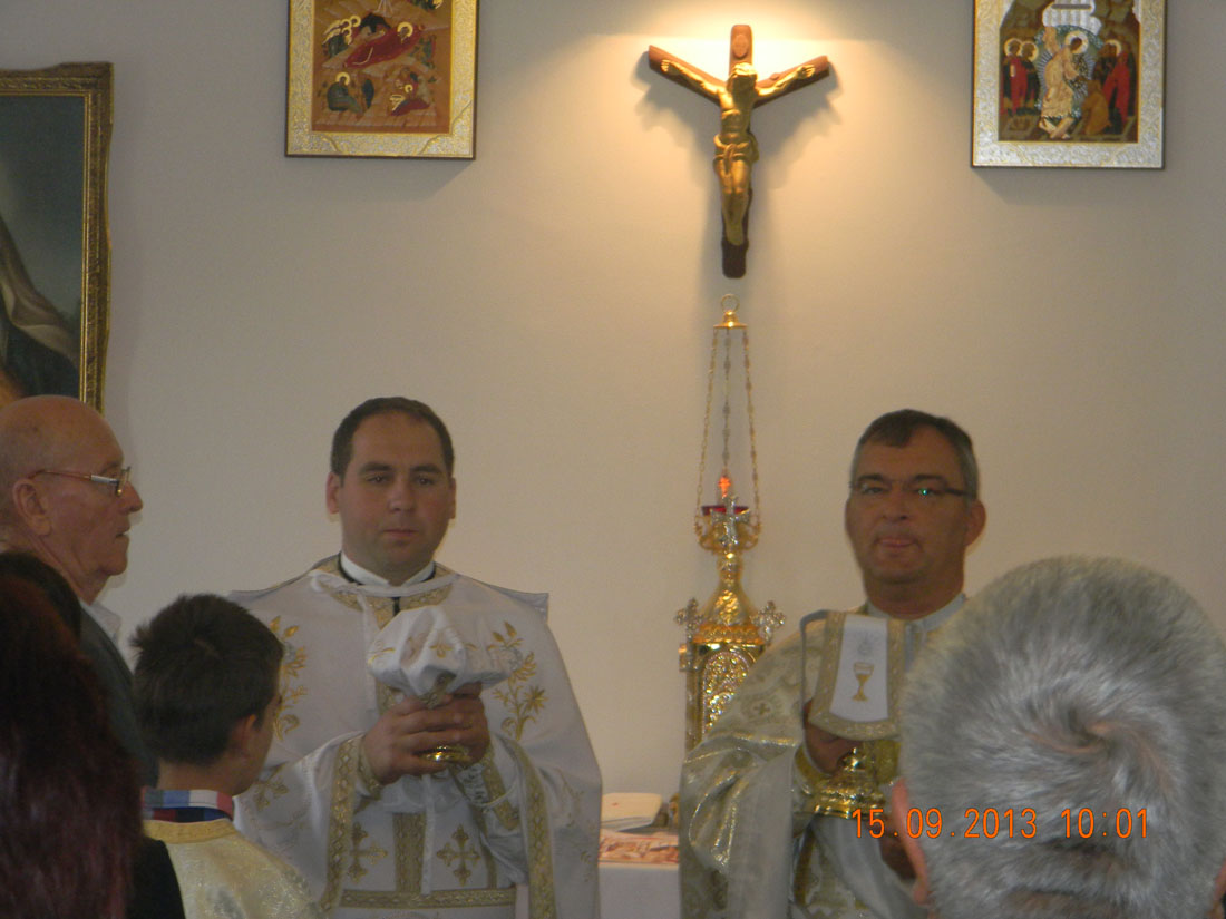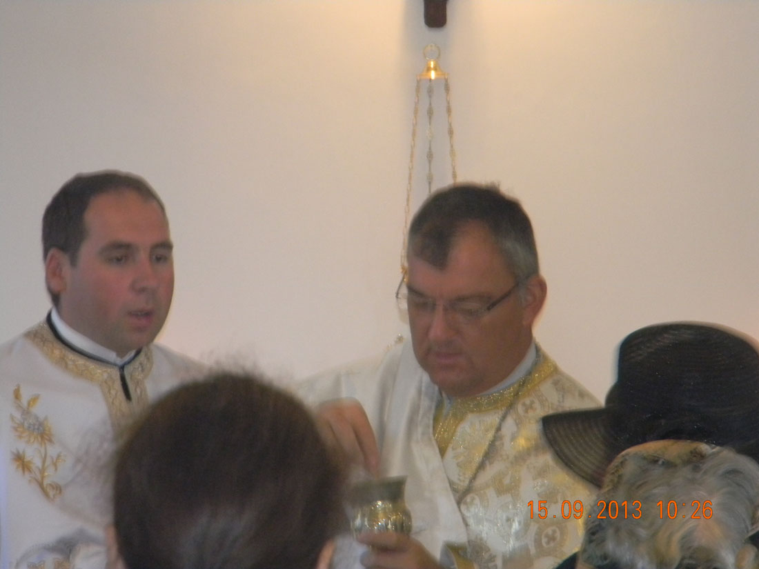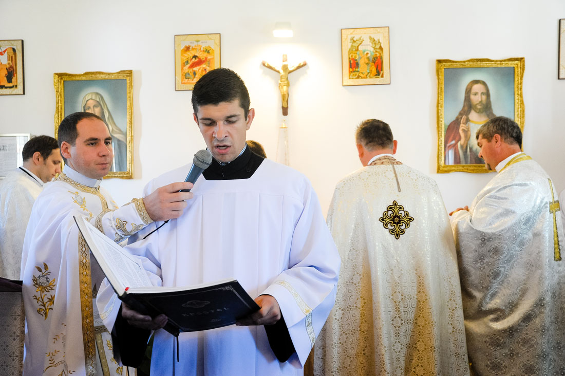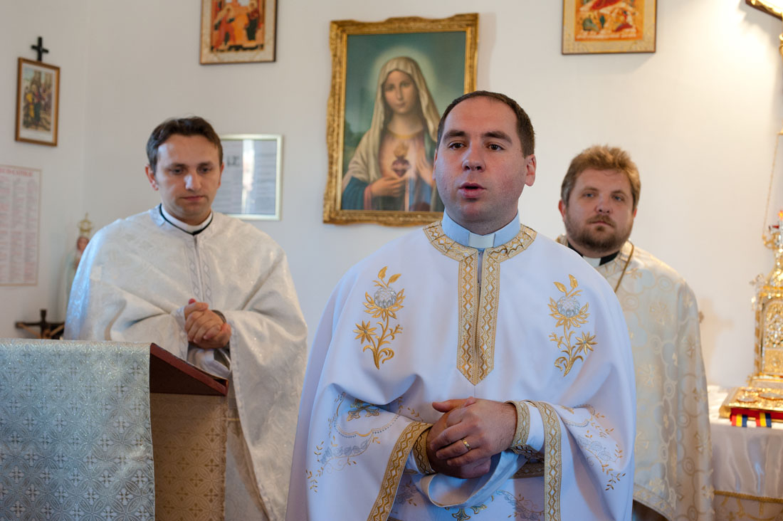 Sfânta Liturghie s-a celebrat la masa altarului improvizat, de către PS Florentin asistat de un sobor de preoți, între care pr. Cristian Sabău, protopop de Cluj I, pr. consilier Romulus Silaghi, pr. consilier Marius Cerghizan, preoți clujeni și preoți invitați, între care pr. Andrei Borzași de la Oradea și pr. Gelu Ardelean, protopop de Turda. Răspunsurile liturgice le-au dat studenți ai Seminarului Teologic eparhial din Cluj-Napoca. O participare numeroasă a fost din partea Reuniunii Mariane, foarte activă în această parohie; de asemenea au fost de față primarul localității, autorități locale, enoriașii parohiei.