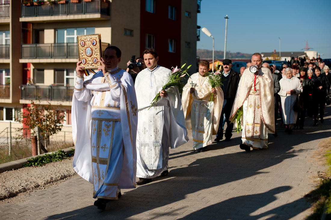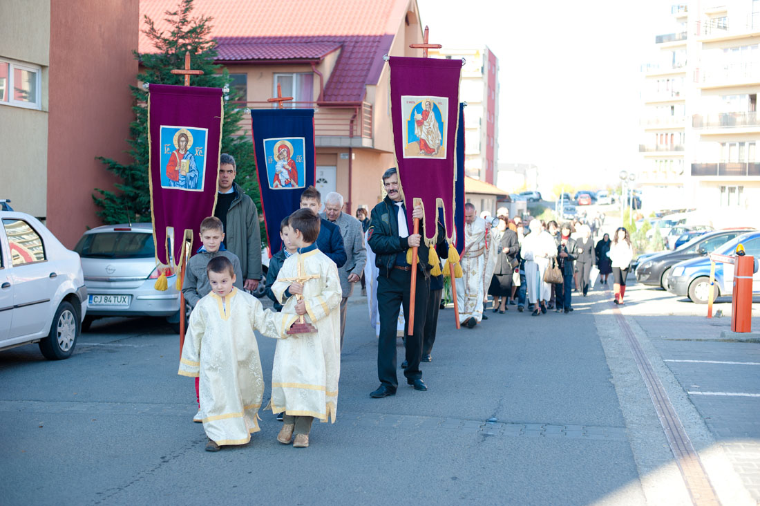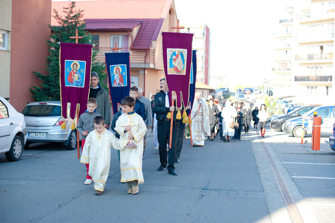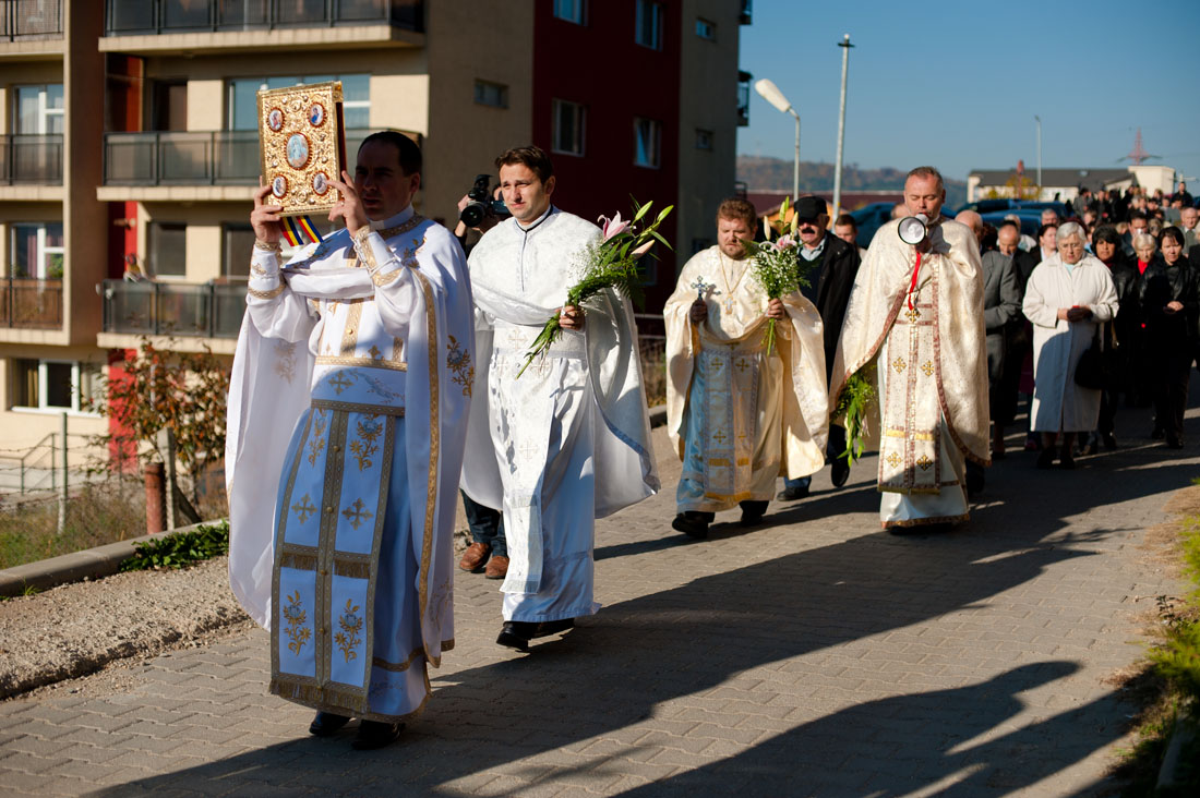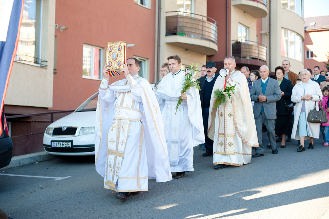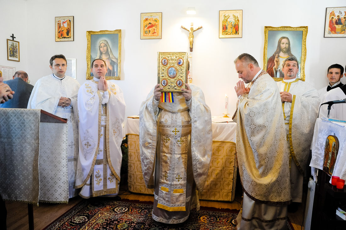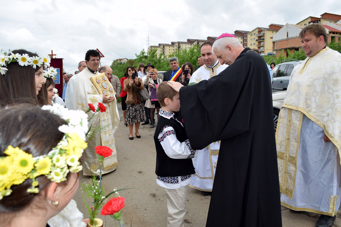 Ierarhul a fost întâmpinat în mod tradițional, cu pâine și sare, de pr. paroh Ioan Pașca, pr. Mircea Marțian, protopop de Cluj, pr. Marius Cerghizan, protopop de Someș, preoți din Cluj-Napoca și împrejurimi, autorități locale, membre ale Reuniunii Mariane parohiale – cu un efectiv mare și foarte activă în această parohie – mulți credincioși. Copiii, în port popular – straiul de sărbătoare al bunicilor și străbunicilor lor -, i-au oferit Episcopului flori și bucuria lor a adus lumină în sufletele celor care au luat parte la celebrare. După intrarea în procesiune în biserică, a fost celebrată Sfânta Liturghie, cu răspunsurile liturgice oferite de studenți ai Seminarului eparhial „Sf. Ioan Evanghelistul” din Cluj-Napoca. Au ajutat la celebrare dc. Ovidiu Lucian Marișca, cancelar eparhial, subdiaconii Romulus Iușan și Ionuț Mihu.