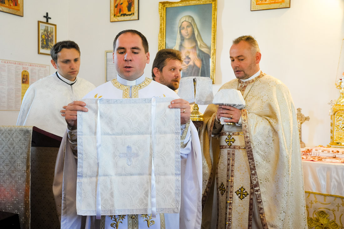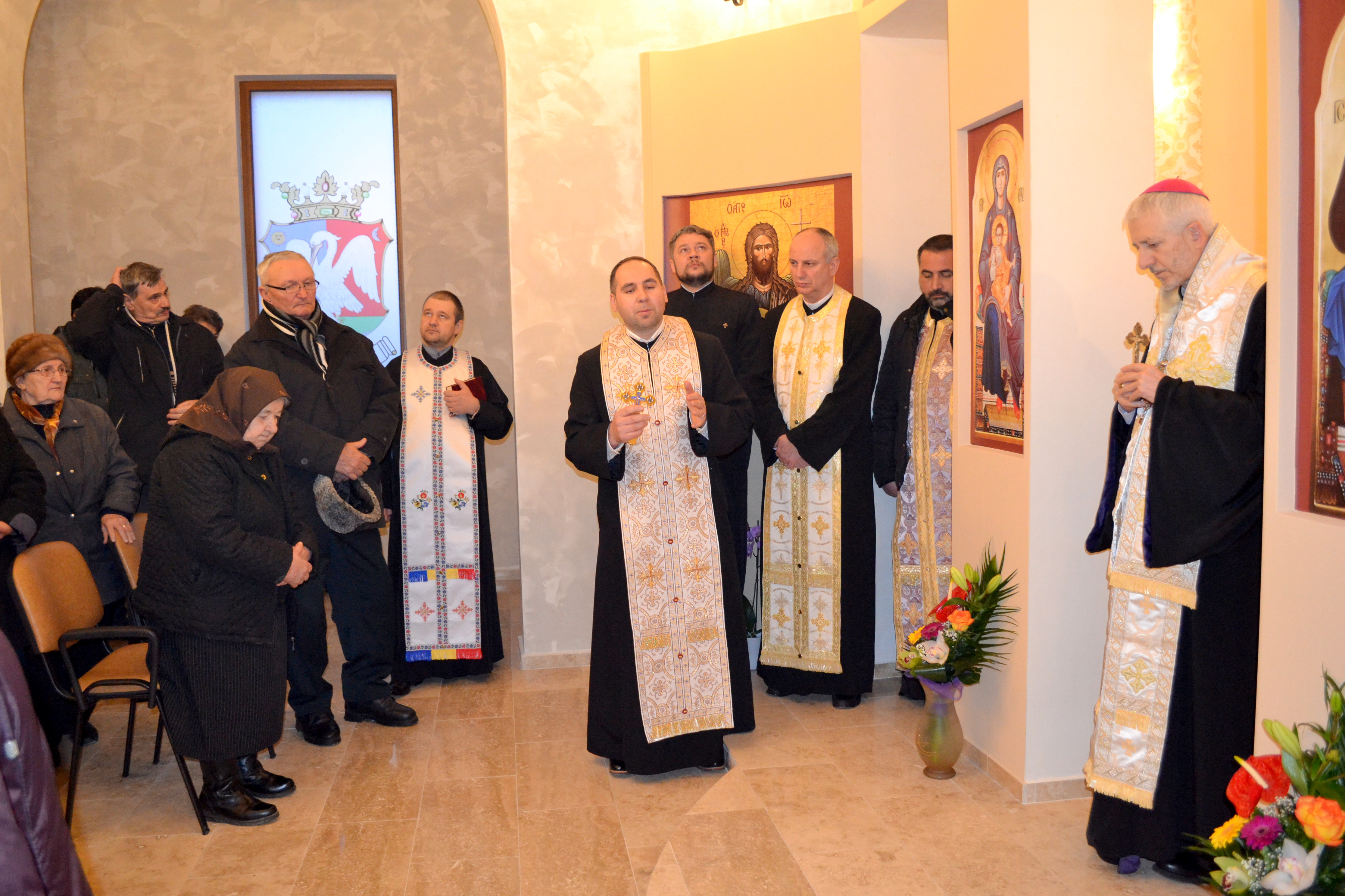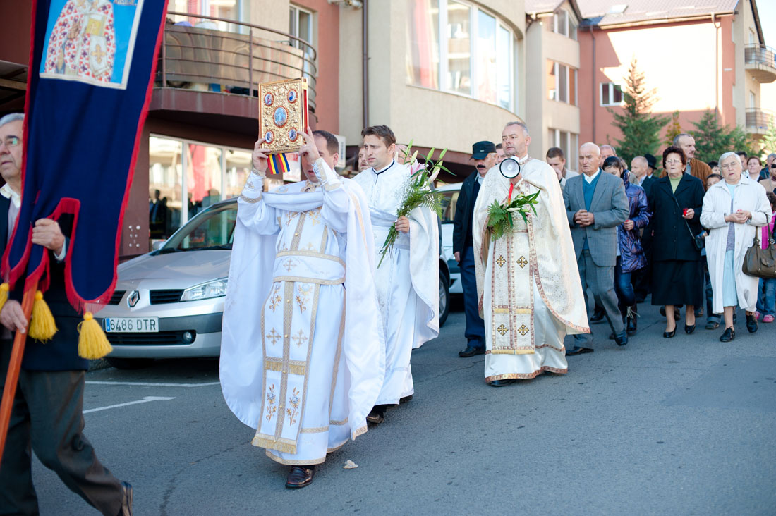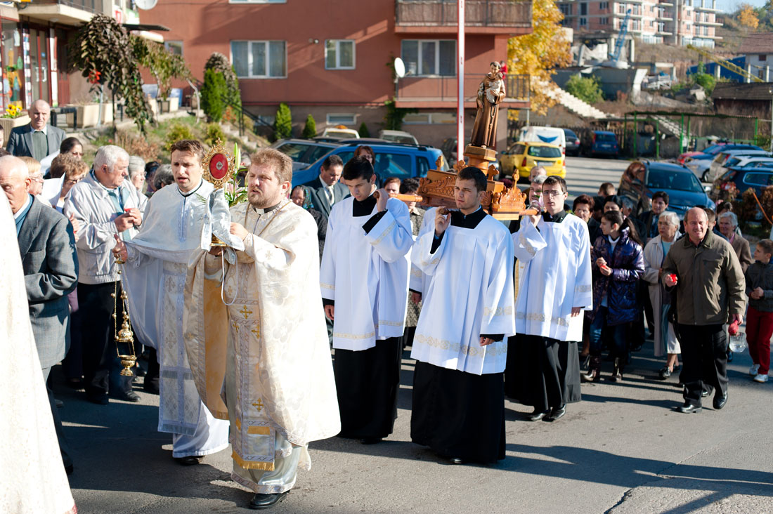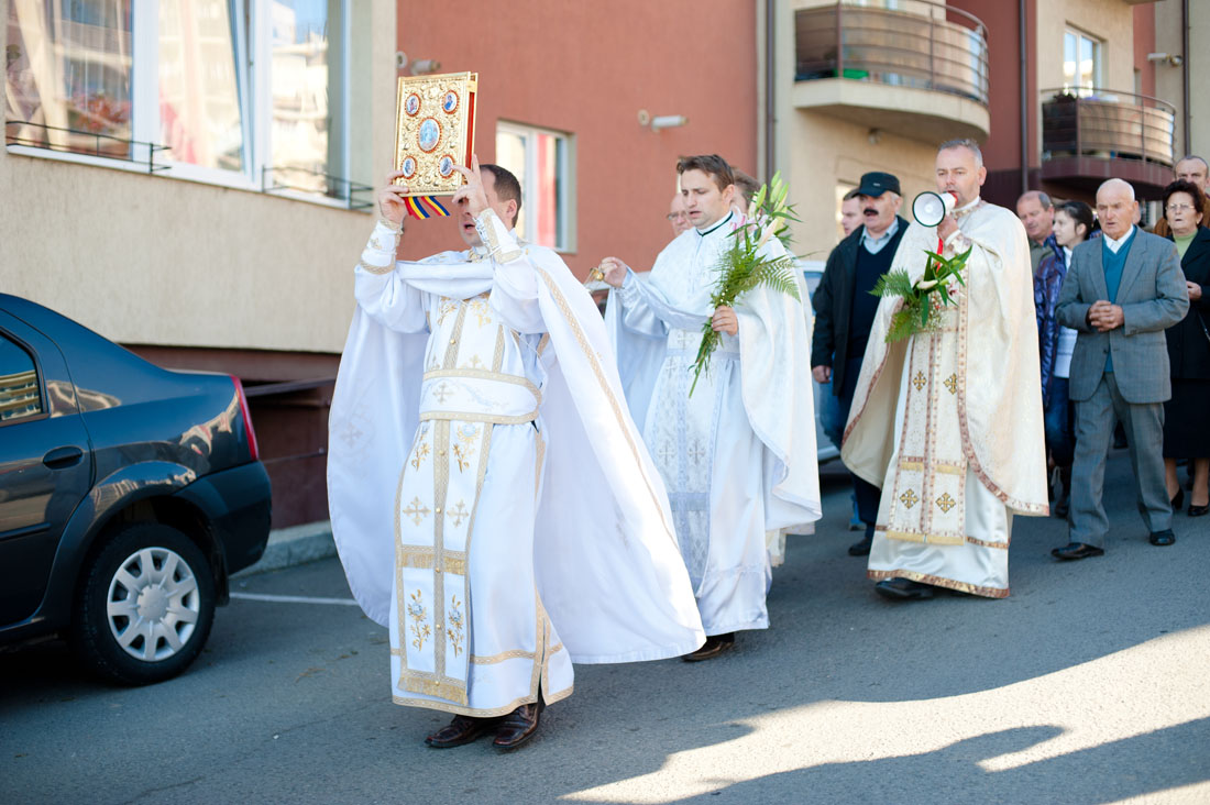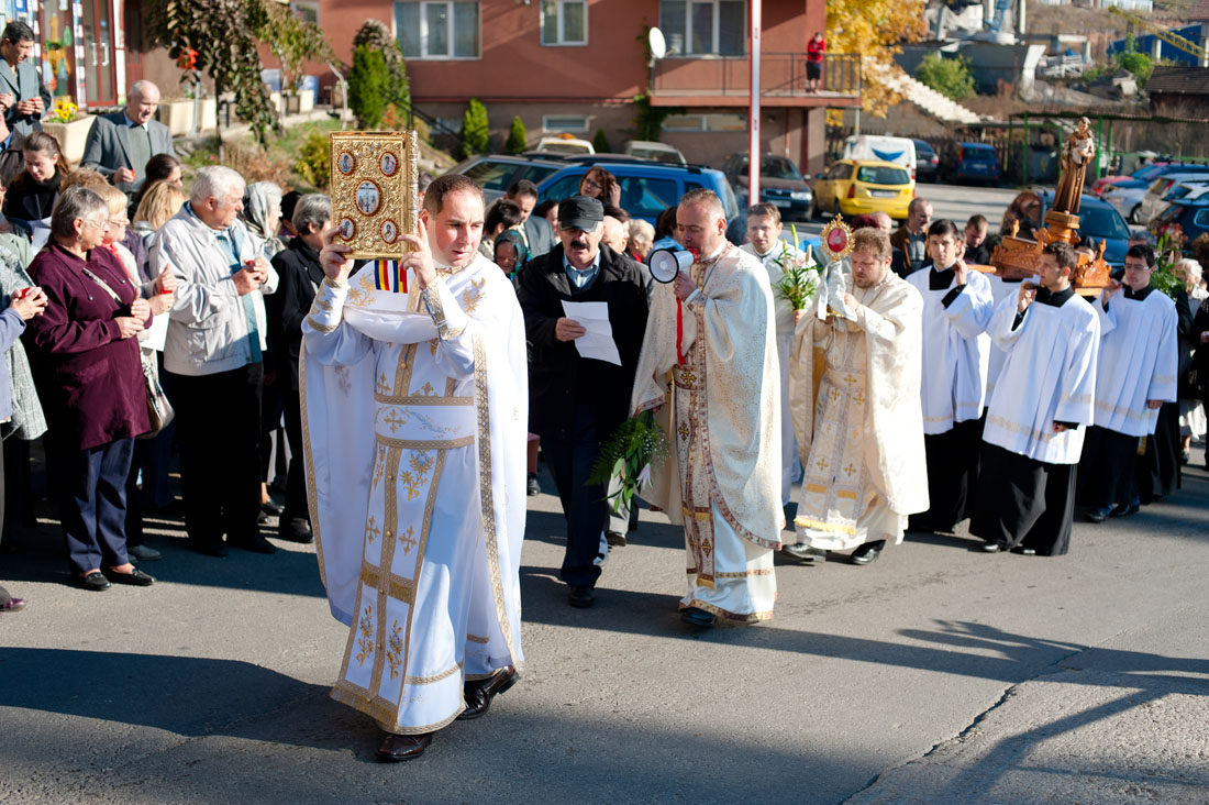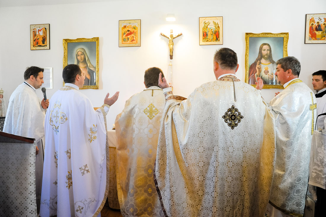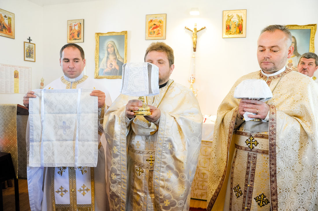 Ierarhul a fost întâmpinat în mod tradițional, cu pâine și sare, de pr. paroh Ioan Pașca, pr. Mircea Marțian, protopop de Cluj, pr. Marius Cerghizan, protopop de Someș, preoți din Cluj-Napoca și împrejurimi, autorități locale, membre ale Reuniunii Mariane parohiale – cu un efectiv mare și foarte activă în această parohie – mulți credincioși. Copiii, în port popular – straiul de sărbătoare al bunicilor și străbunicilor lor -, i-au oferit Episcopului flori și bucuria lor a adus lumină în sufletele celor care au luat parte la celebrare. După intrarea în procesiune în biserică, a fost celebrată Sfânta Liturghie, cu răspunsurile liturgice oferite de studenți ai Seminarului eparhial „Sf. Ioan Evanghelistul” din Cluj-Napoca. Au ajutat la celebrare dc. Ovidiu Lucian Marișca, cancelar eparhial, subdiaconii Romulus Iușan și Ionuț Mihu.