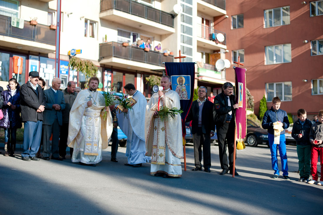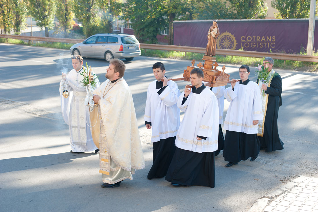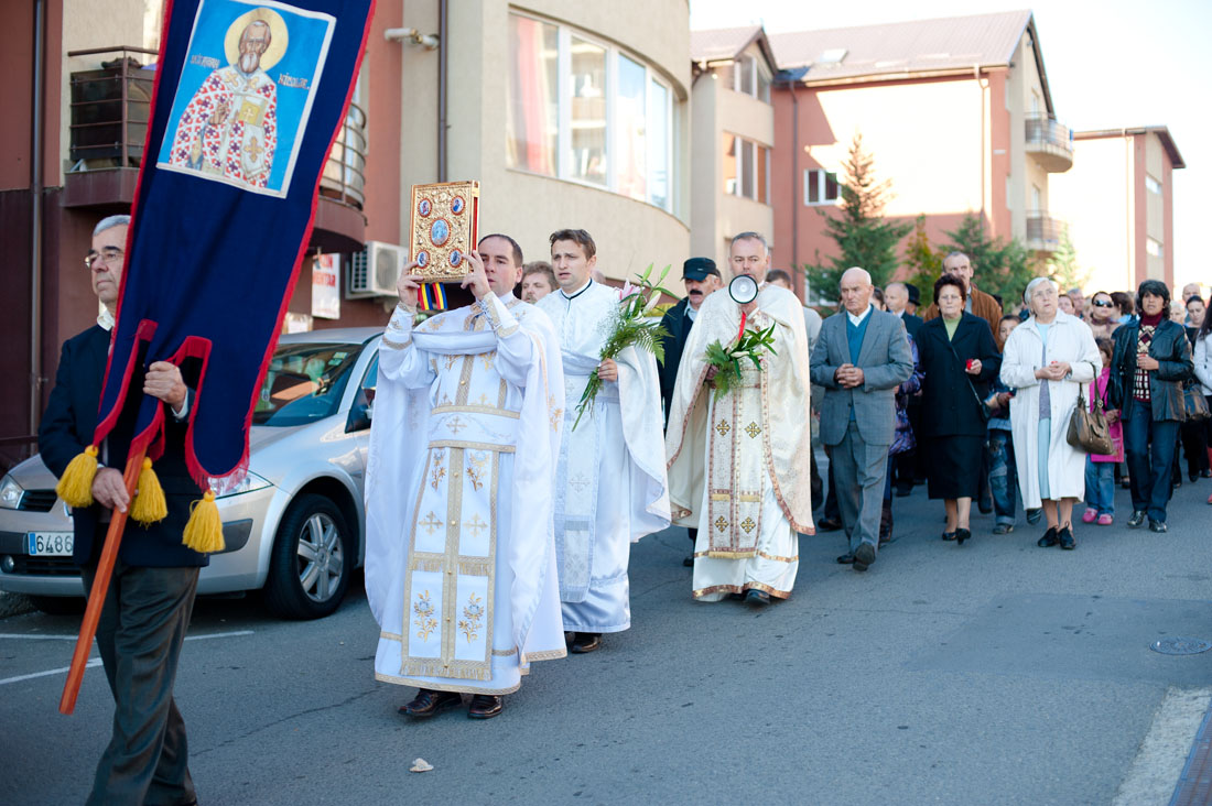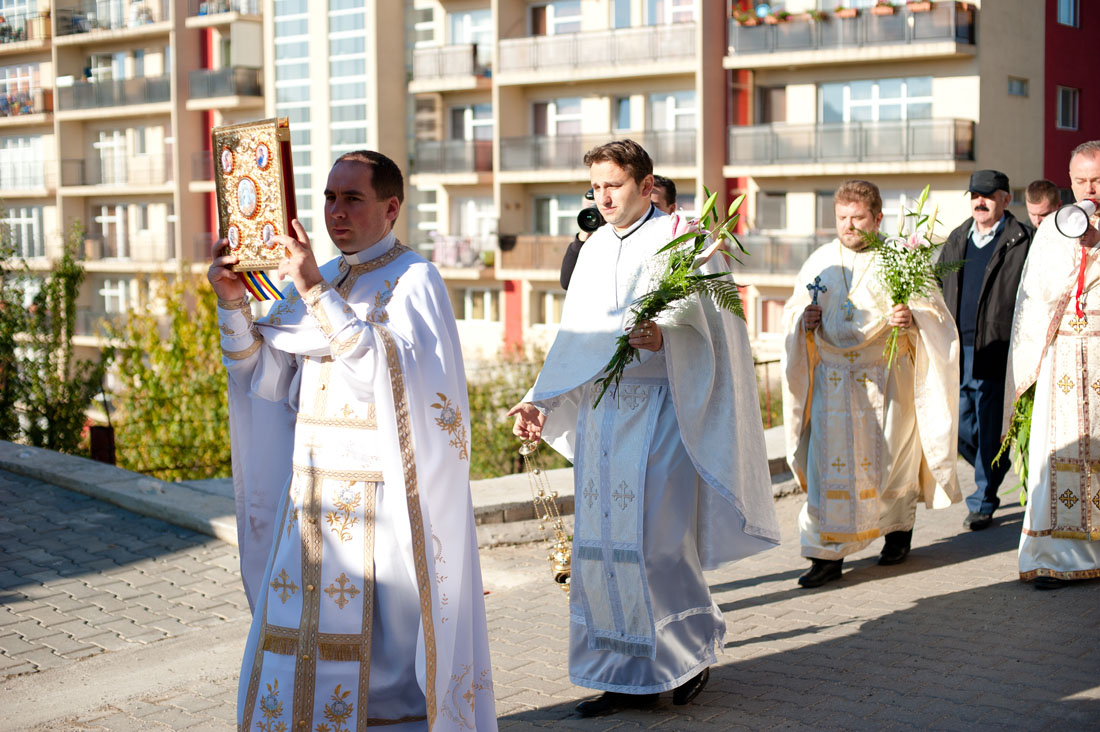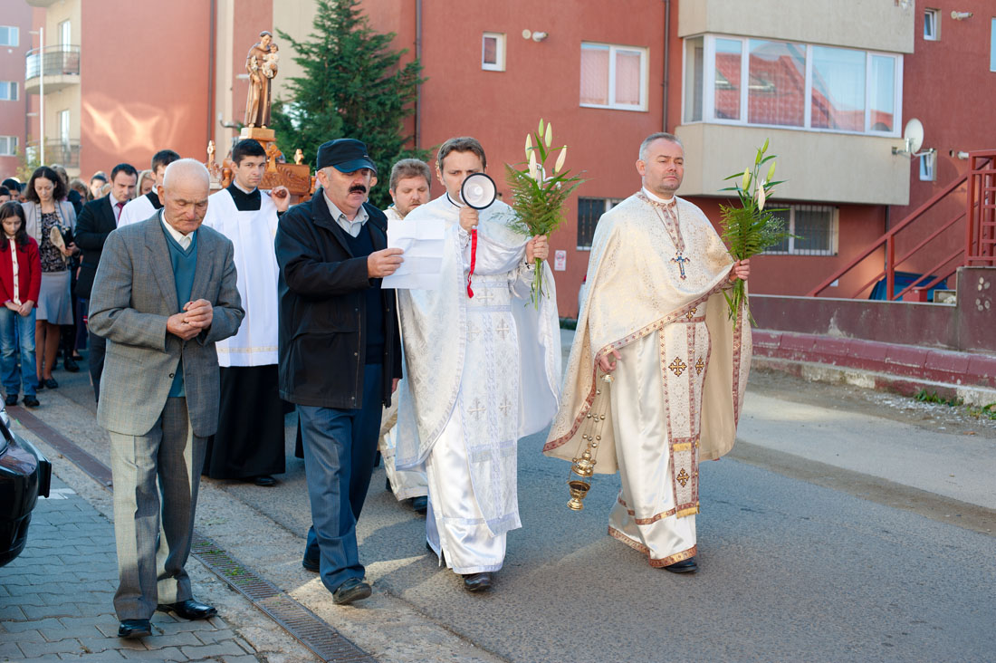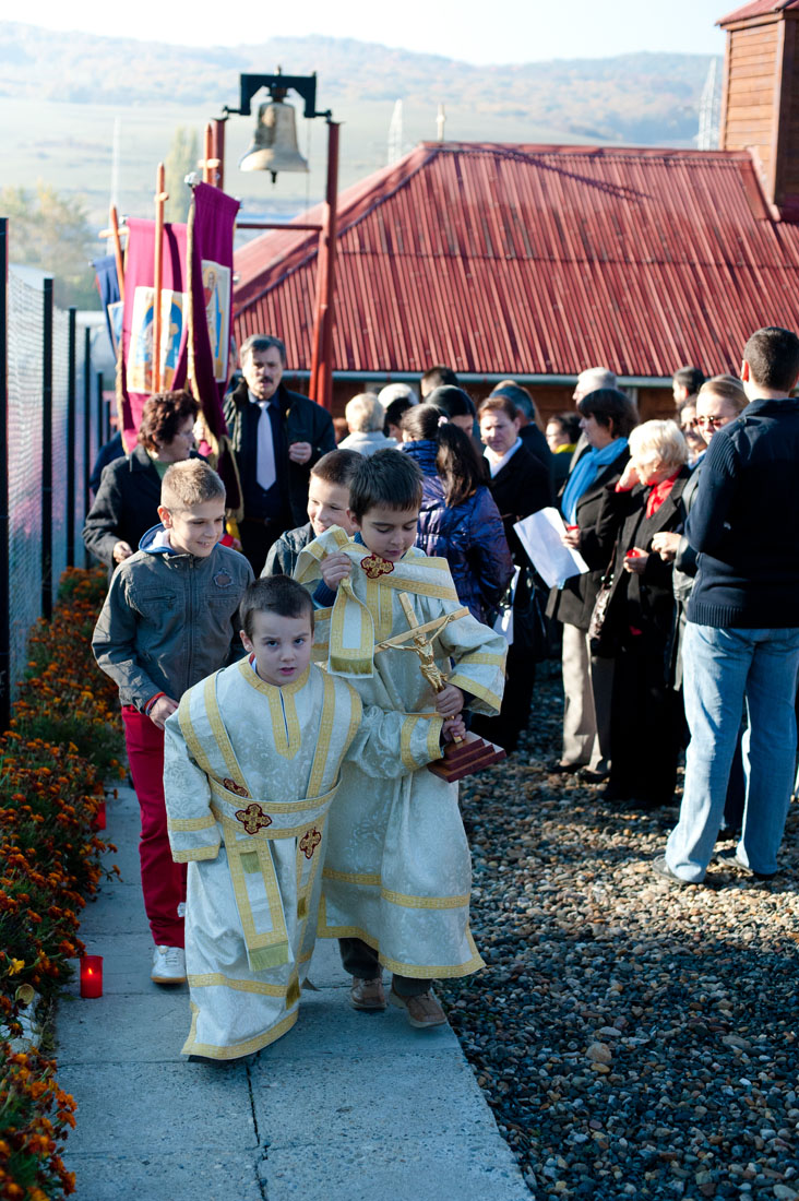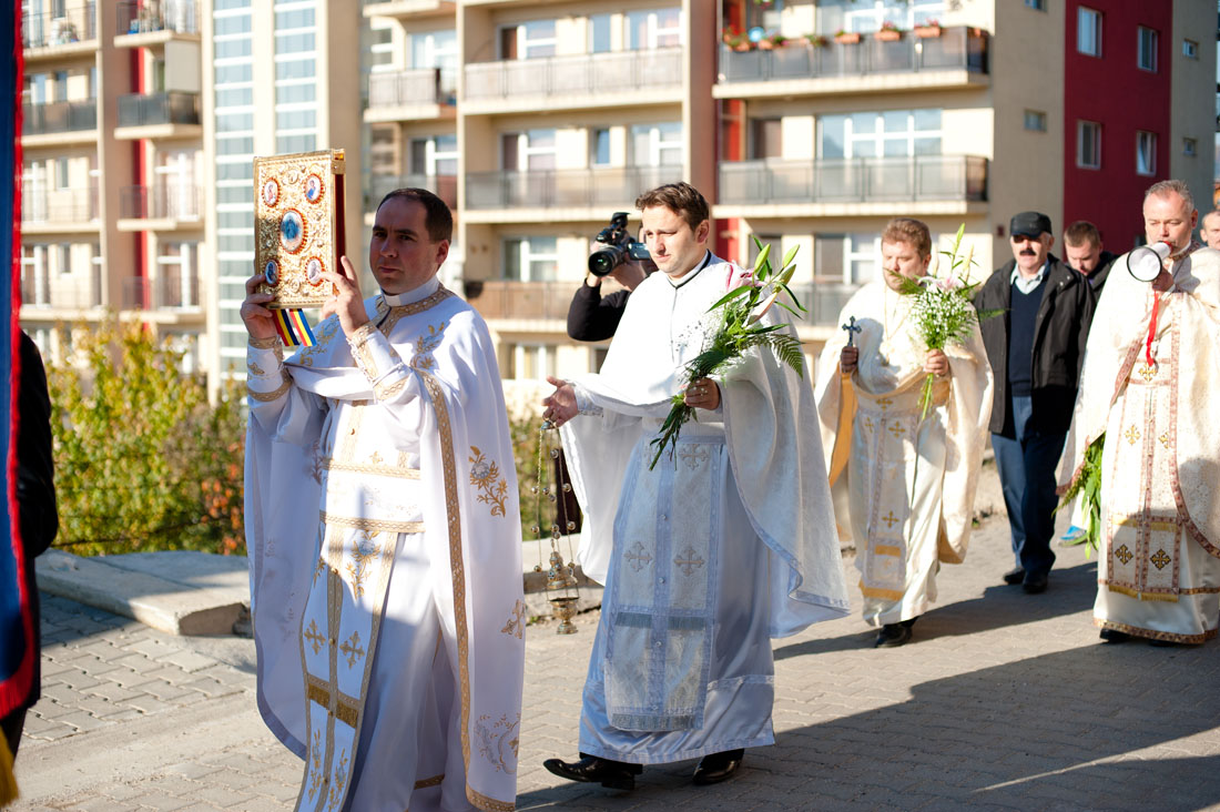 Ierarhul a fost întâmpinat în mod tradițional, cu pâine și sare, de pr. paroh Ioan Pașca, pr. Mircea Marțian, protopop de Cluj, pr. Marius Cerghizan, protopop de Someș, preoți din Cluj-Napoca și împrejurimi, autorități locale, membre ale Reuniunii Mariane parohiale – cu un efectiv mare și foarte activă în această parohie – mulți credincioși. Copiii, în port popular – straiul de sărbătoare al bunicilor și străbunicilor lor -, i-au oferit Episcopului flori și bucuria lor a adus lumină în sufletele celor care au luat parte la celebrare. După intrarea în procesiune în biserică, a fost celebrată Sfânta Liturghie, cu răspunsurile liturgice oferite de studenți ai Seminarului eparhial „Sf. Ioan Evanghelistul” din Cluj-Napoca. Au ajutat la celebrare dc. Ovidiu Lucian Marișca, cancelar eparhial, subdiaconii Romulus Iușan și Ionuț Mihu.