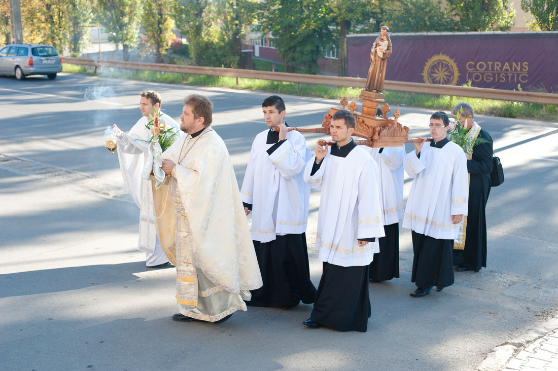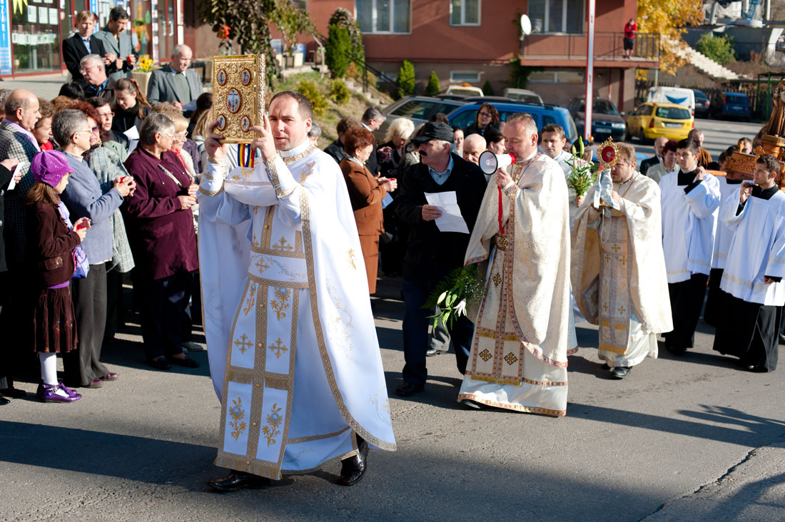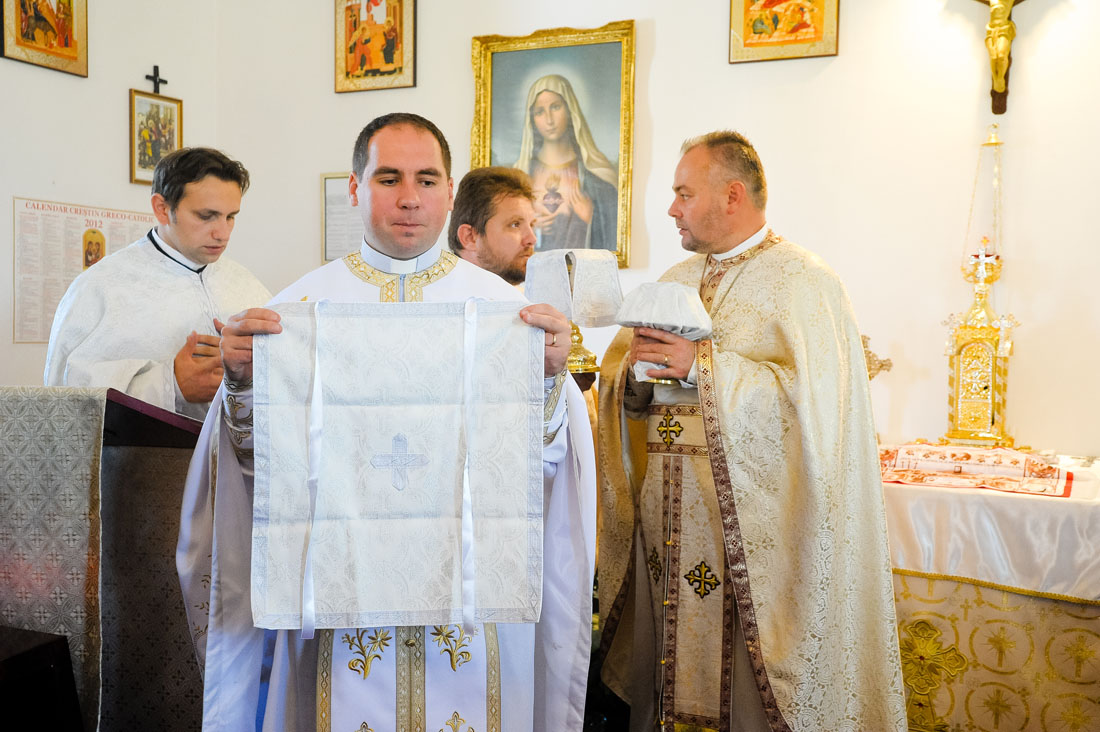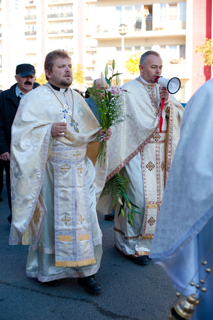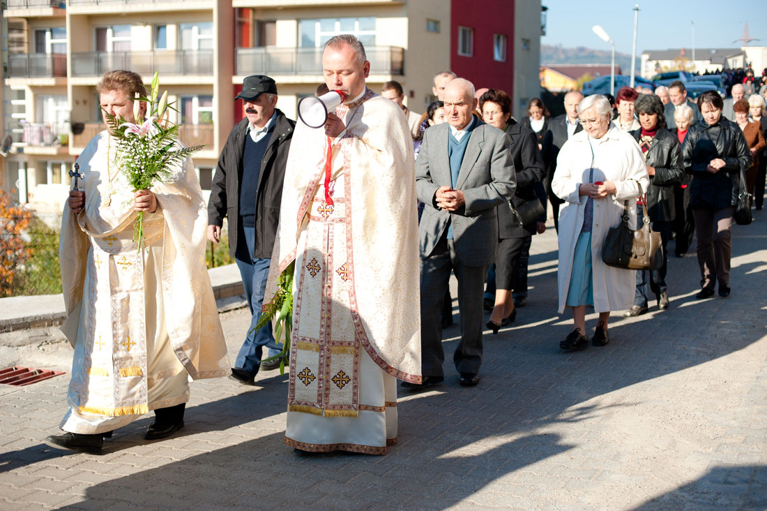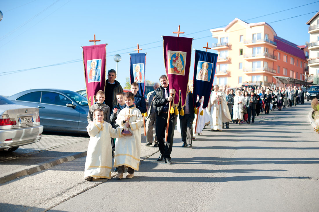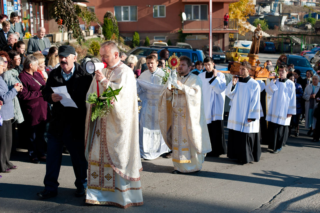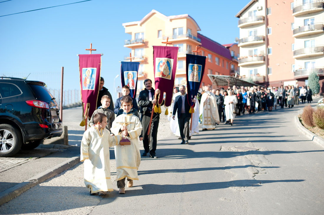 Ierarhul a fost întâmpinat în mod tradițional, cu pâine și sare, de pr. paroh Ioan Pașca, pr. Mircea Marțian, protopop de Cluj, pr. Marius Cerghizan, protopop de Someș, preoți din Cluj-Napoca și împrejurimi, autorități locale, membre ale Reuniunii Mariane parohiale – cu un efectiv mare și foarte activă în această parohie – mulți credincioși. Copiii, în port popular – straiul de sărbătoare al bunicilor și străbunicilor lor -, i-au oferit Episcopului flori și bucuria lor a adus lumină în sufletele celor care au luat parte la celebrare. După intrarea în procesiune în biserică, a fost celebrată Sfânta Liturghie, cu răspunsurile liturgice oferite de studenți ai Seminarului eparhial „Sf. Ioan Evanghelistul” din Cluj-Napoca. Au ajutat la celebrare dc. Ovidiu Lucian Marișca, cancelar eparhial, subdiaconii Romulus Iușan și Ionuț Mihu.