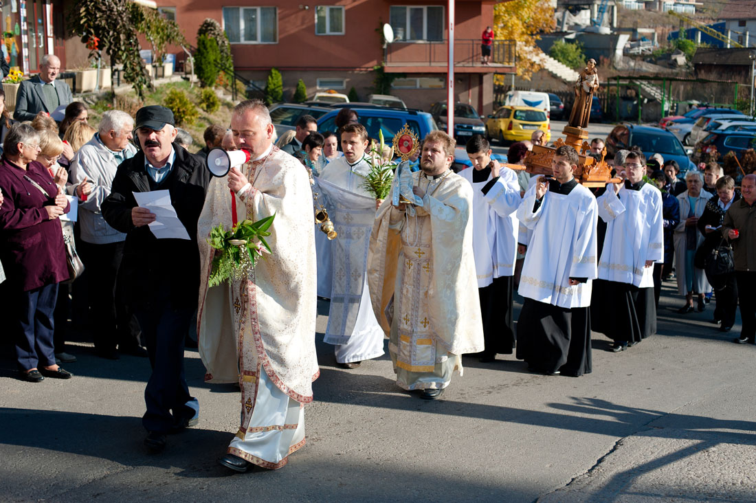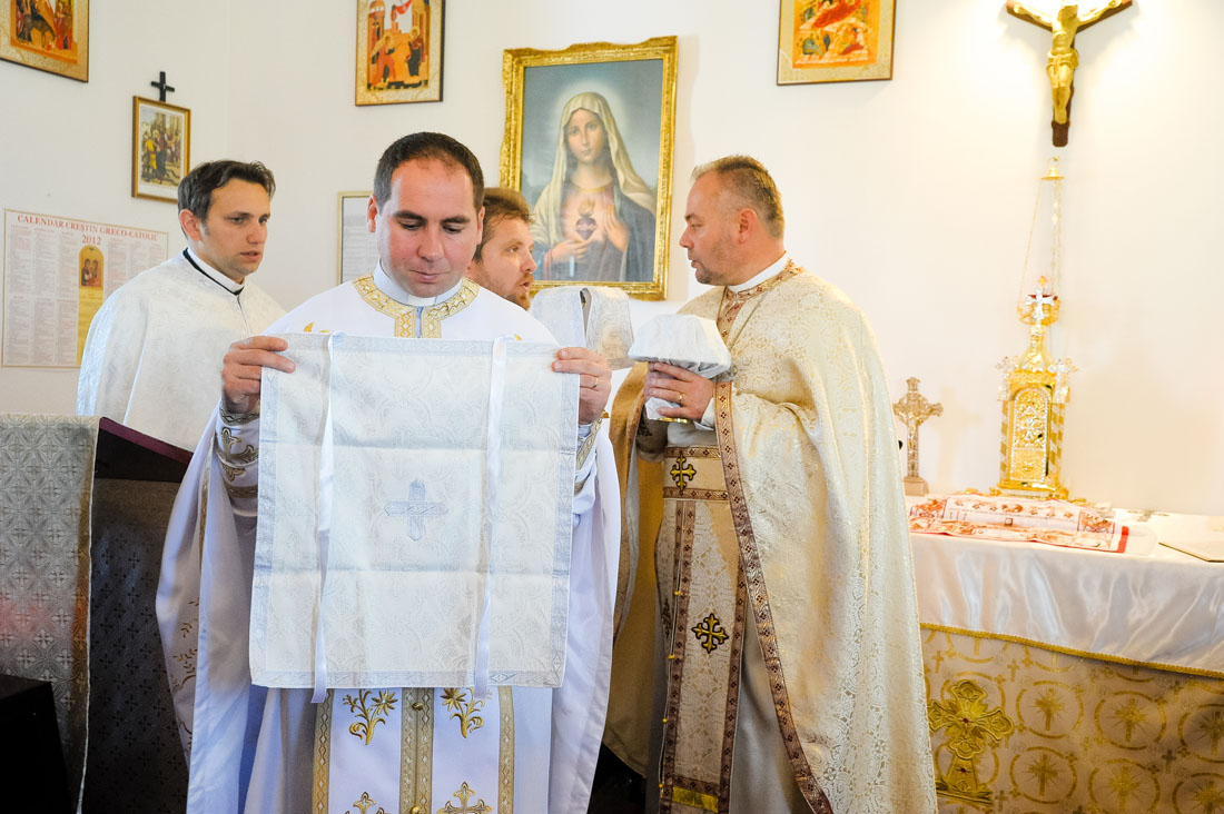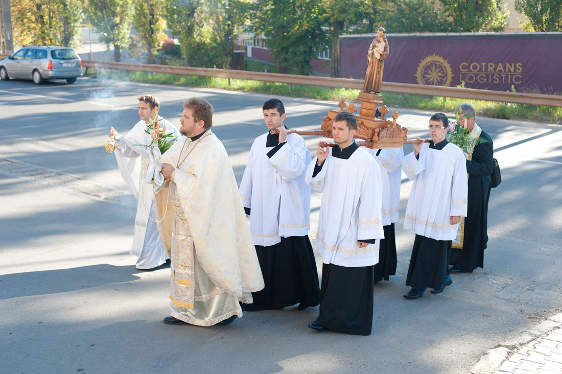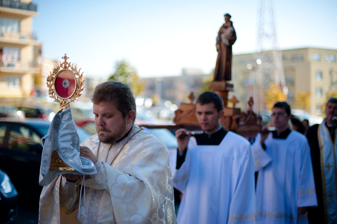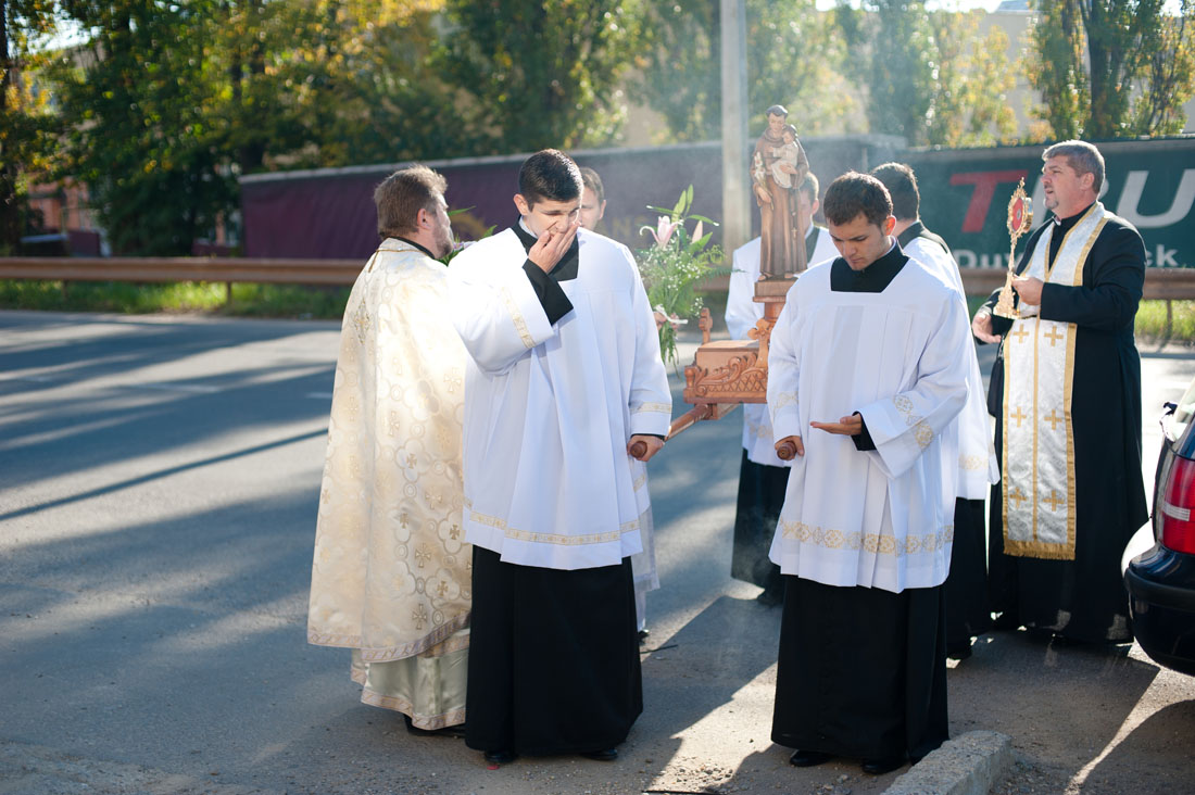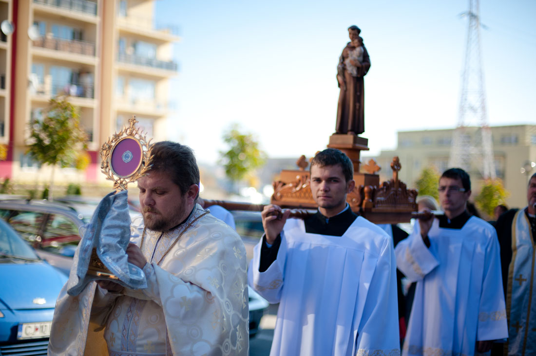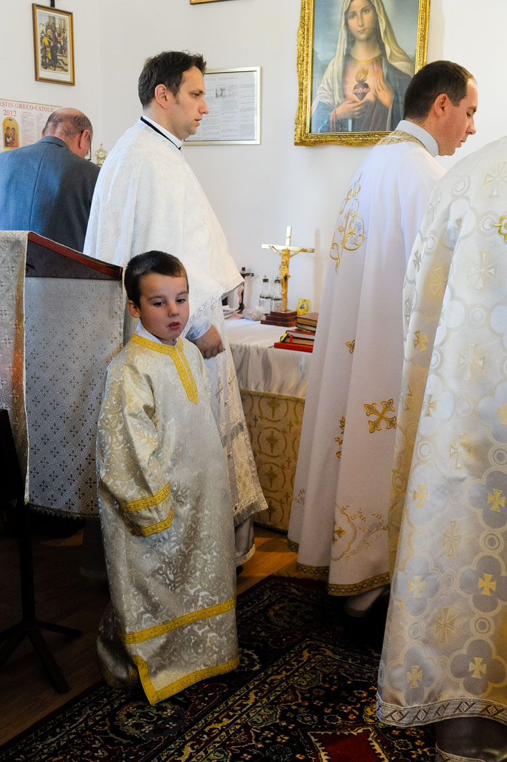 Ierarhul a fost întâmpinat în mod tradițional, cu pâine și sare, de pr. paroh Ioan Pașca, pr. Mircea Marțian, protopop de Cluj, pr. Marius Cerghizan, protopop de Someș, preoți din Cluj-Napoca și împrejurimi, autorități locale, membre ale Reuniunii Mariane parohiale – cu un efectiv mare și foarte activă în această parohie – mulți credincioși. Copiii, în port popular – straiul de sărbătoare al bunicilor și străbunicilor lor -, i-au oferit Episcopului flori și bucuria lor a adus lumină în sufletele celor care au luat parte la celebrare. După intrarea în procesiune în biserică, a fost celebrată Sfânta Liturghie, cu răspunsurile liturgice oferite de studenți ai Seminarului eparhial „Sf. Ioan Evanghelistul” din Cluj-Napoca. Au ajutat la celebrare dc. Ovidiu Lucian Marișca, cancelar eparhial, subdiaconii Romulus Iușan și Ionuț Mihu.