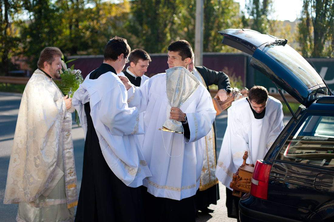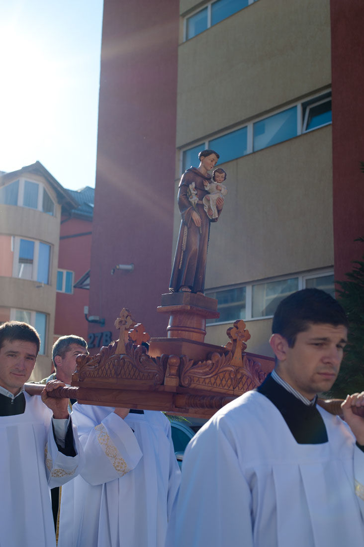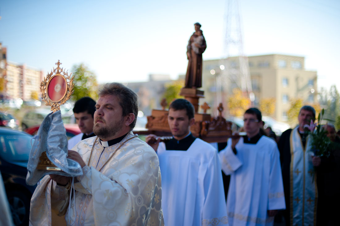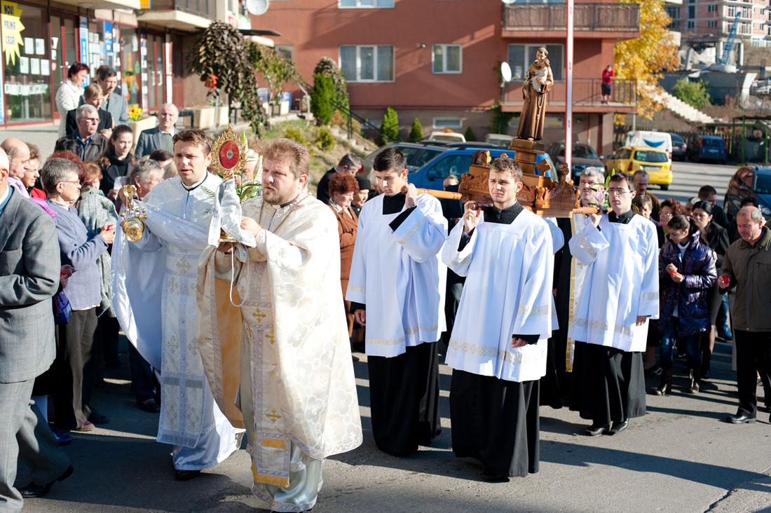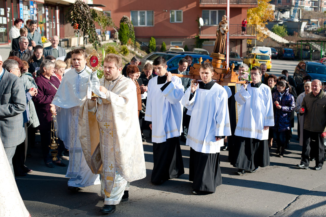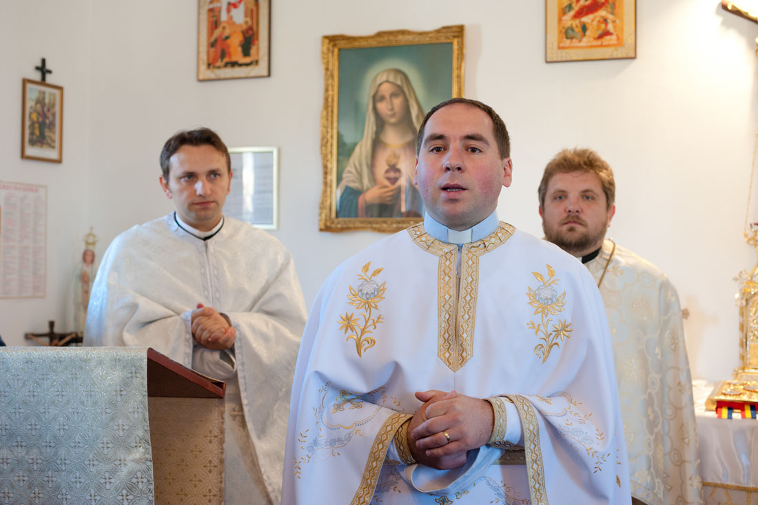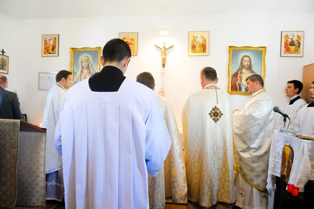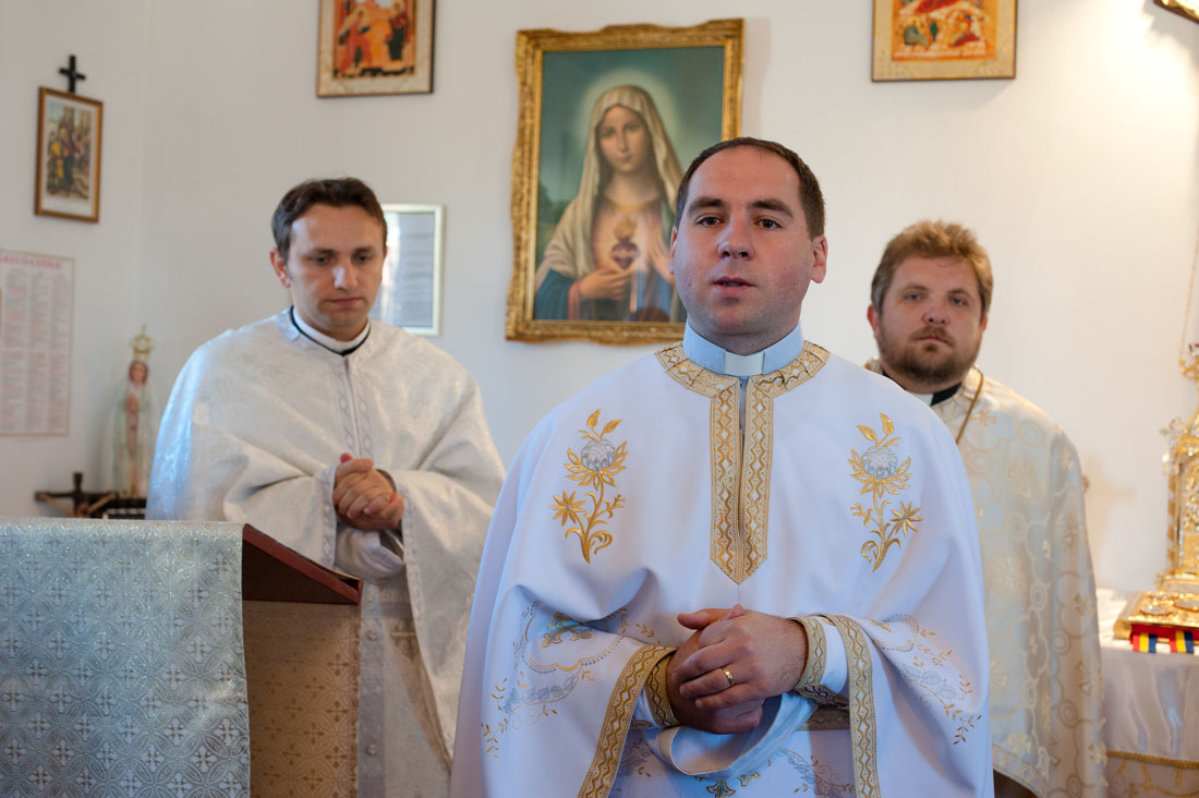 Ierarhul a fost întâmpinat în mod tradițional, cu pâine și sare, de pr. paroh Ioan Pașca, pr. Mircea Marțian, protopop de Cluj, pr. Marius Cerghizan, protopop de Someș, preoți din Cluj-Napoca și împrejurimi, autorități locale, membre ale Reuniunii Mariane parohiale – cu un efectiv mare și foarte activă în această parohie – mulți credincioși. Copiii, în port popular – straiul de sărbătoare al bunicilor și străbunicilor lor -, i-au oferit Episcopului flori și bucuria lor a adus lumină în sufletele celor care au luat parte la celebrare. După intrarea în procesiune în biserică, a fost celebrată Sfânta Liturghie, cu răspunsurile liturgice oferite de studenți ai Seminarului eparhial „Sf. Ioan Evanghelistul” din Cluj-Napoca. Au ajutat la celebrare dc. Ovidiu Lucian Marișca, cancelar eparhial, subdiaconii Romulus Iușan și Ionuț Mihu.
