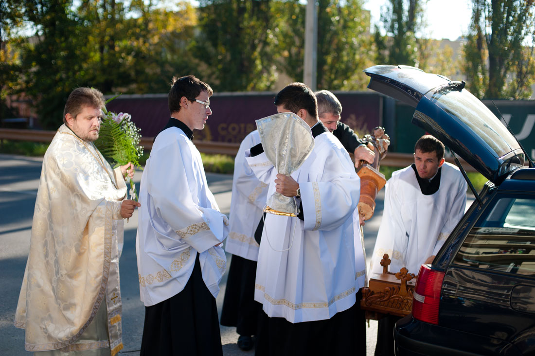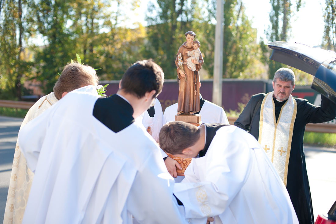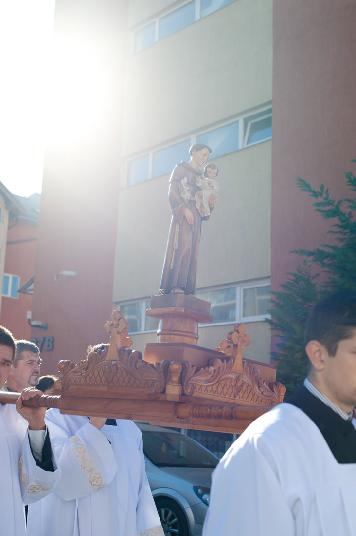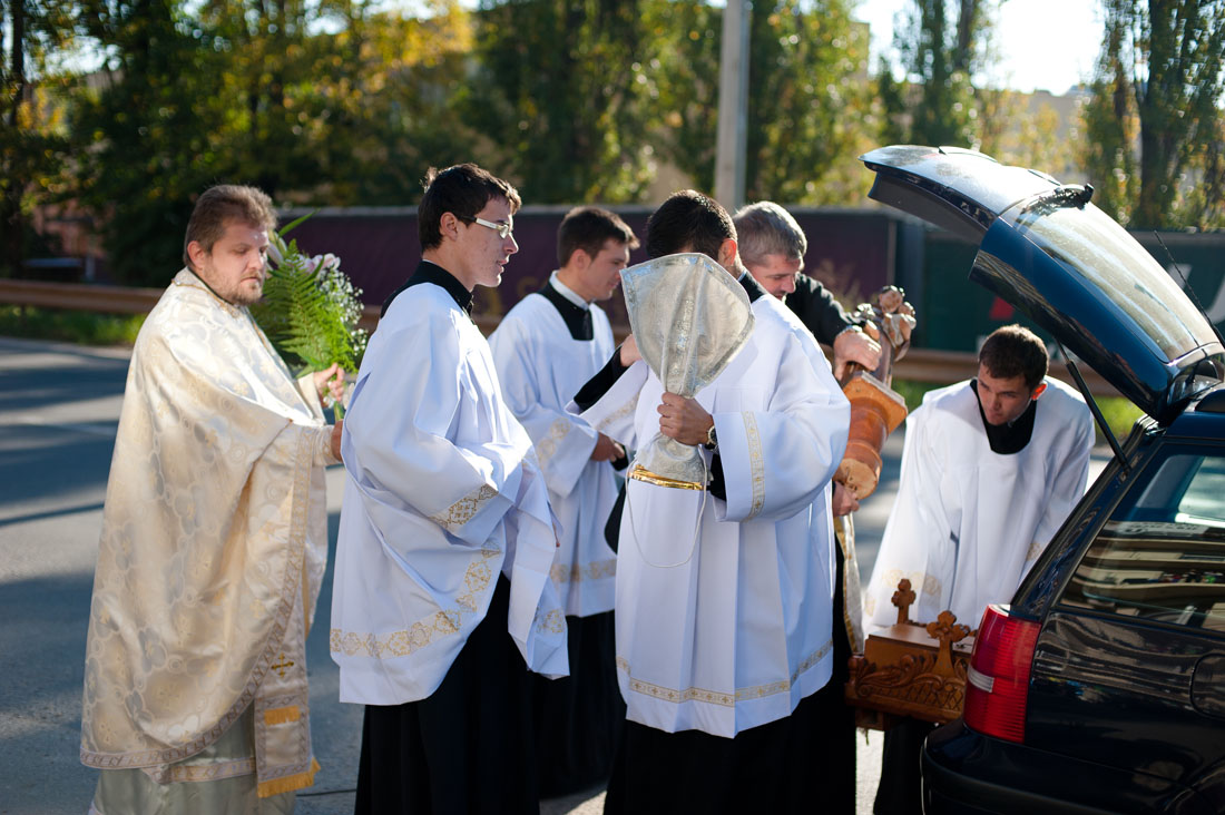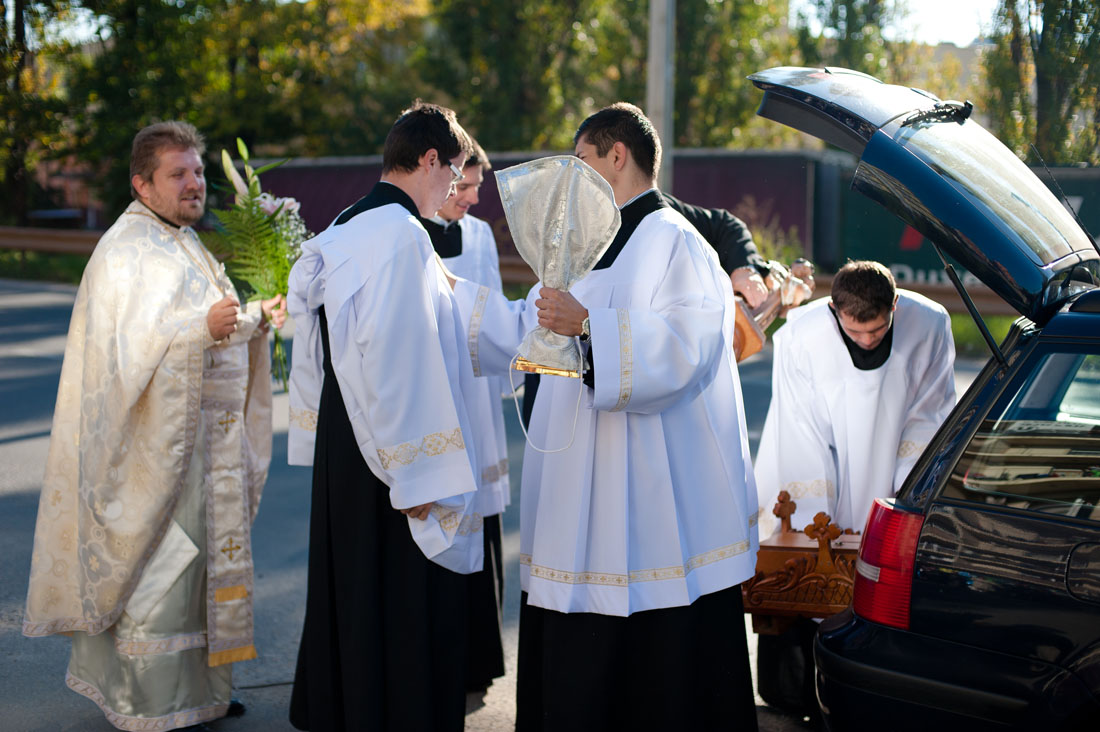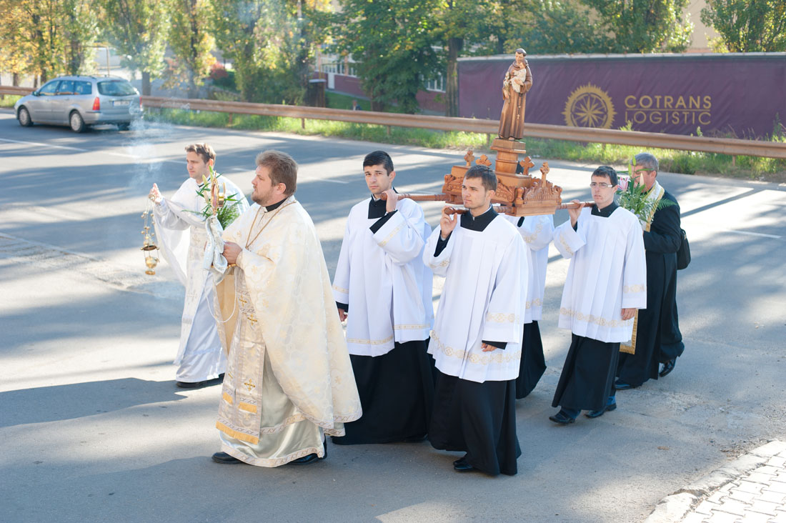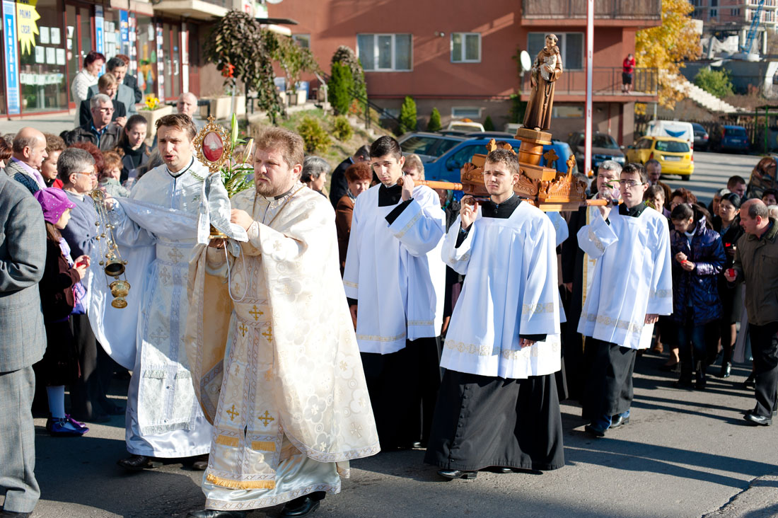 Ierarhul a fost întâmpinat în mod tradițional, cu pâine și sare, de pr. paroh Ioan Pașca, pr. Mircea Marțian, protopop de Cluj, pr. Marius Cerghizan, protopop de Someș, preoți din Cluj-Napoca și împrejurimi, autorități locale, membre ale Reuniunii Mariane parohiale – cu un efectiv mare și foarte activă în această parohie – mulți credincioși. Copiii, în port popular – straiul de sărbătoare al bunicilor și străbunicilor lor -, i-au oferit Episcopului flori și bucuria lor a adus lumină în sufletele celor care au luat parte la celebrare. După intrarea în procesiune în biserică, a fost celebrată Sfânta Liturghie, cu răspunsurile liturgice oferite de studenți ai Seminarului eparhial „Sf. Ioan Evanghelistul” din Cluj-Napoca. Au ajutat la celebrare dc. Ovidiu Lucian Marișca, cancelar eparhial, subdiaconii Romulus Iușan și Ionuț Mihu.