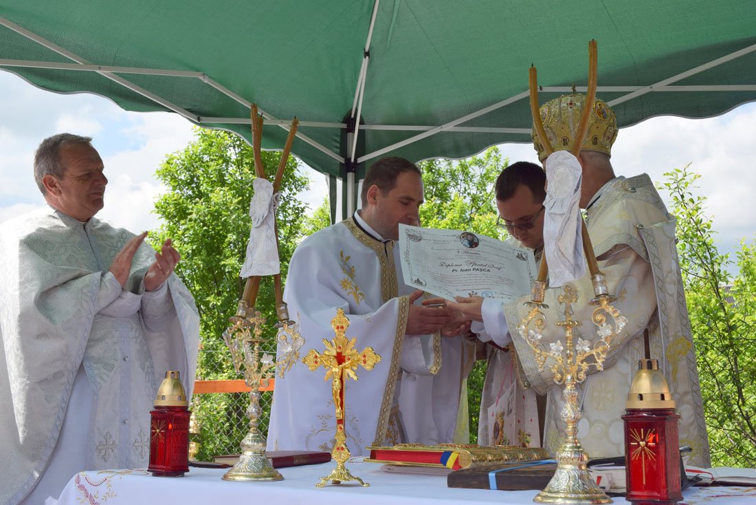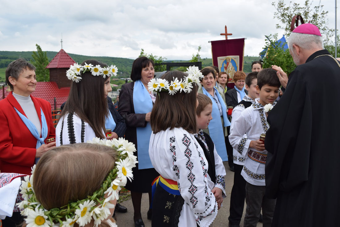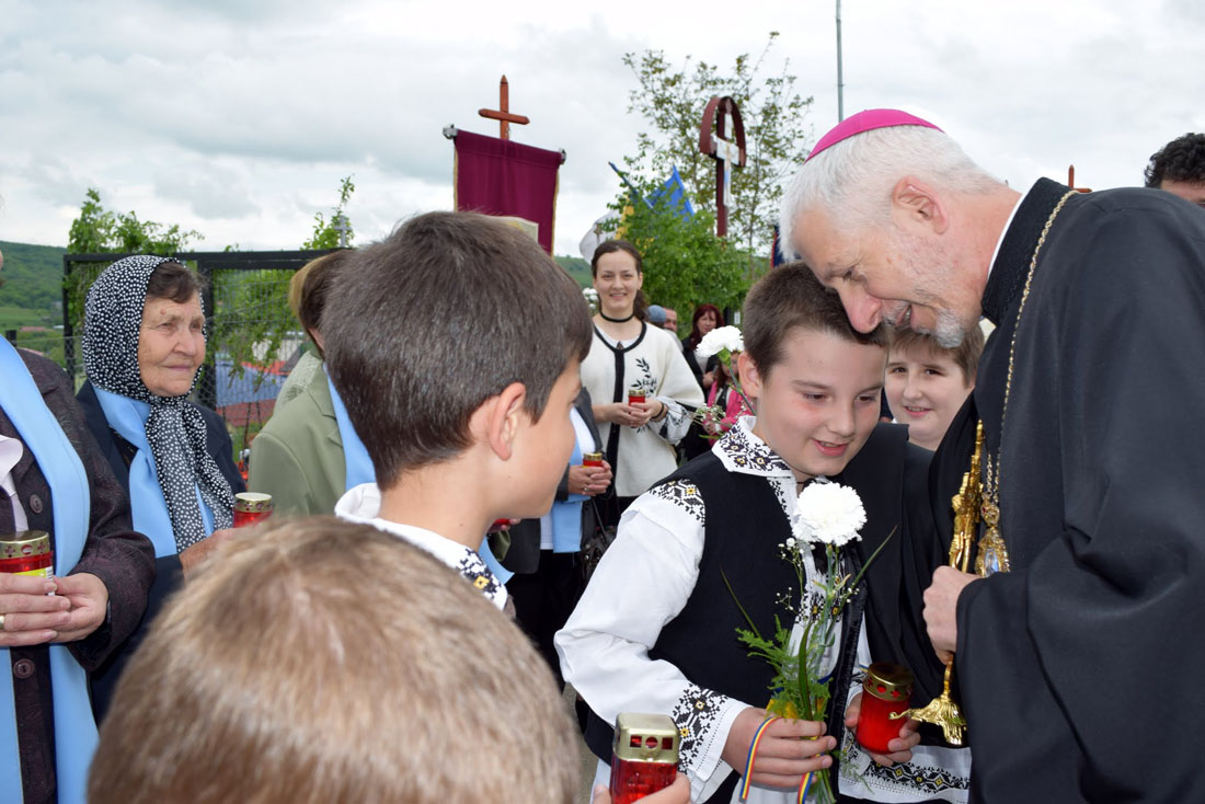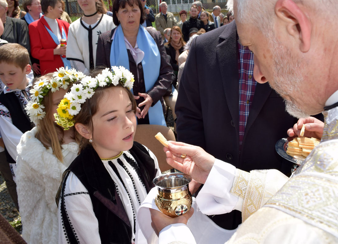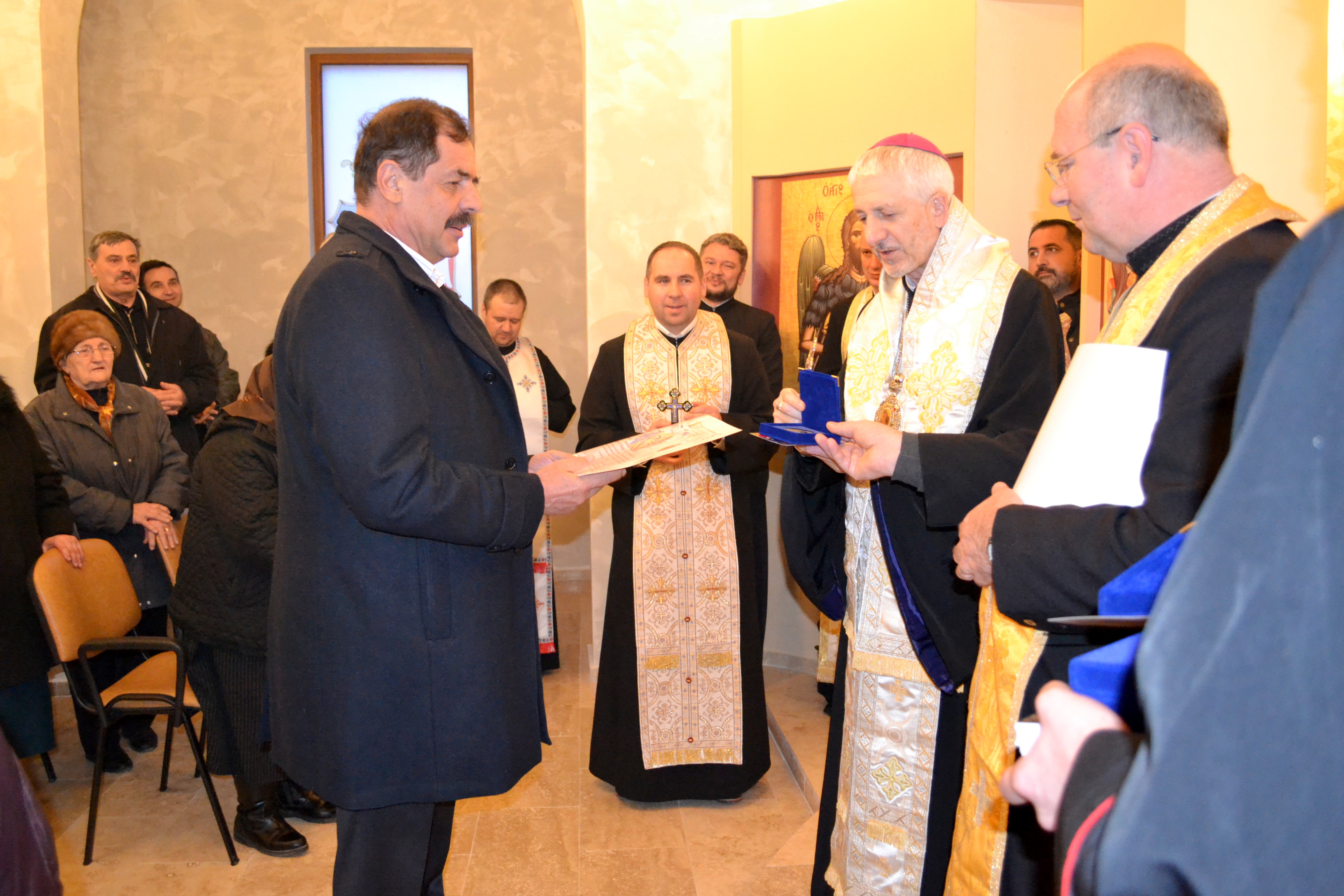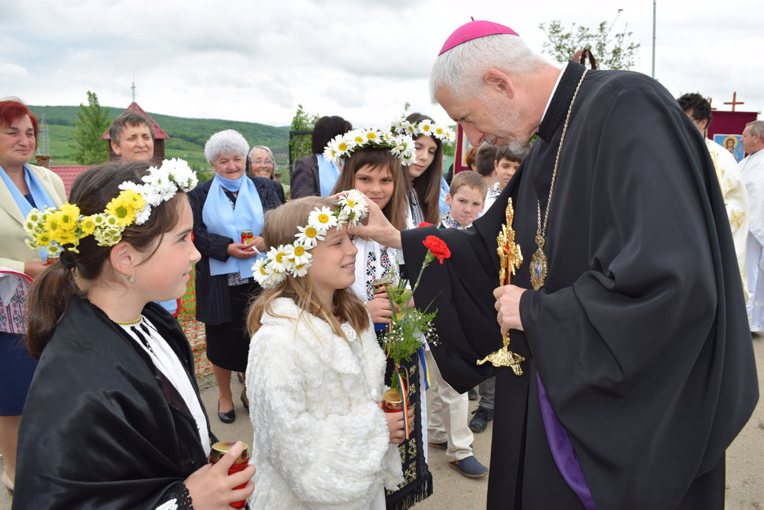 După Sfânta Liturghie, pr. Ioan Pașca și-a exprimat recunoștința pentru celebrarea sărbătorească și pentru prezența Păstorului Eparhiei de Cluj-Gherla, și a oferit Preasfinției Sale Claudiu, din partea comunității parohiale, câteva semne de mulțumire și amintire, între care, o candelă, „pentru a rămâne mereu făclii aprinse” și simbol pentru credință; de asemenea, „pentru că astăzi ați semănat sămânța curată, bună și sfântă în parohia noastră, v-am oferit și câteva spice de grâu, care simbolizează roadele pe care le vedem” – cei 12 copilași care au primit Prima Sfântă Împărtășanie. Un alt dar a fost un șirag al Sfântului Rozariu, în Biserica Catolică luna octombrie fiind și „luna Rozariului”. A mulțumit apoi tuturor: preoților, consiliului parohial, Reuniunii Mariane, autorităților locale, celor care s-au implicat în organizarea evenimentului, celor care au contribuit și sprijinit zidirea bisericii. Preasfinția Sa Claudiu a mulțumit pr. Ioan Pașca „pentru misiunea minunată pe care a făcut-o în această parohie, pentru biserica ridicată dar mai ales pentru bisericile pe care le-a ridicat în sufletele credincioșilor”. A mulțumit viceprimarului, consilierilor locali, tuturor celor prezenți. În continuare, copiilor le-au fost înmânate diplome de amintire de la Prima Sfântă Împărtășanie, și apoi pr. paroh Ioan Pașca a invitat la agapa fraternă pregătită cu generozitate pentru toți, prilej de întâlnire și bucurie în zi de sărbătoare.